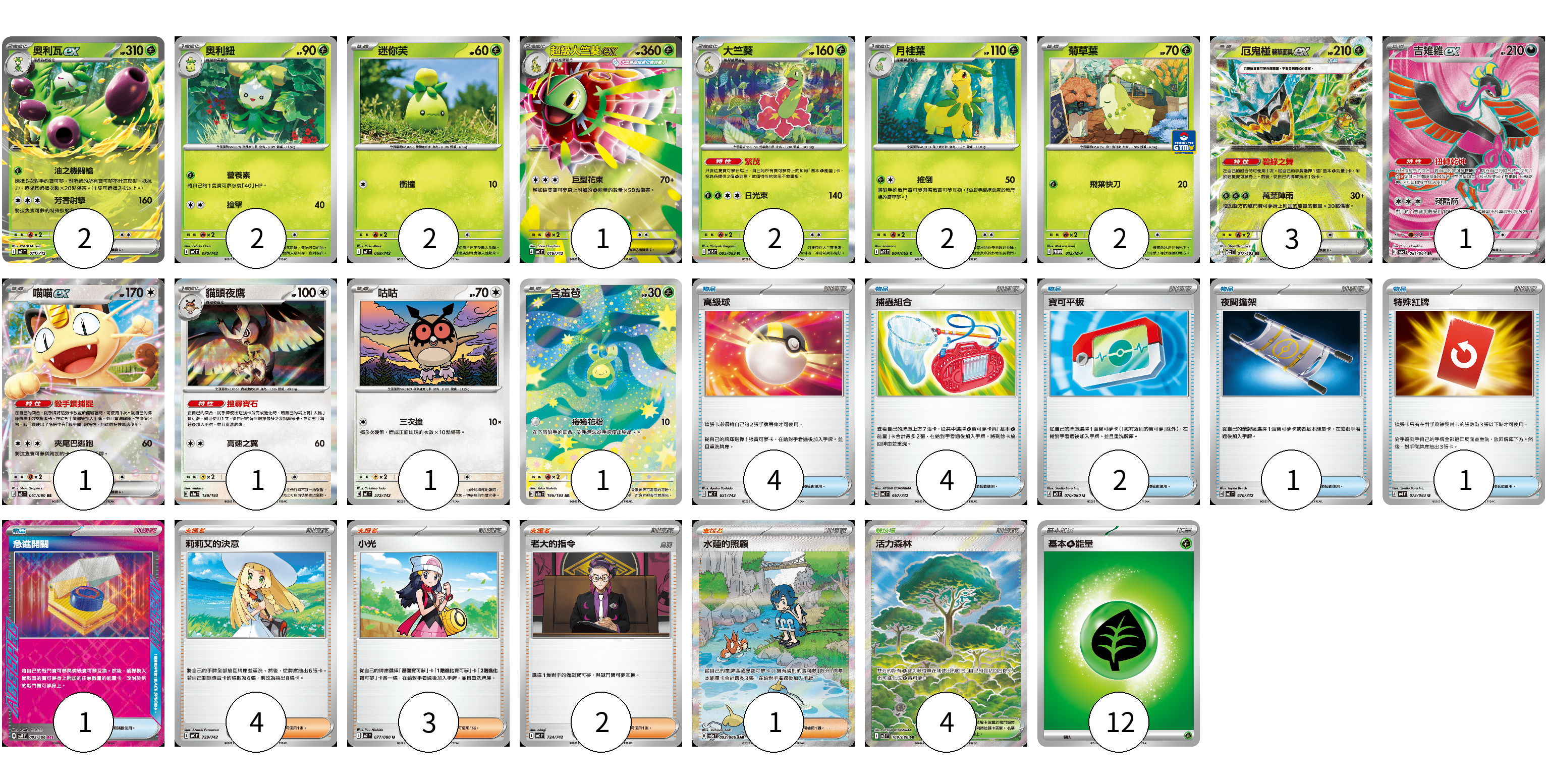牌組構築方案 以此牌組為基礎新構築牌組 顯示卡面 顯示列表 寶可夢卡(21) 2 2 2 1 2 2 2 3 1 1 1 1 1 物品卡(13) 4 4 2 1 1 1 支援者卡(10) 4 3 2 1 競技場卡(4) 4 能量卡(12) 12 寶可夢卡(21) 卡牌名稱 張數 卡牌名稱 張數 奧利瓦ex MC 071/742 02 奧利紐 MC 070/742 02 迷你芙 MC 069/742 02 超級大竺葵ex MC 018/742 01 大竺葵 M1S 005/063 02 月桂葉 M1S 004/063 02 菊草葉 M-P 012/M-P 02 厄鬼椪 碧草面具ex M2a 017/193 03 吉雉雞ex SV6a 081/064 01 喵喵ex M3 061/080 01 貓頭夜鷹 M2a 138/193 01 咕咕 MC 572/742 01 含羞苞 M2a 196/193 01 物品卡(13) 卡牌名稱 張數 卡牌名稱 張數 高級球 MC 651/742 04 捕蟲組合 MC 667/742 04 寶可平板 M3 070/080 02 夜間擔架 MC 670/742 01 特殊紅牌 M4 072/083 01 急進開關 SV8 095/106 01 支援者卡(10) 卡牌名稱 張數 卡牌名稱 張數 莉莉艾的決意 MC 729/742 04 小光 M2 077/080 03 老大的指令 MC 724/742 02 水蓮的照顧 SV5a 093/066 01 競技場卡(4) 卡牌名稱 張數 卡牌名稱 張數 活力森林 M3 109/080 04 能量卡(12) 卡牌名稱 張數 卡牌名稱 張數 基本【草】能量 MJ GRA 12 以此牌組為基礎新構築牌組 牌組編碼 WyMRSU-CYVDXG-GYyBWp copy 列印牌組單 牌組編碼已複製 分享至SNS