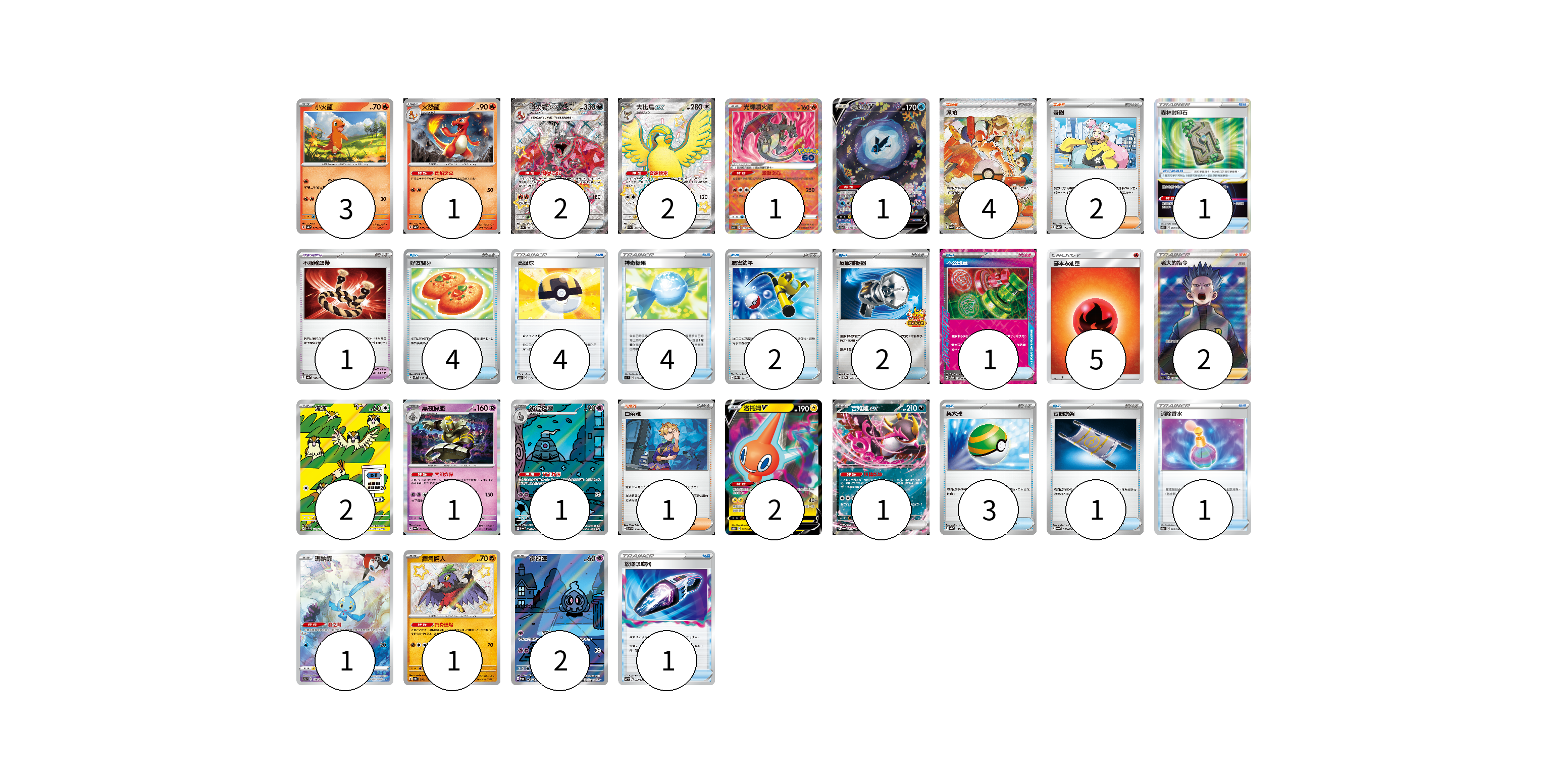牌組構築方案 以此牌組為基礎新構築牌組 顯示卡面 顯示列表 寶可夢卡(21) 3 1 2 2 1 1 2 1 1 2 1 1 1 2 寶可夢道具(2) 1 1 物品卡(23) 4 4 4 2 2 1 3 1 1 1 支援者卡(9) 4 2 2 1 能量卡(5) 5 寶可夢卡(21) 卡牌名稱 張數 卡牌名稱 張數 小火龍 SV4a 025/190 03 火恐龍 SV4a 026/190 01 噴火龍ex SV4a 331/190 02 大比鳥ex SV4a 335/190 02 光輝噴火龍 S10b 011/071 01 霓虹魚V S12a 216/172 01 波波 SV3 118/108 02 黑夜魔靈 SV6a 020/064 01 彷徨夜靈 SV6a 069/064 01 洛托姆V S11 037/100 02 吉雉雞ex SV6a 038/064 01 瑪納霏 S12a 178/172 01 摔角鷹人 SV4a 282/190 01 夜巡靈 SV6a 068/064 02 寶可夢道具(2) 卡牌名稱 張數 卡牌名稱 張數 森林封印石 S12 092/098 01 不服輸頭帶 SV4a 168/190 01 物品卡(23) 卡牌名稱 張數 卡牌名稱 張數 好友寶芬 SV5K 063/071 04 高級球 S12a 138/172 04 神奇糖果 SI 376/414 04 厲害釣竿 SVEM 011/020 02 反擊捕捉器 SV-P 083/SV-P 02 不公印章 SV5a 053/066 01 巢穴球 SV4a 159/190 03 夜間擔架 SV6a 056/064 01 消除香水 S9a 063/067 01 放逐吸塵器 SVF 023/038 01 支援者卡(9) 卡牌名稱 張數 卡牌名稱 張數 派帕 SV4a 353/190 04 奇樹 SV4a 174/190 02 老大的指令(赤日) S12a 250/172 02 白蕾雅 SV7 100/102 01 能量卡(5) 卡牌名稱 張數 卡牌名稱 張數 基本火能量 AS6D FIR 05 以此牌組為基礎新構築牌組 牌組編碼 XBApCE-vdtllm-isFtXR copy 列印牌組單 牌組編碼已複製 分享至SNS