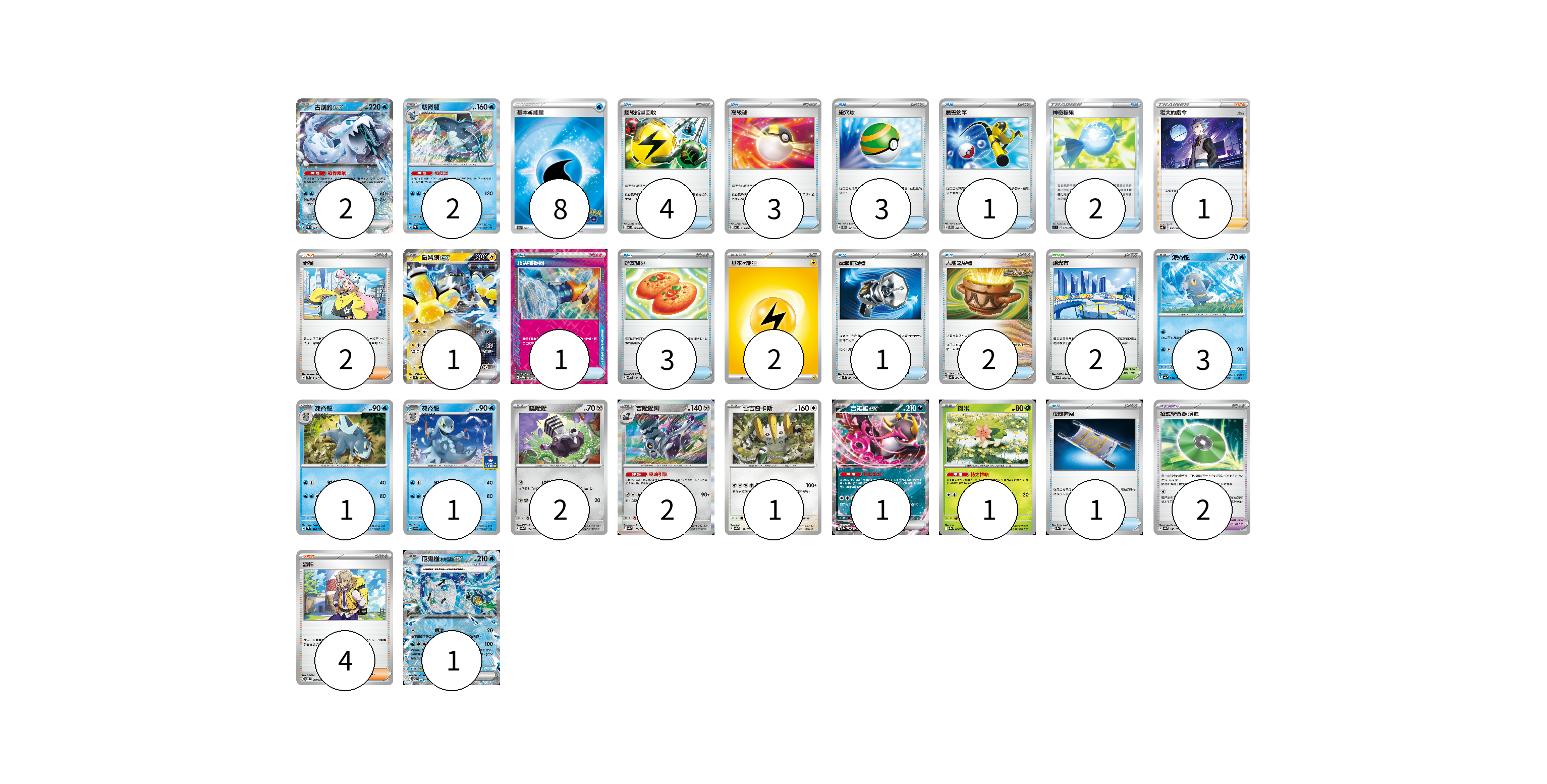 牌組構築方案 以此牌組為基礎新構築牌組 顯示卡面 顯示列表 寶可夢卡(19) 2 2 1 1 3 1 1 2 2 1 1 1 1 寶可夢道具(2) 2 物品卡(20) 4 3 3 2 1 3 1 2 1 支援者卡(7) 1 2 4 競技場卡(2) 2 能量卡(10) 8 2 寶可夢卡(19) 卡牌名稱 張數 卡牌名稱 張數 古劍豹ex SV2P 028/071 02 戟脊龍 SV2P 027/071 02 厲害釣竿 SVEL 010/020 01 鐵臂膀ex SV4M 027/066 01 涼脊龍 SV4a 051/190 03 凍脊龍 SV2P 026/071 01 凍脊龍 SV-P 031/SV-P 01 噗隆隆 SV8a 114/187 02 普隆隆姆 SV8a 115/187 02 雷吉奇卡斯 SV8a 132/187 01 吉雉雞ex SV8a 104/187 01 謝米 SV9a 006/063 01 厄鬼椪 水井面具ex SV6 038/101 01 寶可夢道具(2) 卡牌名稱 張數 卡牌名稱 張數 招式學習器 演進 SV8a 160/187 02 物品卡(20) 卡牌名稱 張數 卡牌名稱 張數 超級能量回收 SVEL 009/020 04 高級球 SVEL 012/020 03 巢穴球 SVEL 011/020 03 神奇糖果 SI 376/414 02 頂尖捕捉器 SV5M 062/071 01 好友寶芬 SV5K 063/071 03 反擊捕捉器 SV4M 059/066 01 大地之容器 SV4K 060/066 02 夜間擔架 SV8a 151/187 01 支援者卡(7) 卡牌名稱 張數 卡牌名稱 張數 老大的指令(赤日) SVB 024/028 01 奇樹 SV2D 069/071 02 派帕 SVOD 018/020 04 競技場卡(2) 卡牌名稱 張數 卡牌名稱 張數 釀光市 SV9 098/100 02 能量卡(10) 卡牌名稱 張數 卡牌名稱 張數 基本水能量 S10b WAT 08 基本【雷】能量 SVHM LIG 02 以此牌組為基礎新構築牌組 牌組編碼 XBcAti-HnxbKK-npVKaN copy 列印牌組單 牌組編碼已複製 分享至SNS