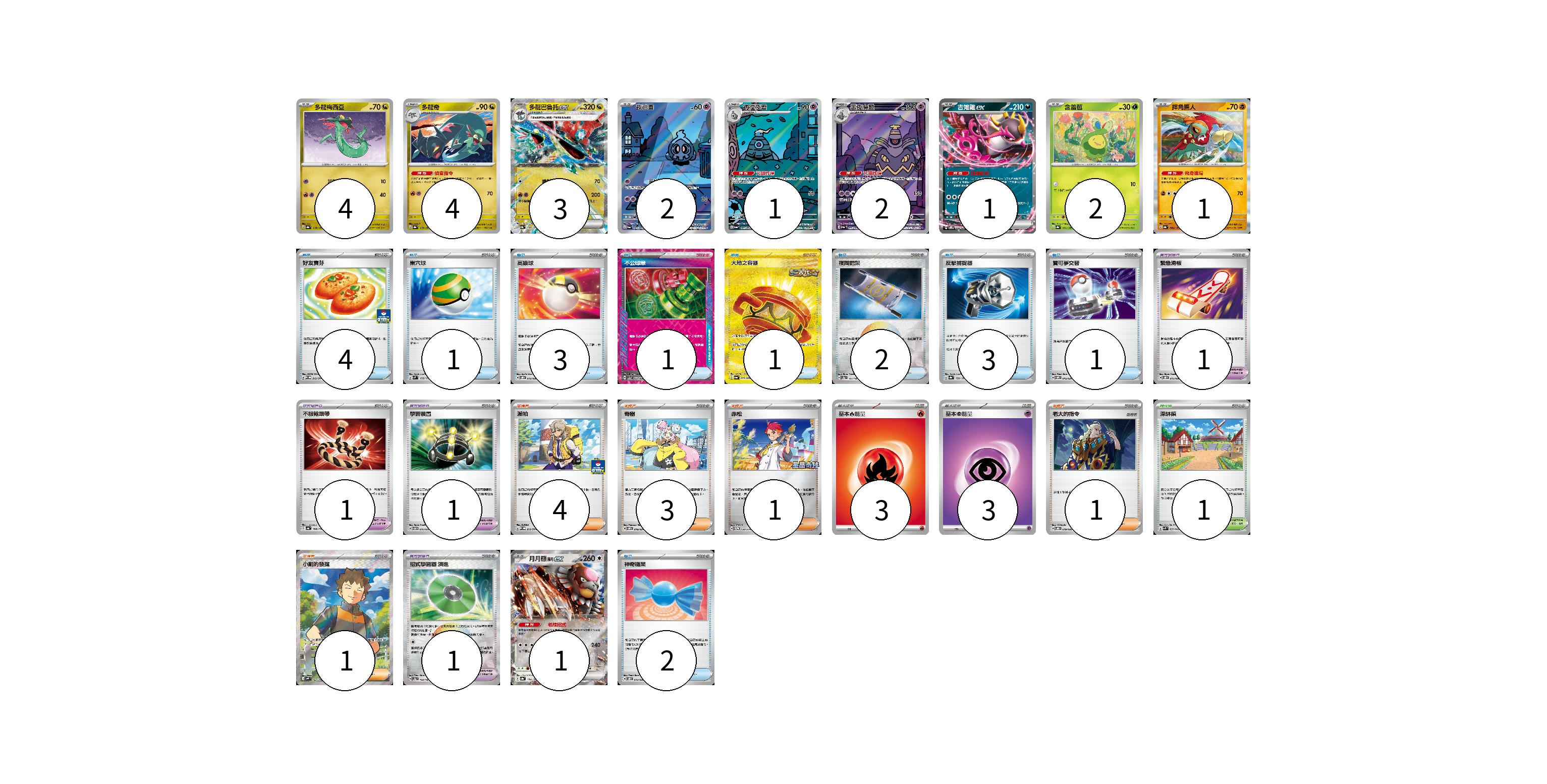 牌組構築方案 以此牌組為基礎新構築牌組 顯示卡面 顯示列表 寶可夢卡(21) 4 4 3 2 1 2 1 2 1 1 寶可夢道具(4) 1 1 1 1 物品卡(18) 4 1 3 1 1 2 3 1 2 支援者卡(10) 4 3 1 1 1 競技場卡(1) 1 能量卡(6) 3 3 寶可夢卡(21) 卡牌名稱 張數 卡牌名稱 張數 多龍梅西亞 SV8a 118/187 04 多龍奇 SV8a 119/187 04 多龍巴魯托ex SV8a 120/187 03 夜巡靈 SV6a 068/064 02 彷徨夜靈 SV6a 069/064 01 黑夜魔靈 SV6a 070/064 02 吉雉雞ex SVOM 009/021 01 含羞苞 SV8a 001/187 02 摔角鷹人 SV8a 084/187 01 月月熊 赫月ex SV8a 134/187 01 寶可夢道具(4) 卡牌名稱 張數 卡牌名稱 張數 緊急滑板 SVOD 015/020 01 不服輸頭帶 SV4a 168/190 01 學習裝置 SVTM 016/022 01 招式學習器 演進 SV8a 160/187 01 物品卡(18) 卡牌名稱 張數 卡牌名稱 張數 好友寶芬 SV-P 212/SV-P 04 巢穴球 SVM 133/175 01 高級球 SVOD 012/020 03 不公印章 SV5a 053/066 01 大地之容器 SV6a 093/064 01 夜間擔架 SV8a 151/187 02 反擊捕捉器 SV8a 139/187 03 寶可夢交替 SVOM 015/021 01 神奇糖果 SVOD 013/020 02 支援者卡(10) 卡牌名稱 張數 卡牌名稱 張數 派帕 SV-P 213/SV-P 04 奇樹 SVOM 018/021 03 赤松 SV-P 150/SV-P 01 老大的指令 SVOD 019/020 01 小剛的發掘 SV9 123/100 01 競技場卡(1) 卡牌名稱 張數 卡牌名稱 張數 深缽鎮 SVK 039/042 01 能量卡(6) 卡牌名稱 張數 卡牌名稱 張數 基本火能量 sv-p FIR 03 基本超能量 sv-p PSY 03 以此牌組為基礎新構築牌組 牌組編碼 XEVyNA-frNhbf-RAVUxs copy 列印牌組單 牌組編碼已複製 分享至SNS