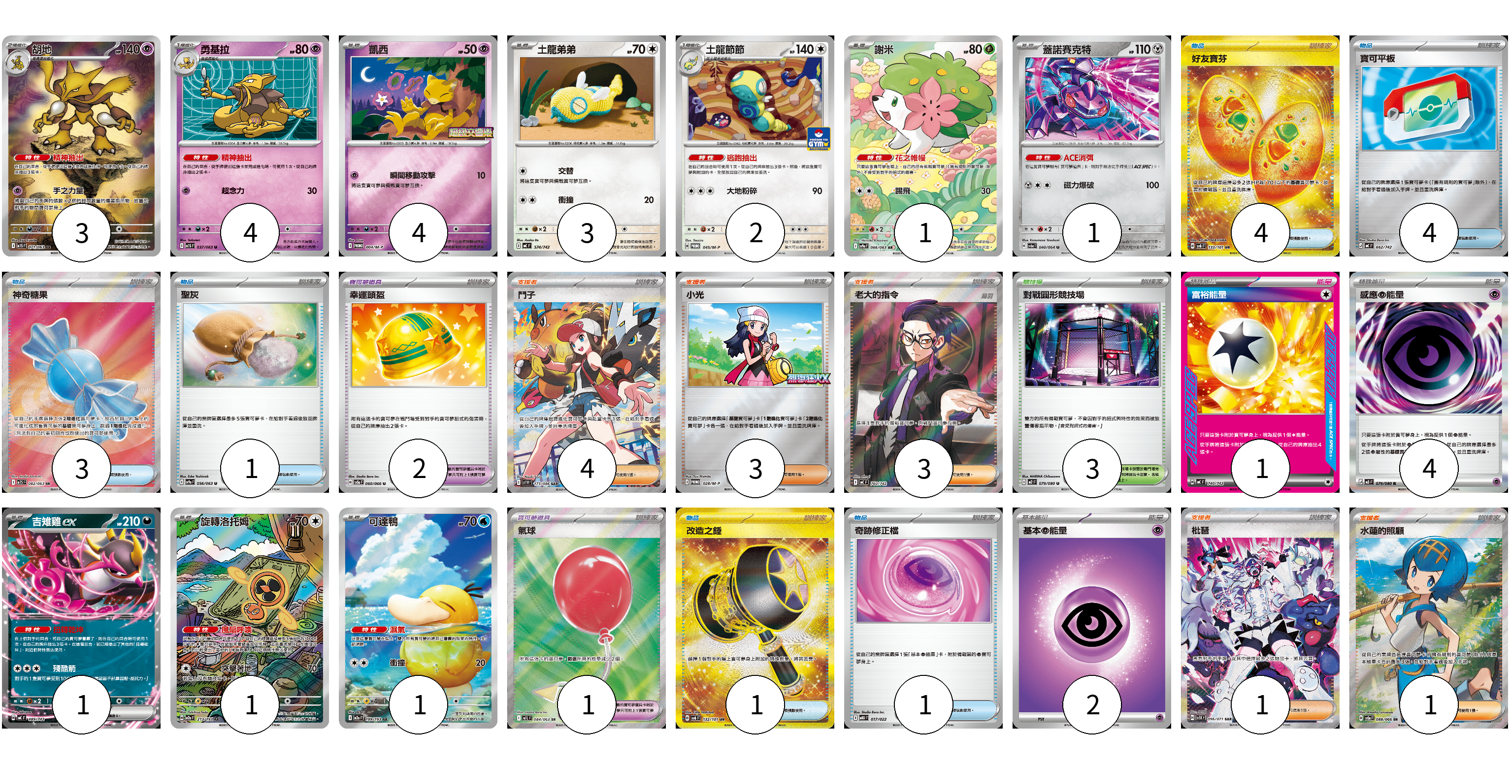 牌組構築方案 以此牌組為基礎新構築牌組 顯示卡面 顯示列表 寶可夢卡(21) 3 4 4 3 2 1 1 1 1 1 寶可夢道具(3) 2 1 物品卡(14) 4 4 3 1 1 1 支援者卡(12) 4 3 3 1 1 競技場卡(3) 3 能量卡(7) 1 4 2 寶可夢卡(21) 卡牌名稱 張數 卡牌名稱 張數 胡地 M1S 071/063 03 勇基拉 M1S 037/063 04 凱西 M-P 004/M-P 04 土龍弟弟 MC 574/742 03 土龍節節 M-P 045/M-P 02 謝米 SV9a 066/063 01 蓋諾賽克特 SV6a 040/064 01 吉雉雞ex MC 489/742 01 旋轉洛托姆 M2a 213/193 01 可達鴨 M2a 199/193 01 寶可夢道具(3) 卡牌名稱 張數 卡牌名稱 張數 幸運頭盔 SV5a 060/066 02 氣球 M1L 084/063 01 物品卡(14) 卡牌名稱 張數 卡牌名稱 張數 好友寶芬 SV6 133/101 04 寶可平板 MC 662/742 04 神奇糖果 M1S 082/063 03 聖灰 SV9a 056/063 01 改造之錘 SV6 132/101 01 奇跡修正檔 MBD 017/022 01 支援者卡(12) 卡牌名稱 張數 卡牌名稱 張數 鬥子 SV11W 173/086 04 小光 M-P 028/M-P 03 老大的指令(烏羽) MC 760/742 03 枇琶 SV5K 096/071 01 水蓮的照顧 SV5a 088/066 01 競技場卡(3) 卡牌名稱 張數 卡牌名稱 張數 對戰圓形競技場 M2 079/080 03 能量卡(7) 卡牌名稱 張數 卡牌名稱 張數 富裕能量 MC 740/742 01 感應【超】能量 M3 079/080 04 基本【超】能量 MBD PSY 02 以此牌組為基礎新構築牌組 牌組編碼 XEhSfU-kXyMhZ-LSPqlI copy 列印牌組單 牌組編碼已複製 分享至SNS