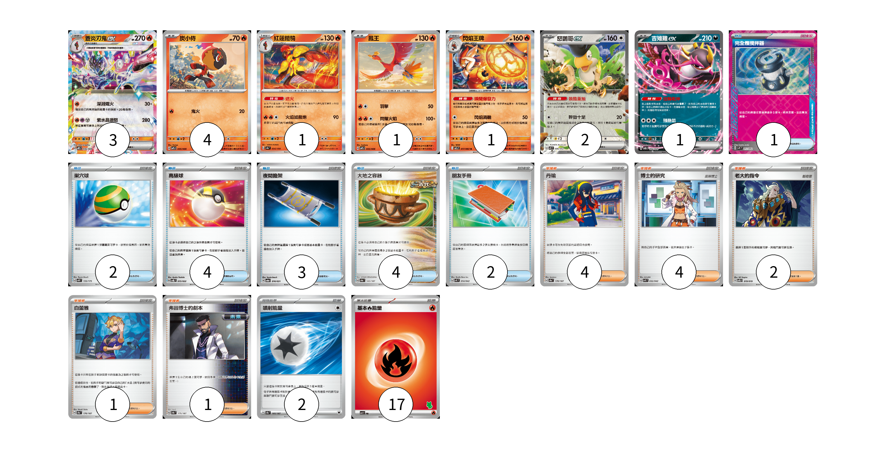 牌組構築方案 以此牌組為基礎新構築牌組 顯示卡面 顯示列表 寶可夢卡(13) 3 4 1 1 1 2 1 物品卡(16) 1 2 4 3 4 2 支援者卡(12) 4 4 2 1 1 能量卡(19) 2 17 寶可夢卡(13) 卡牌名稱 張數 卡牌名稱 張數 蒼炎刃鬼ex SVPS 006/008 03 炭小侍 SVPS 005/008 04 紅蓮鎧騎 SV4a 034/190 01 鳳王 SVPS 003/008 01 閃焰王牌 M1L 017/063 01 怒鸚哥ex SVK 006/042 02 吉雉雞ex SVOD 004/020 01 物品卡(16) 卡牌名稱 張數 卡牌名稱 張數 完全體攪拌器 SVK 017/042 01 巢穴球 SVM 133/175 02 高級球 SVQL 015/022 04 夜間擔架 SVOM 016/021 03 大地之容器 SV8a 143/187 04 朋友手冊 SVK 014/042 02 支援者卡(12) 卡牌名稱 張數 卡牌名稱 張數 丹瑜 SV8a 170/187 04 博士的研究 SVK 032/042 04 老大的指令 SVTG 019/019 02 白蕾雅 SV8a 176/187 01 弗圖博士的劇本 SV8a 175/187 01 能量卡(19) 卡牌名稱 張數 卡牌名稱 張數 噴射能量 SV8a 185/187 02 基本【火】能量 SVI FIR 17 以此牌組為基礎新構築牌組 牌組編碼 XGjKaA-DwmElY-YAHelG copy 列印牌組單 牌組編碼已複製 分享至SNS