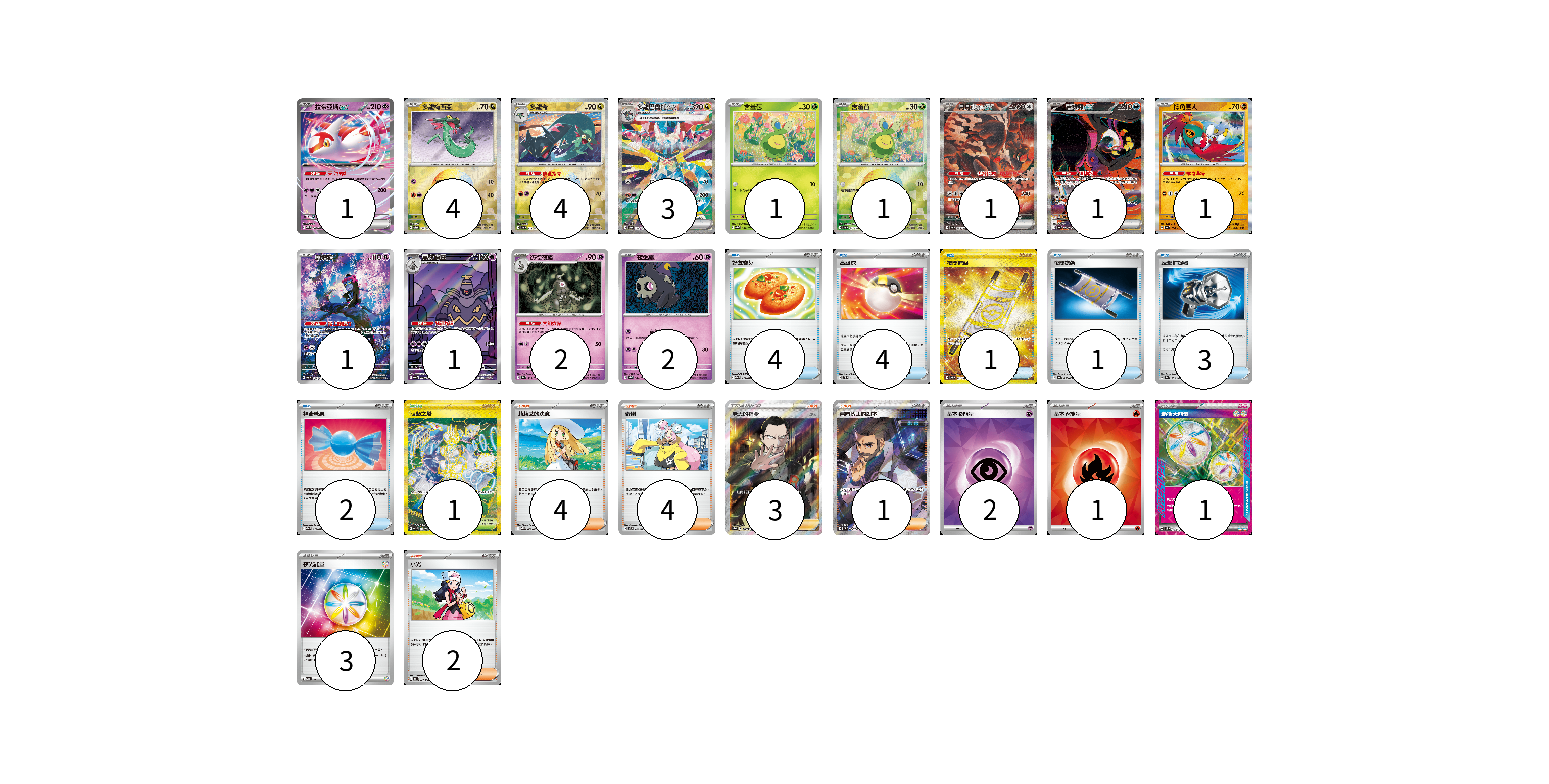 牌組構築方案 以此牌組為基礎新構築牌組 顯示卡面 顯示列表 寶可夢卡(23) 1 4 4 3 1 1 1 1 1 1 1 2 2 寶可夢道具(4) 4 物品卡(15) 4 4 1 1 3 2 支援者卡(10) 4 3 1 2 競技場卡(1) 1 能量卡(7) 2 1 1 3 寶可夢卡(23) 卡牌名稱 張數 卡牌名稱 張數 拉帝亞斯ex MBD 003/022 01 多龍梅西亞 SV8a 118/187 04 多龍奇 SV8a 119/187 04 多龍巴魯托ex SV8a 221/187 03 含羞苞 SV8a 001/187 01 含羞苞 SV8a 001/187 01 月月熊 赫月ex SV8a 225/187 01 吉雉雞ex SV6a 089/064 01 摔角鷹人 SV4a 106/190 01 願增猿 SV6 107/101 01 黑夜魔靈 SV6a 070/064 01 彷徨夜靈 SV8a 065/187 02 夜巡靈 SV8a 064/187 02 寶可夢道具(4) 卡牌名稱 張數 卡牌名稱 張數 奇樹 SVTL 018/021 04 物品卡(15) 卡牌名稱 張數 卡牌名稱 張數 好友寶芬 MBG 011/022 04 高級球 SVTL 012/021 04 夜間擔架 SV8 137/106 01 夜間擔架 SV6a 056/064 01 反擊捕捉器 SV8a 139/187 03 神奇糖果 MBG 013/022 02 支援者卡(10) 卡牌名稱 張數 卡牌名稱 張數 莉莉艾的決意 M1L 062/063 04 老大的指令(坂木) SC1b 170/153 03 弗圖博士的劇本 SV4M 086/066 01 小光 M2 077/080 02 競技場卡(1) 卡牌名稱 張數 卡牌名稱 張數 阻礙之塔 SV10 132/098 01 能量卡(7) 卡牌名稱 張數 卡牌名稱 張數 基本【超】能量 SVOD PSY 02 基本【火】能量 SVQL FIR 01 新衝天能量 SV5K 071/071 01 夜光能量 SV4a 190/190 03 以此牌組為基礎新構築牌組 牌組編碼 XHtgrR-zBJRwI-yGnznd copy 列印牌組單 牌組編碼已複製 分享至SNS
