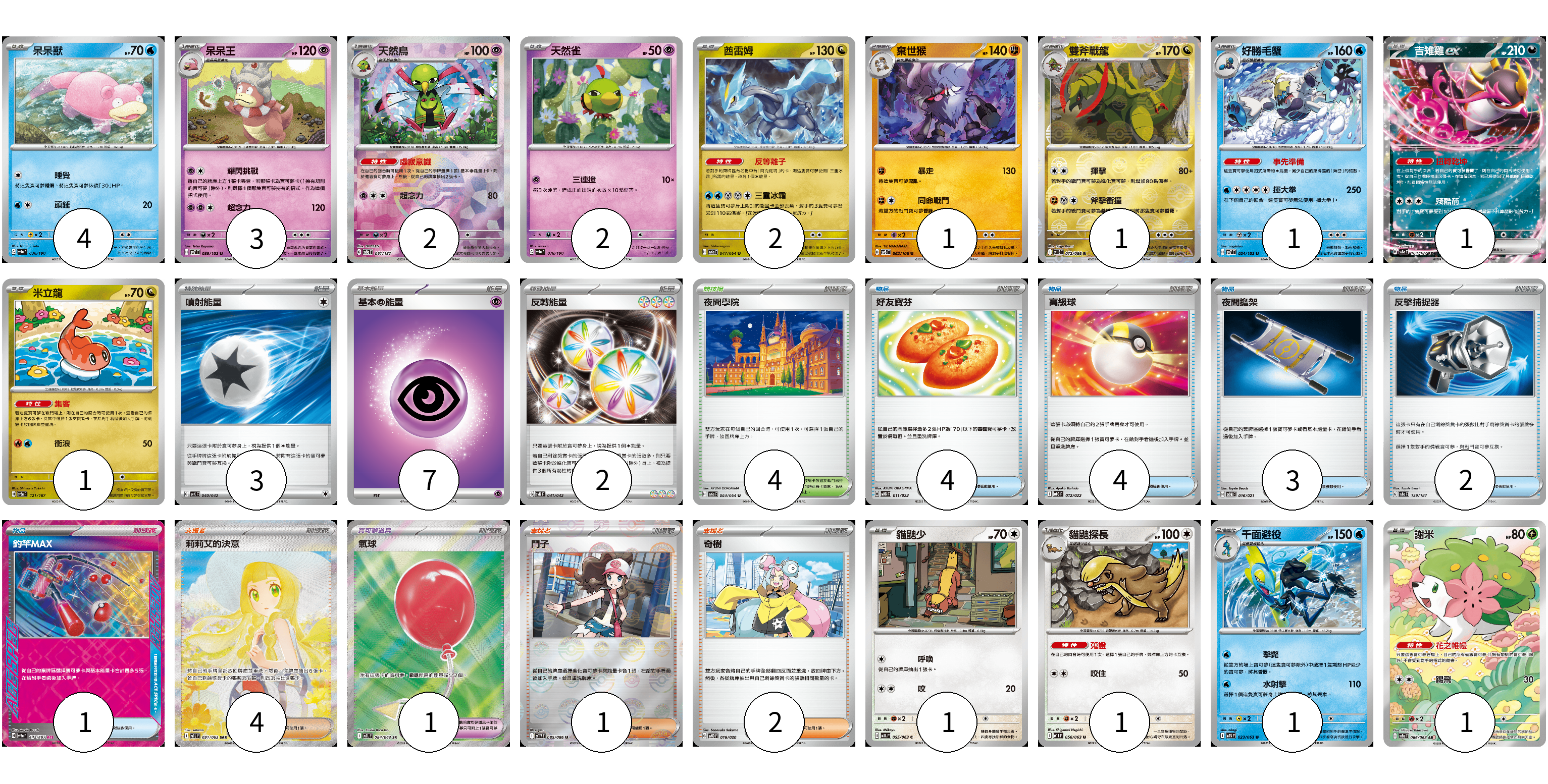 牌組構築方案 以此牌組為基礎新構築牌組 顯示卡面 顯示列表 寶可夢卡(22) 4 3 2 2 2 1 1 1 1 1 1 1 1 1 寶可夢道具(1) 1 物品卡(14) 4 4 3 2 1 支援者卡(7) 4 1 2 競技場卡(4) 4 能量卡(12) 3 7 2 寶可夢卡(22) 卡牌名稱 張數 卡牌名稱 張數 呆呆獸 SV4a 036/190 04 呆呆王 SV7 039/102 03 天然鳥 SV8a 061/187 02 天然雀 SV4a 078/190 02 酋雷姆 SV6a 047/064 02 棄世猴 SV8 062/106 01 雙斧戰龍 SV11B 072/086 01 好勝毛蟹 SV7 024/102 01 吉雉雞ex SV8a 104/187 01 米立龍 SV8a 121/187 01 貓鼬少 M1L 055/063 01 貓鼬探長 M1L 056/063 01 千面避役 M1S 023/063 01 謝米 SV9a 066/063 01 寶可夢道具(1) 卡牌名稱 張數 卡牌名稱 張數 氣球 M1L 084/063 01 物品卡(14) 卡牌名稱 張數 卡牌名稱 張數 好友寶芬 MBG 011/022 04 高級球 MBG 012/022 04 夜間擔架 SVOM 016/021 03 反擊捕捉器 SV8a 139/187 02 釣竿MAX SV8a 142/187 01 支援者卡(7) 卡牌名稱 張數 卡牌名稱 張數 莉莉艾的決意 M1L 091/063 04 鬥子 SV11W 085/086 01 奇樹 SVOD 016/020 02 競技場卡(4) 卡牌名稱 張數 卡牌名稱 張數 夜間學院 SV6a 064/064 04 能量卡(12) 卡牌名稱 張數 卡牌名稱 張數 噴射能量 SVK 040/042 03 基本【超】能量 M-P PSY 07 反轉能量 SVK 041/042 02 以此牌組為基礎新構築牌組 牌組編碼 XJDuHT-JpLipO-mRGebM copy 列印牌組單 牌組編碼已複製 分享至SNS
