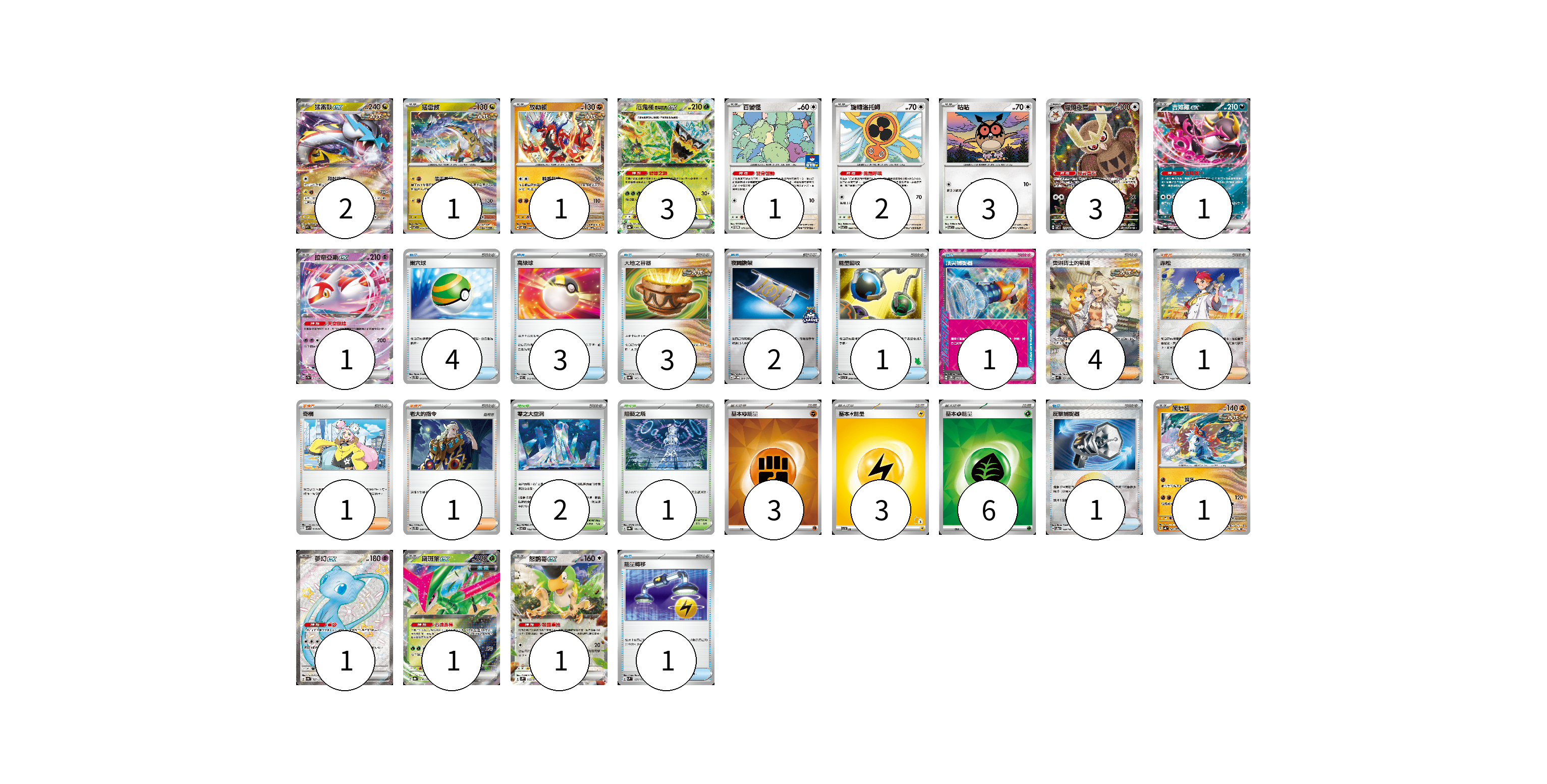 牌組構築方案 以此牌組為基礎新構築牌組 顯示卡面 顯示列表 寶可夢卡(22) 2 1 1 3 1 2 3 3 1 1 1 1 1 1 物品卡(16) 4 3 3 2 1 1 1 1 支援者卡(7) 4 1 1 1 競技場卡(3) 2 1 能量卡(12) 3 3 6 寶可夢卡(22) 卡牌名稱 張數 卡牌名稱 張數 猛雷鼓ex SV5K 053/071 02 猛雷鼓 SV7 075/102 01 故勒頓 SV8 069/106 01 厄鬼椪 碧草面具ex SV8a 020/187 03 百變怪 SV-P 111/SV-P 01 旋轉洛托姆 SV7 080/102 02 咕咕 SV7 076/102 03 貓頭夜鷹 SV7 114/102 03 吉雉雞ex SV6a 038/064 01 拉帝亞斯ex SV7a 019/064 01 爬地翅 SV4K 041/066 01 夢幻ex SV4a 327/190 01 鐵斑葉ex SV8a 016/187 01 怒鸚哥ex SV2P 065/071 01 物品卡(16) 卡牌名稱 張數 卡牌名稱 張數 巢穴球 SVTS 013/022 04 高級球 SVEL 012/020 03 大地之容器 SV8a 143/187 03 夜間擔架 SV-P 204/SV-P 02 能量回收 SVI 049/066 01 頂尖捕捉器 SV5M 062/071 01 反擊捕捉器 SV8a 139/187 01 能量轉移 SVM 127/175 01 支援者卡(7) 卡牌名稱 張數 卡牌名稱 張數 奧琳博士的氣魄 SV4K 091/066 04 赤松 SV8a 163/187 01 奇樹 SVHM 018/022 01 老大的指令 SVTS 020/022 01 競技場卡(3) 卡牌名稱 張數 卡牌名稱 張數 零之大空洞 SV7 102/102 02 阻礙之塔 SV8a 181/187 01 能量卡(12) 卡牌名稱 張數 卡牌名稱 張數 基本【鬥】能量 SVK FIG 03 基本【雷】能量 SVI LIG 03 基本【草】能量 SVK GRA 06 以此牌組為基礎新構築牌組 牌組編碼 XJjRtU-mbuadq-JYFISB copy 列印牌組單 牌組編碼已複製 分享至SNS