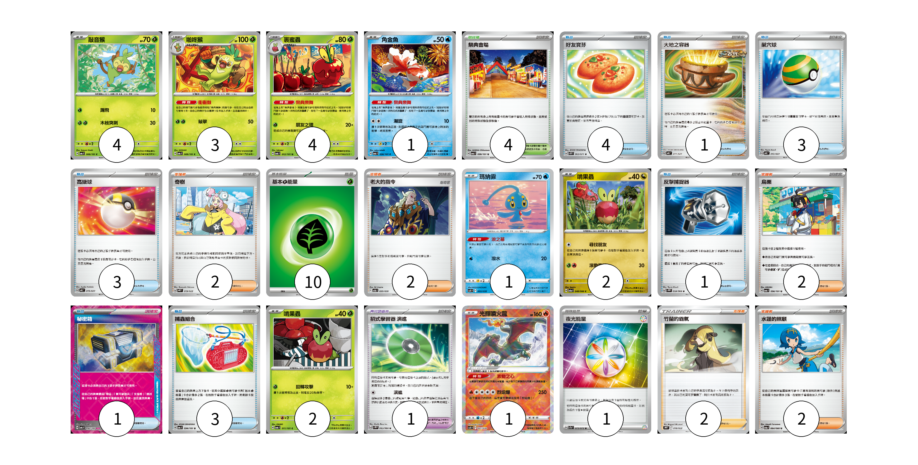 牌組構築方案 以此牌組為基礎新構築牌組 顯示卡面 顯示列表 寶可夢卡(18) 4 3 4 1 1 2 2 1 寶可夢道具(1) 1 物品卡(16) 4 1 3 3 1 1 3 支援者卡(10) 2 2 2 2 2 競技場卡(4) 4 能量卡(11) 10 1 寶可夢卡(18) 卡牌名稱 張數 卡牌名稱 張數 敲音猴 SV6 008/101 04 啪咚猴 SV6 009/101 03 裹蜜蟲 SV6 012/101 04 角金魚 SV6 026/101 01 瑪納霏 SVF 003/038 01 啃果蟲 SV5a 048/066 02 啃果蟲 SV6 011/101 02 光輝噴火龍 SVF 001/038 01 寶可夢道具(1) 卡牌名稱 張數 卡牌名稱 張數 招式學習器 演進 SV4M 063/066 01 物品卡(16) 卡牌名稱 張數 卡牌名稱 張數 好友寶芬 SV5K 063/071 04 大地之容器 SVHK 011/022 01 巢穴球 SVHK 012/022 03 高級球 SVHK 013/022 03 反擊捕捉器 SV4M 059/066 01 秘密箱 SV6 092/101 01 捕蟲組合 SV6 094/101 03 支援者卡(10) 卡牌名稱 張數 卡牌名稱 張數 奇樹 SVHK 019/022 02 老大的指令 SVEM 020/020 02 烏栗 SV6 096/101 02 竹蘭的霸氣 SVHK 018/022 02 水蓮的照顧 SV5a 064/066 02 競技場卡(4) 卡牌名稱 張數 卡牌名稱 張數 祭典會場 SV6 099/101 04 能量卡(11) 卡牌名稱 張數 卡牌名稱 張數 基本【草】能量 SVAM GRA 10 夜光能量 SV1a 073/073 01 以此牌組為基礎新構築牌組 牌組編碼 XLVFDJ-sGgSkW-uqKtiP copy 列印牌組單 牌組編碼已複製 分享至SNS