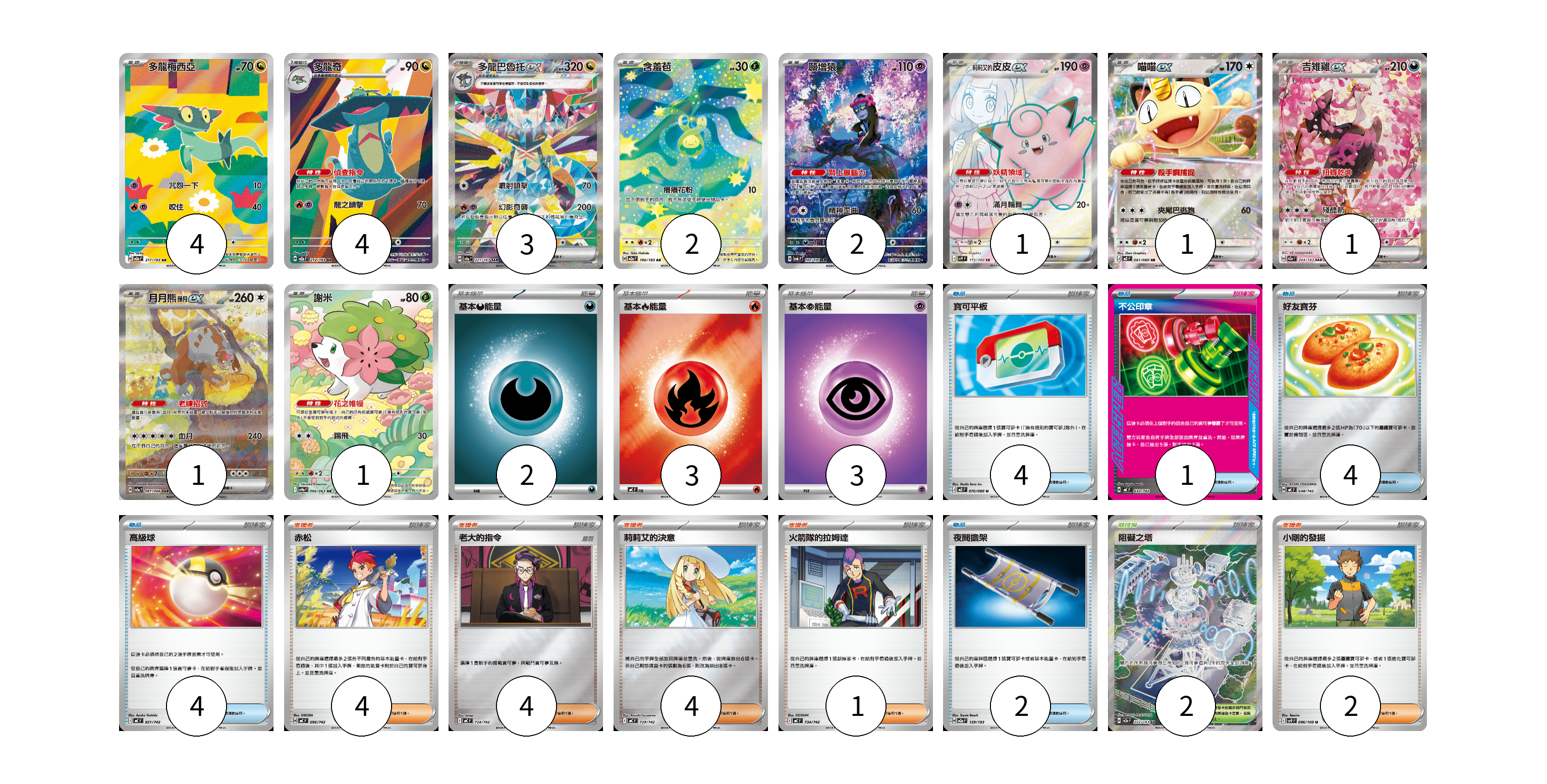 牌組構築方案 以此牌組為基礎新構築牌組 顯示卡面 顯示列表 寶可夢卡(20) 4 4 3 2 2 1 1 1 1 1 物品卡(15) 4 1 4 4 2 支援者卡(15) 4 4 4 1 2 競技場卡(2) 2 能量卡(8) 2 3 3 寶可夢卡(20) 卡牌名稱 張數 卡牌名稱 張數 多龍梅西亞 M2a 211/193 04 多龍奇 M2a 212/193 04 多龍巴魯托ex SV8a 221/187 03 含羞苞 M2a 196/193 02 願增猿 SV6 107/101 02 莉莉艾的皮皮ex SV9 115/100 01 喵喵ex M3 061/080 01 吉雉雞ex M2a 244/193 01 月月熊 赫月 ex SV5a 091/066 01 謝米 SV9a 066/063 01 物品卡(15) 卡牌名稱 張數 卡牌名稱 張數 寶可平板 M3 070/080 04 不公印章 MC 633/742 01 好友寶芬 MC 648/742 04 高級球 MC 651/742 04 夜間擔架 M2a 159/193 02 支援者卡(15) 卡牌名稱 張數 卡牌名稱 張數 赤松 MC 696/742 04 老大的指令 MC 724/742 04 莉莉艾的決意 MC 729/742 04 火箭隊的拉姆達 MC 734/742 01 小剛的發掘 SV9 096/100 02 競技場卡(2) 卡牌名稱 張數 卡牌名稱 張數 阻礙之塔 M2a 222/193 02 能量卡(8) 卡牌名稱 張數 卡牌名稱 張數 基本【惡】能量 MC DAR 02 基本【火】能量 MC FIR 03 基本【超】能量 MBD PSY 03 以此牌組為基礎新構築牌組 牌組編碼 XMERVf-VXOLZo-MTstRl copy 列印牌組單 牌組編碼已複製 分享至SNS