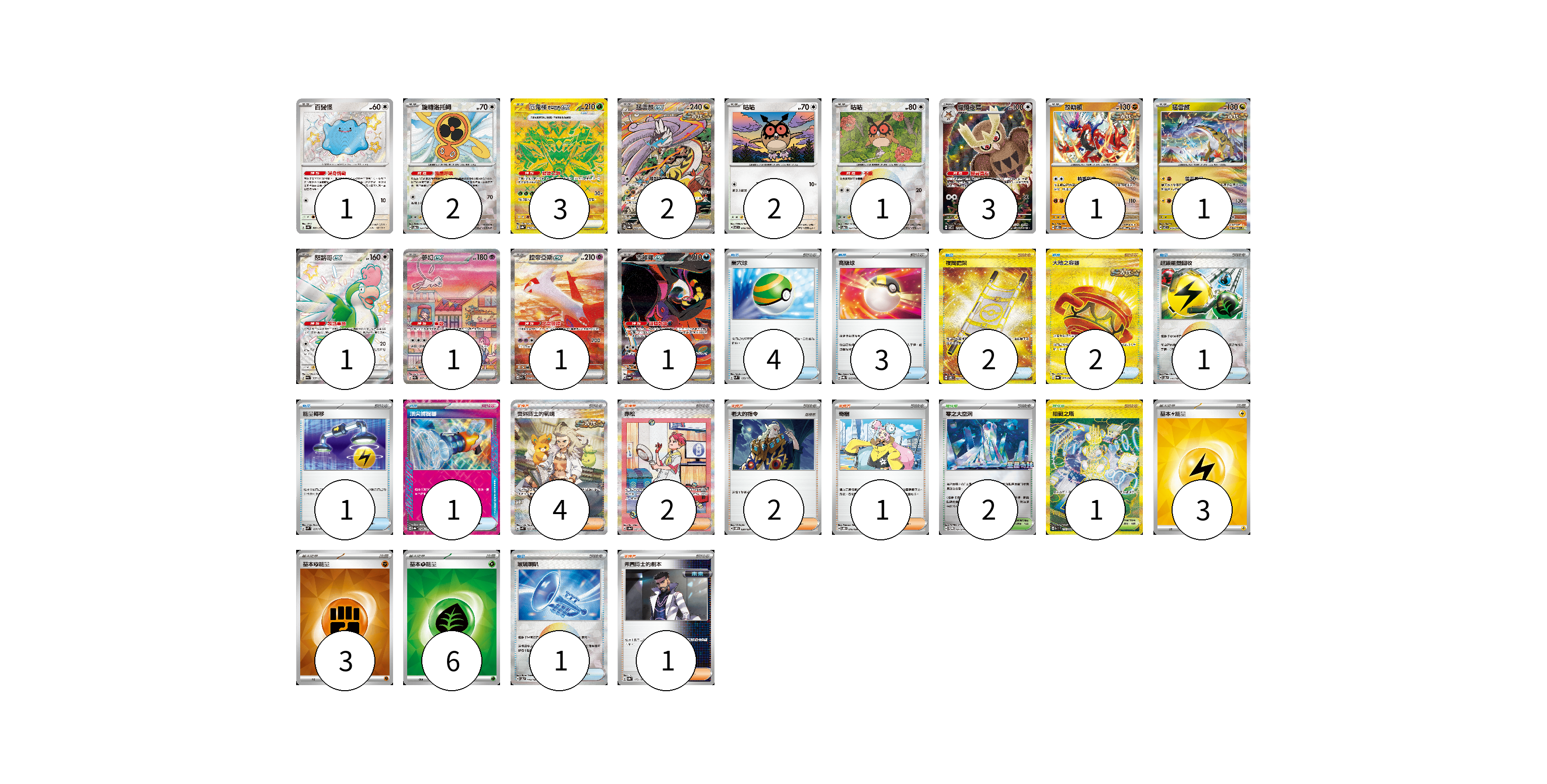 牌組構築方案 以此牌組為基礎新構築牌組 顯示卡面 顯示列表 寶可夢卡(20) 1 2 3 2 2 1 3 1 1 1 1 1 1 物品卡(15) 4 3 2 2 1 1 1 1 支援者卡(10) 4 2 2 1 1 競技場卡(3) 2 1 能量卡(12) 3 3 6 寶可夢卡(20) 卡牌名稱 張數 卡牌名稱 張數 百變怪 SV4a 309/190 01 旋轉洛托姆 SV8a 131/187 02 厄鬼椪 碧草面具ex SV8a 234/187 03 猛雷鼓ex SV8a 222/187 02 咕咕 SV7 076/102 02 咕咕 SV8a 127/187 01 貓頭夜鷹 SV7 114/102 03 故勒頓 SV8 069/106 01 猛雷鼓 SV7 075/102 01 怒鸚哥ex SV4a 337/190 01 夢幻ex SV2a 205/165 01 拉帝亞斯ex SV7a 087/064 01 吉雉雞ex SV6a 089/064 01 物品卡(15) 卡牌名稱 張數 卡牌名稱 張數 巢穴球 SVM 133/175 04 高級球 SVQL 015/022 03 夜間擔架 SV8 137/106 02 大地之容器 SV6a 093/064 02 超級能量回收 SV8a 141/187 01 能量轉移 SVM 127/175 01 頂尖捕捉器 SV8a 148/187 01 玻璃喇叭 SV8a 140/187 01 支援者卡(10) 卡牌名稱 張數 卡牌名稱 張數 奧琳博士的氣魄 SV4K 091/066 04 赤松 SV8a 227/187 02 老大的指令 SVOM 020/021 02 奇樹 SVOD 016/020 01 弗圖博士的劇本 SV8a 175/187 01 競技場卡(3) 卡牌名稱 張數 卡牌名稱 張數 零之大空洞 SV-P 151/SV-P 02 阻礙之塔 SV10 132/098 01 能量卡(12) 卡牌名稱 張數 卡牌名稱 張數 基本【雷】能量 SVQP LIG 03 基本【鬥】能量 SVM FIG 03 基本【草】能量 SVM GRA 06 以此牌組為基礎新構築牌組 牌組編碼 XPMPkN-CkfICK-ZBjoMr copy 列印牌組單 牌組編碼已複製 分享至SNS