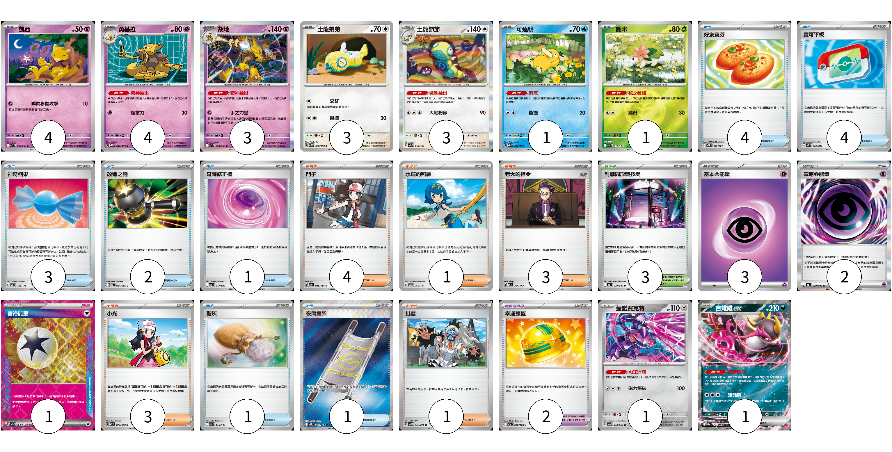 牌組構築方案 以此牌組為基礎新構築牌組 顯示卡面 顯示列表 寶可夢卡(21) 4 4 3 3 3 1 1 1 1 寶可夢道具(2) 2 物品卡(16) 4 4 3 2 1 1 1 支援者卡(12) 4 1 3 3 1 競技場卡(3) 3 能量卡(6) 3 2 1 寶可夢卡(21) 卡牌名稱 張數 卡牌名稱 張數 凱西 M1S 036/063 04 勇基拉 M1S 037/063 04 胡地 M1S 038/063 03 土龍弟弟 SV9 078/100 03 土龍節節 SV8a 130/187 03 可達鴨 M2a 032/193 01 謝米 M2a 012/193 01 蓋諾賽克特 SV6a 040/064 01 吉雉雞ex SV8a 104/187 01 寶可夢道具(2) 卡牌名稱 張數 卡牌名稱 張數 幸運頭盔 SV5a 060/066 02 物品卡(16) 卡牌名稱 張數 卡牌名稱 張數 好友寶芬 SVOM 012/021 04 寶可平板 MC 662/742 04 神奇糖果 SVM 135/175 03 改造之錘 SV5a 054/066 02 奇跡修正檔 MBD 017/022 01 聖灰 M2a 150/193 01 夜間擔架 M1L 083/063 01 支援者卡(12) 卡牌名稱 張數 卡牌名稱 張數 鬥子 SV11W 085/086 04 水蓮的照顧 SV8a 168/187 01 老大的指令 MC 724/742 03 小光 M2 077/080 03 枇琶 SV5K 068/071 01 競技場卡(3) 卡牌名稱 張數 卡牌名稱 張數 對戰圓形競技場 M2 079/080 03 能量卡(6) 卡牌名稱 張數 卡牌名稱 張數 基本超能量 sv-p PSY 03 感應【超】能量 M3 079/080 02 富裕能量 SV7a 064/064 01 以此牌組為基礎新構築牌組 牌組編碼 XPRGjl-tSBNQP-eKwRUY copy 列印牌組單 牌組編碼已複製 分享至SNS