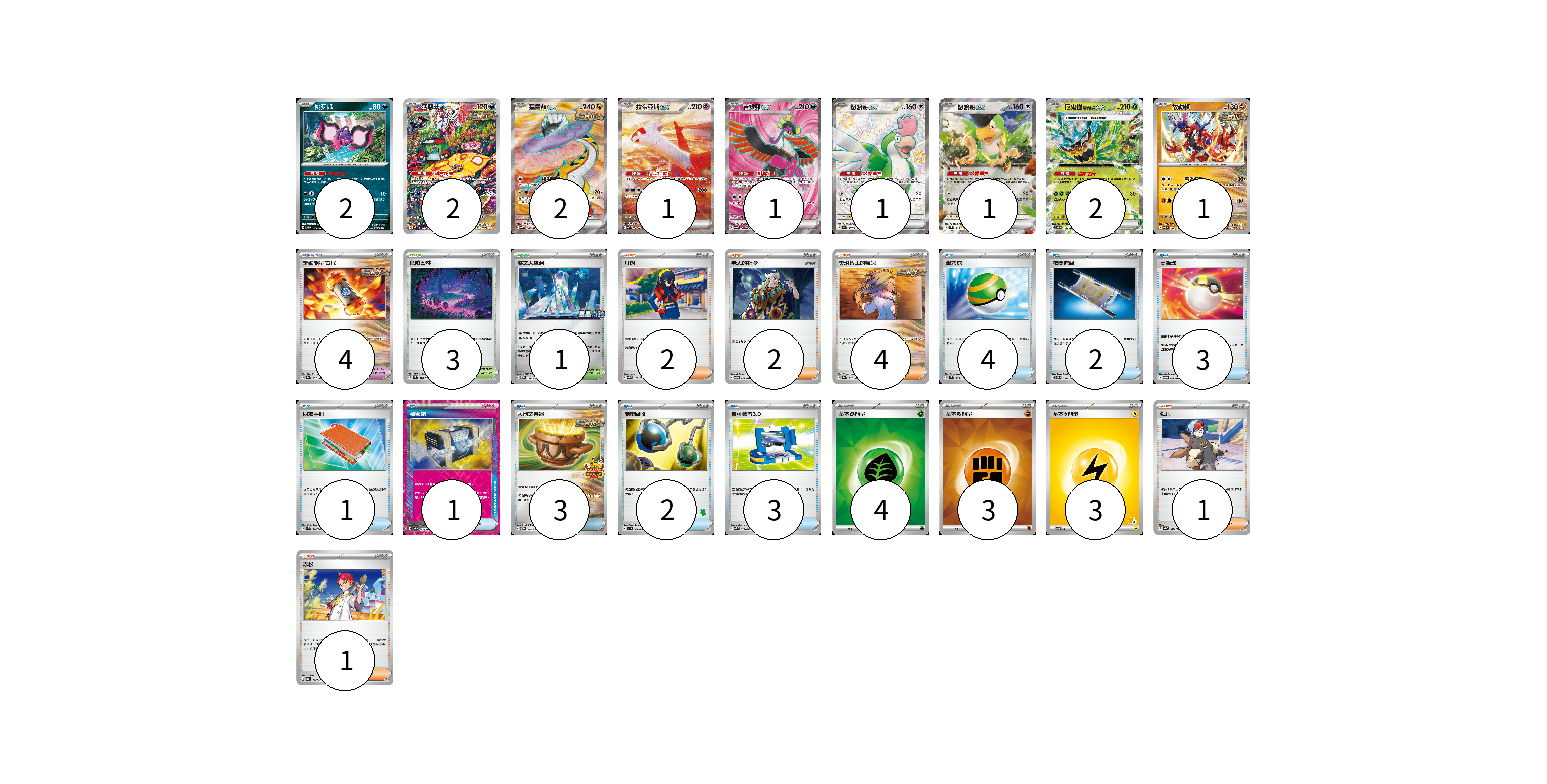 牌組構築方案 以此牌組為基礎新構築牌組 顯示卡面 顯示列表 寶可夢卡(13) 2 2 2 1 1 1 1 2 1 寶可夢道具(4) 4 物品卡(19) 4 2 3 1 1 3 2 3 支援者卡(10) 2 2 4 1 1 競技場卡(4) 3 1 能量卡(10) 4 3 3 寶可夢卡(13) 卡牌名稱 張數 卡牌名稱 張數 桃歹郎 SV8 075/106 02 猛惡菇 SV4K 077/066 02 猛雷鼓ex SV5K 089/071 02 拉帝亞斯ex SV7a 087/064 01 吉雉雞ex SV6a 081/064 01 怒鸚哥ex SV4a 337/190 01 怒鸚哥ex SV2P 065/071 01 厄鬼椪 碧草面具ex SV6 016/101 02 故勒頓 SV8 069/106 01 寶可夢道具(4) 卡牌名稱 張數 卡牌名稱 張數 驅勁能量 古代 SV8a 157/187 04 物品卡(19) 卡牌名稱 張數 卡牌名稱 張數 巢穴球 SVM 133/175 04 夜間擔架 SVOM 016/021 02 高級球 SVOD 012/020 03 朋友手冊 SVK 014/042 01 秘密箱 SV6 092/101 01 大地之容器 SV-P 084/SV-P 03 能量回收 SVI 049/066 02 寶可裝置3.0 SVK 021/042 03 支援者卡(10) 卡牌名稱 張數 卡牌名稱 張數 丹瑜 SV8a 170/187 02 老大的指令 SVOD 019/020 02 奧琳博士的氣魄 SV8a 167/187 04 牡丹 SV4a 182/190 01 赤松 SV8a 163/187 01 競技場卡(4) 卡牌名稱 張數 卡牌名稱 張數 危險密林 SV5K 070/071 03 零之大空洞 SV-P 151/SV-P 01 能量卡(10) 卡牌名稱 張數 卡牌名稱 張數 基本【草】能量 SVK GRA 04 基本【鬥】能量 SVK FIG 03 基本【雷】能量 SVI LIG 03 以此牌組為基礎新構築牌組 牌組編碼 XQjCDc-rjjmWs-dWagsh copy 列印牌組單 牌組編碼已複製 分享至SNS