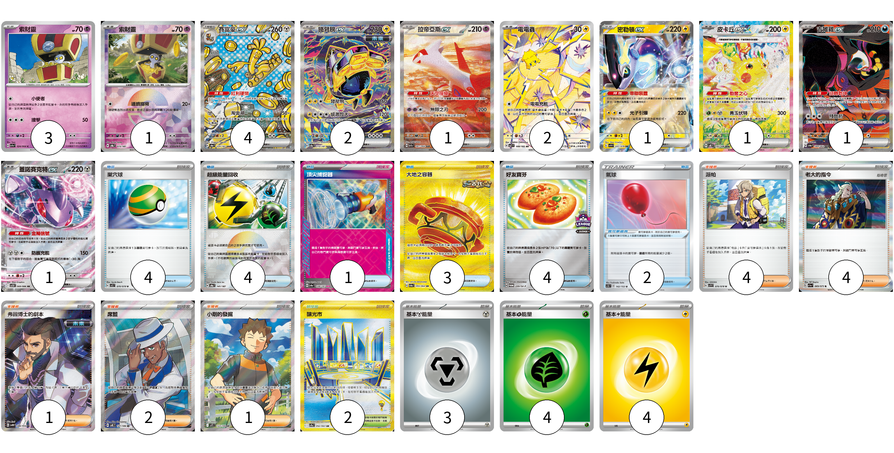 牌組構築方案 以此牌組為基礎新構築牌組 顯示卡面 顯示列表 寶可夢卡(17) 3 1 4 2 1 2 1 1 1 1 寶可夢道具(2) 2 物品卡(16) 4 4 1 3 4 支援者卡(12) 4 4 1 2 1 競技場卡(2) 2 能量卡(11) 3 4 4 寶可夢卡(17) 卡牌名稱 張數 卡牌名稱 張數 索財靈 SV7a 024/064 03 索財靈 SV8a 073/187 01 賽富豪ex SV8a 220/187 04 鐵臂膀ex SV8a 210/187 02 拉帝亞斯ex SV7a 087/064 01 電電蟲 SV7 108/102 02 密勒頓ex SV1V 037/078 01 皮卡丘ex SV8 132/106 01 吉雉雞ex SV6a 089/064 01 蓋諾賽克特ex SV11B 069/086 01 寶可夢道具(2) 卡牌名稱 張數 卡牌名稱 張數 氣球 SC1b 142/153 02 物品卡(16) 卡牌名稱 張數 卡牌名稱 張數 巢穴球 SV1S 070/078 04 超級能量回收 SV8a 141/187 04 頂尖捕捉器 SV8a 148/187 01 大地之容器 SV6a 093/064 03 好友寶芬 SV-P 230/SV-P 04 支援者卡(12) 卡牌名稱 張數 卡牌名稱 張數 派帕 SV1V 076/078 04 老大的指令 SV1a 069/073 04 弗圖博士的劇本 SV4M 086/066 01 席藍 SV8 127/106 02 小剛的發掘 SV9 123/100 01 競技場卡(2) 卡牌名稱 張數 卡牌名稱 張數 釀光市 SV9a 092/063 02 能量卡(11) 卡牌名稱 張數 卡牌名稱 張數 基本鋼能量 sv-p MET 03 基本草能量 sv-p GRA 04 基本雷能量 sv-p LIG 04 以此牌組為基礎新構築牌組 牌組編碼 XRQxCg-cAUOGv-GmCzlB copy 列印牌組單 牌組編碼已複製 分享至SNS