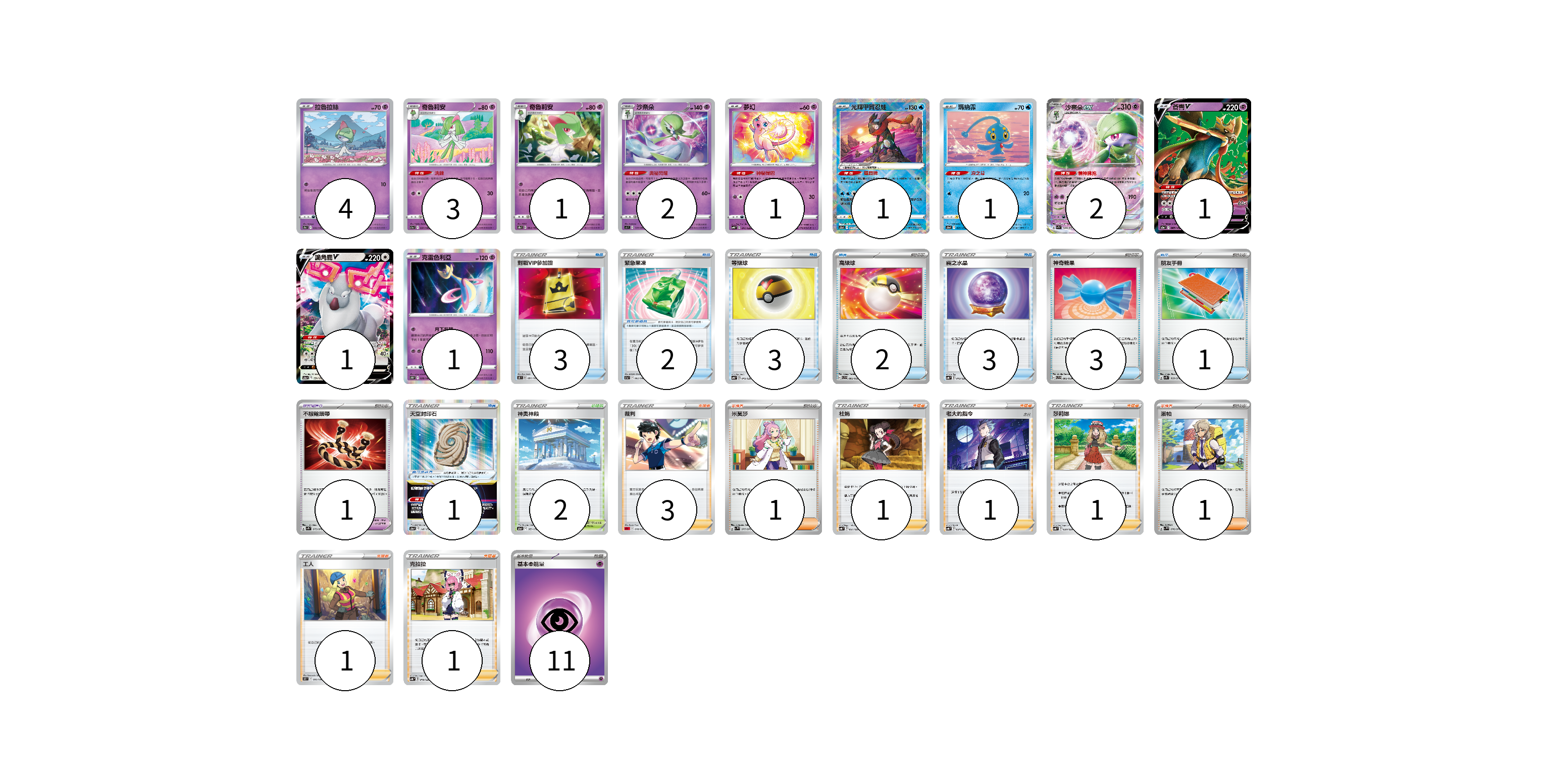 牌組構築方案 以此牌組為基礎新構築牌組 顯示卡面 顯示列表 寶可夢卡(18) 4 3 1 2 1 1 1 2 1 1 1 寶可夢道具(4) 2 1 1 物品卡(15) 3 3 2 3 3 1 支援者卡(10) 3 1 1 1 1 1 1 1 競技場卡(2) 2 能量卡(11) 11 寶可夢卡(18) 卡牌名稱 張數 卡牌名稱 張數 拉魯拉絲 S9a 032/067 04 奇魯莉安 S11a 037/068 03 奇魯莉安 S8b 062/184 01 沙奈朵 SI 177/414 02 夢幻 SVB 011/028 01 光輝甲賀忍蛙 S12a 033/172 01 瑪納霏 S12a 029/172 01 沙奈朵ex SV1S 028/078 02 蒼響V S12a 067/172 01 詭角鹿V S12a 131/172 01 克雷色利亞 S10D 028/067 01 寶可夢道具(4) 卡牌名稱 張數 卡牌名稱 張數 緊急果凍 S11a 062/068 02 不服輸頭帶 SV1S 073/078 01 天空封印石 S12a 146/172 01 物品卡(15) 卡牌名稱 張數 卡牌名稱 張數 對戰VIP參加證 S8 091/100 03 等級球 SVB 015/028 03 高級球 SVB 002/028 02 霧之水晶 SVB 013/028 03 神奇糖果 SVB 003/028 03 朋友手冊 SV1S 069/078 01 支援者卡(10) 卡牌名稱 張數 卡牌名稱 張數 裁判 SDL 018/021 03 米莫莎 SV1V 077/078 01 杜娟 SVB 021/028 01 老大的指令(赤日) SVB 024/028 01 莎莉娜 SVB 020/028 01 派帕 SV1V 076/078 01 工人 S12 093/098 01 克拉拉 SVB 019/028 01 競技場卡(2) 卡牌名稱 張數 卡牌名稱 張數 神奧神殿 S12a 169/172 02 能量卡(11) 卡牌名稱 張數 卡牌名稱 張數 基本【超】能量 SVB PSY 11 以此牌組為基礎新構築牌組 牌組編碼 XSwRLE-YbQsaS-EbDkBx copy 列印牌組單 牌組編碼已複製 分享至SNS