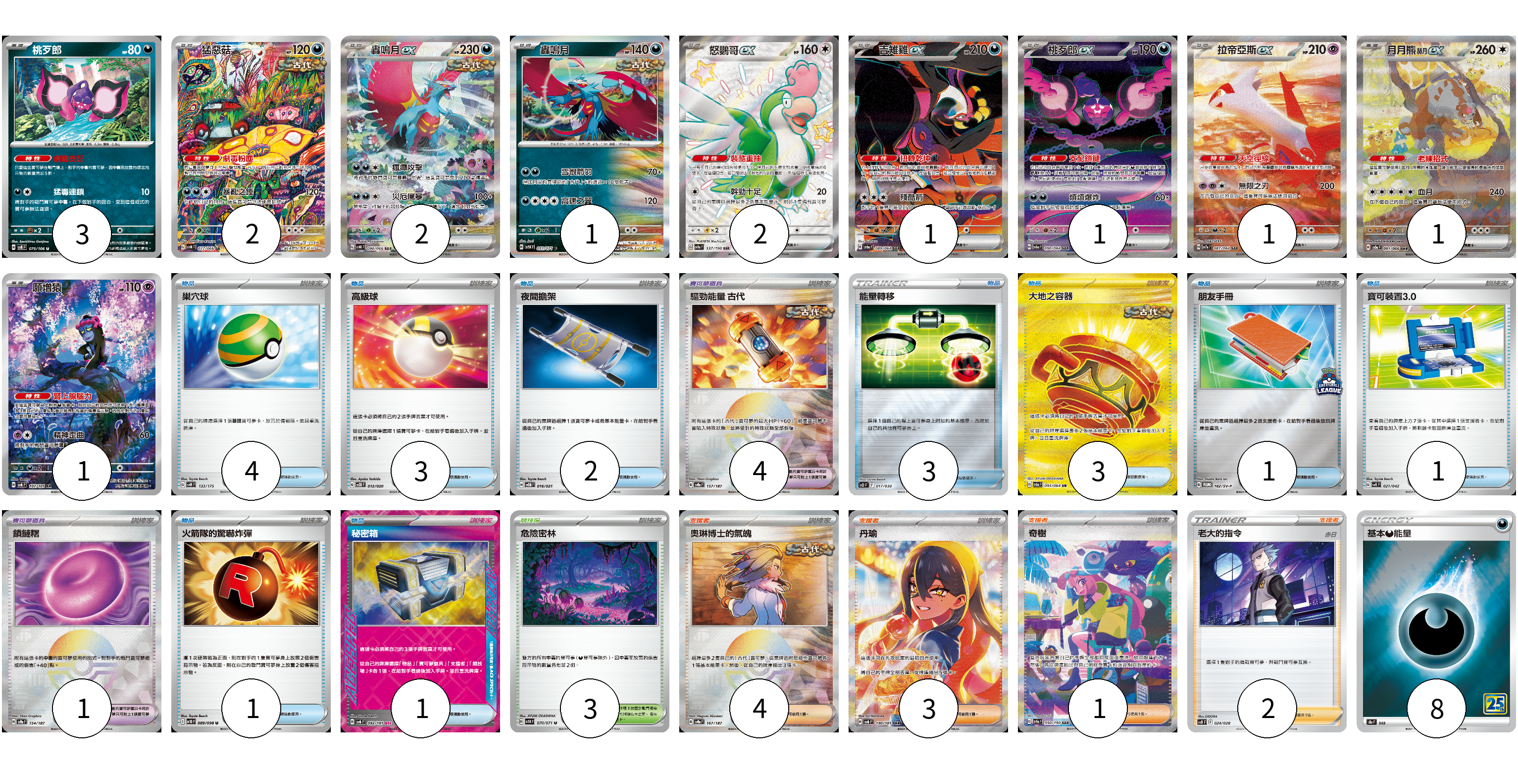 牌組構築方案 以此牌組為基礎新構築牌組 顯示卡面 顯示列表 寶可夢卡(15) 3 2 2 1 2 1 1 1 1 1 寶可夢道具(5) 4 1 物品卡(19) 4 3 2 3 3 1 1 1 1 支援者卡(10) 4 3 1 2 競技場卡(3) 3 能量卡(8) 8 寶可夢卡(15) 卡牌名稱 張數 卡牌名稱 張數 桃歹郎 SV8 075/106 03 猛惡菇 SV4K 077/066 02 轟鳴月ex SV4K 090/066 02 轟鳴月 SV5K 051/071 01 怒鸚哥ex SV4a 337/190 02 吉雉雞ex SV6a 089/064 01 桃歹郎ex SV6a 090/064 01 拉帝亞斯ex SV7a 087/064 01 月月熊 赫月 ex SV5a 091/066 01 願增猿 SV6 107/101 01 寶可夢道具(5) 卡牌名稱 張數 卡牌名稱 張數 驅勁能量 古代 SV8a 157/187 04 鎖鏈糬 SV8a 154/187 01 物品卡(19) 卡牌名稱 張數 卡牌名稱 張數 巢穴球 SVM 133/175 04 高級球 SVOD 012/020 03 夜間擔架 SVOM 016/021 02 能量轉移 SO 017/030 03 大地之容器 SV6a 093/064 03 朋友手冊 SV-P 182/SV-P 01 寶可裝置3.0 SVK 021/042 01 火箭隊的驚嚇炸彈 SV10 089/098 01 秘密箱 SV6 092/101 01 支援者卡(10) 卡牌名稱 張數 卡牌名稱 張數 奧琳博士的氣魄 SV8a 167/187 04 丹瑜 SV6 130/101 03 奇樹 SV4a 350/190 01 老大的指令(赤日) SVB 024/028 02 競技場卡(3) 卡牌名稱 張數 卡牌名稱 張數 危險密林 SV5K 070/071 03 能量卡(8) 卡牌名稱 張數 卡牌名稱 張數 基本惡能量 S8a DAR 08 以此牌組為基礎新構築牌組 牌組編碼 XVJcyj-qmmaPQ-TEHMjJ copy 列印牌組單 牌組編碼已複製 分享至SNS