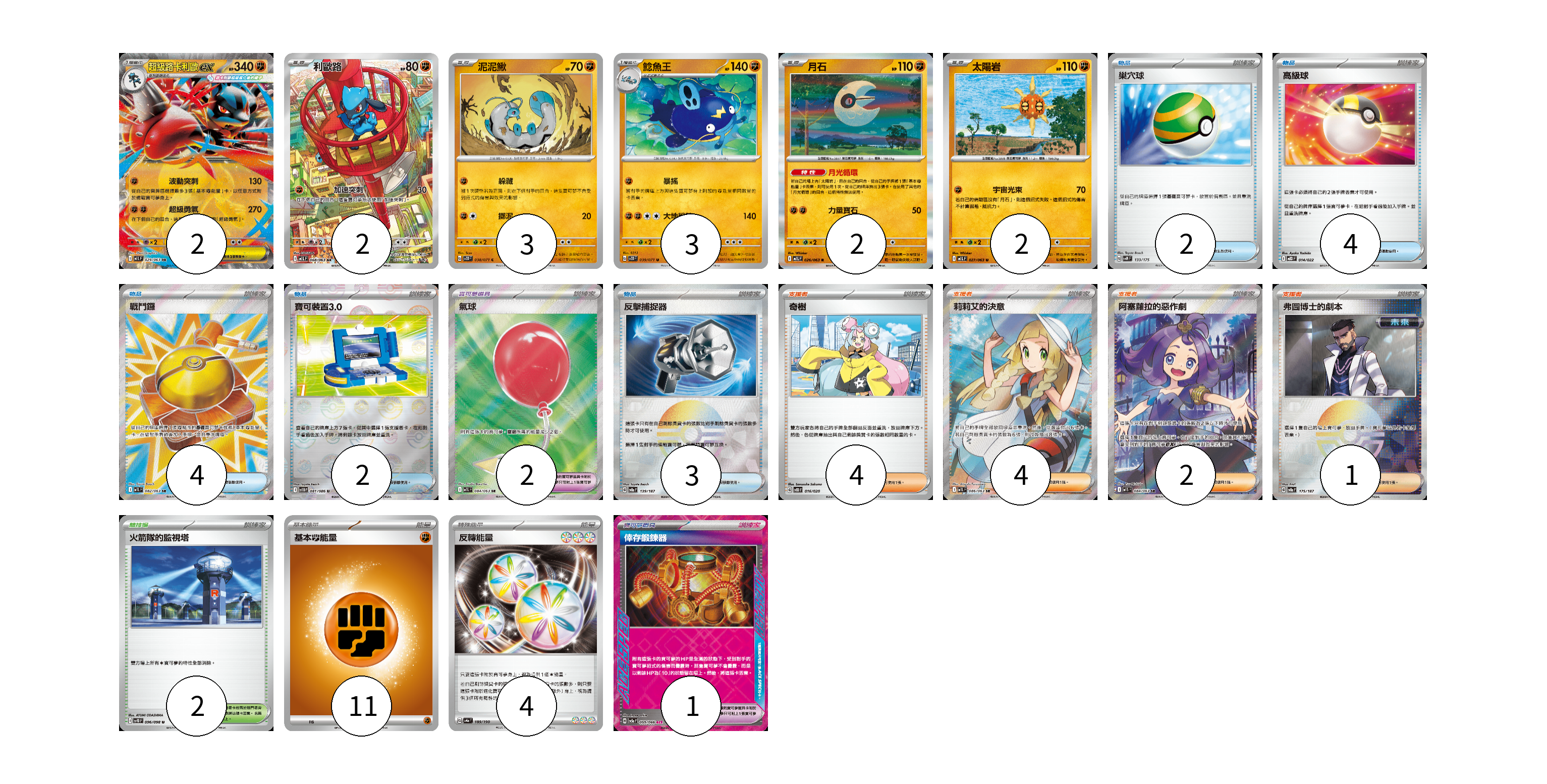 牌組構築方案 以此牌組為基礎新構築牌組 顯示卡面 顯示列表 寶可夢卡(14) 2 2 3 3 2 2 寶可夢道具(3) 2 1 物品卡(15) 2 4 4 2 3 支援者卡(11) 4 4 2 1 競技場卡(2) 2 能量卡(15) 11 4 寶可夢卡(14) 卡牌名稱 張數 卡牌名稱 張數 超級路卡利歐ex M1L 029/063 02 利歐路 M1L 068/063 02 泥泥鰍 SV2D 038/071 03 鯰魚王 SV2D 039/071 03 月石 M1L 026/063 02 太陽岩 M1L 027/063 02 寶可夢道具(3) 卡牌名稱 張數 卡牌名稱 張數 氣球 M1L 084/063 02 倖存鍛鍊器 SV5a 059/066 01 物品卡(15) 卡牌名稱 張數 卡牌名稱 張數 巢穴球 SVM 133/175 02 高級球 MBD 014/022 04 戰鬥鑼 M1L 082/063 04 寶可裝置3.0 SV11B 081/086 02 反擊捕捉器 SV8a 139/187 03 支援者卡(11) 卡牌名稱 張數 卡牌名稱 張數 奇樹 SVOD 016/020 04 莉莉艾的決意 M1L 086/063 04 阿塞蘿拉的惡作劇 M1S 084/063 02 弗圖博士的劇本 SV8a 175/187 01 競技場卡(2) 卡牌名稱 張數 卡牌名稱 張數 火箭隊的監視塔 SV10 096/098 02 能量卡(15) 卡牌名稱 張數 卡牌名稱 張數 基本【鬥】能量 M-P FIG 11 反轉能量 SV4a 189/190 04 以此牌組為基礎新構築牌組 牌組編碼 XVNwGs-pSdHIf-FWkaaU copy 列印牌組單 牌組編碼已複製 分享至SNS