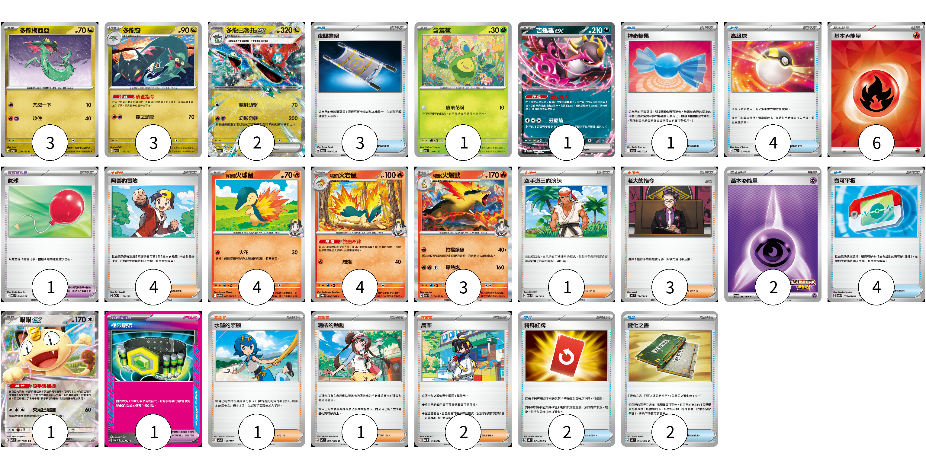 牌組構築方案 以此牌組為基礎新構築牌組 顯示卡面 顯示列表 寶可夢卡(22) 3 3 2 1 1 4 4 3 1 寶可夢道具(2) 1 1 物品卡(16) 3 1 4 4 2 2 支援者卡(12) 4 1 3 1 1 2 能量卡(8) 6 2 寶可夢卡(22) 卡牌名稱 張數 卡牌名稱 張數 多龍梅西亞 SV6 079/101 03 多龍奇 SV8a 119/187 03 多龍巴魯托ex SV8a 120/187 02 含羞苞 SV8a 001/187 01 吉雉雞ex SVOD 004/020 01 <阿響的>火球鼠 SV9a 015/063 04 <阿響的>火岩鼠 SV9a 016/063 04 <阿響的>火爆獸 SV9a 017/063 03 喵喵ex M3 061/080 01 寶可夢道具(2) 卡牌名稱 張數 卡牌名稱 張數 氣球 MBD 018/022 01 極限腰帶 MC 691/742 01 物品卡(16) 卡牌名稱 張數 卡牌名稱 張數 夜間擔架 MBD 016/022 03 神奇糖果 MBG 013/022 01 高級球 MBD 014/022 04 寶可平板 M3 070/080 04 特殊紅牌 M4 072/083 02 變化之書 M4 074/083 02 支援者卡(12) 卡牌名稱 張數 卡牌名稱 張數 阿響的冒險 M2a 174/193 04 空手道王的演練 SVM 149/175 01 老大的指令 MC 724/742 03 水蓮的照顧 SV8a 168/187 01 鳴依的勉勵 M3 075/080 01 烏栗 MC 713/742 02 能量卡(8) 卡牌名稱 張數 卡牌名稱 張數 基本【火】能量 SVQL FIR 06 基本【超】能量 SV-P 261/SV-P 02 以此牌組為基礎新構築牌組 牌組編碼 XVXLZm-DINGnG-LYjKZT copy 列印牌組單 牌組編碼已複製 分享至SNS
