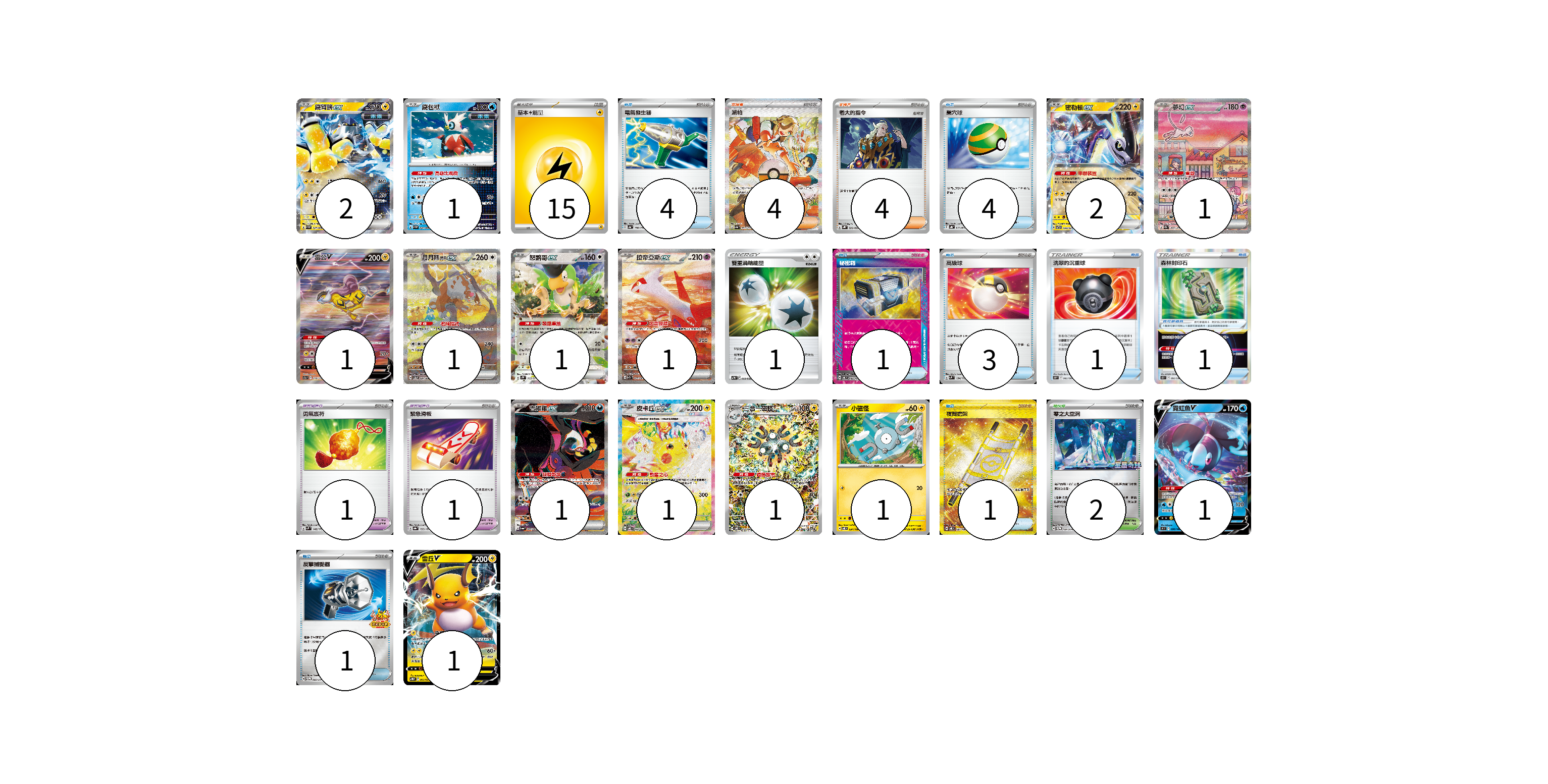 牌組構築方案 以此牌組為基礎新構築牌組 顯示卡面 顯示列表 寶可夢卡(16) 2 1 2 1 1 1 1 1 1 1 1 1 1 1 寶可夢道具(3) 1 1 1 物品卡(15) 4 4 1 3 1 1 1 支援者卡(8) 4 4 競技場卡(2) 2 能量卡(16) 15 1 寶可夢卡(16) 卡牌名稱 張數 卡牌名稱 張數 鐵臂膀ex SV4M 027/066 02 鐵包袱 SV4M 020/066 01 密勒頓ex SVTR 008/021 02 夢幻ex SV2a 205/165 01 雷公V S12a 218/172 01 月月熊 赫月 ex SV5a 091/066 01 怒鸚哥ex SV2P 065/071 01 拉帝亞斯ex SV7a 087/064 01 吉雉雞ex SV6a 089/064 01 皮卡丘ex SV8 132/106 01 三合一磁怪 SV8 112/106 01 小磁怪 SV8 034/106 01 霓虹魚V S9 030/100 01 雷丘V SVTR 003/021 01 寶可夢道具(3) 卡牌名稱 張數 卡牌名稱 張數 森林封印石 S12 092/098 01 勇氣護符 SVM 142/175 01 緊急滑板 SV8a 153/187 01 物品卡(15) 卡牌名稱 張數 卡牌名稱 張數 電氣發生器 SV4a 156/190 04 巢穴球 SVHK 012/022 04 秘密箱 SV6 092/101 01 高級球 SVM 134/175 03 洗翠的沉重球 S10P 062/067 01 夜間擔架 SV8 137/106 01 反擊捕捉器 SV-P 083/SV-P 01 支援者卡(8) 卡牌名稱 張數 卡牌名稱 張數 派帕 SV4a 353/190 04 老大的指令 SVHK 022/022 04 競技場卡(2) 卡牌名稱 張數 卡牌名稱 張數 零之大空洞 SV-P 151/SV-P 02 能量卡(16) 卡牌名稱 張數 卡牌名稱 張數 基本【雷】能量 SVHM LIG 15 雙重渦輪能量 SVTM 022/022 01 以此牌組為基礎新構築牌組 牌組編碼 XVlgcj-GqQKPj-GlXwIl copy 列印牌組單 牌組編碼已複製 分享至SNS