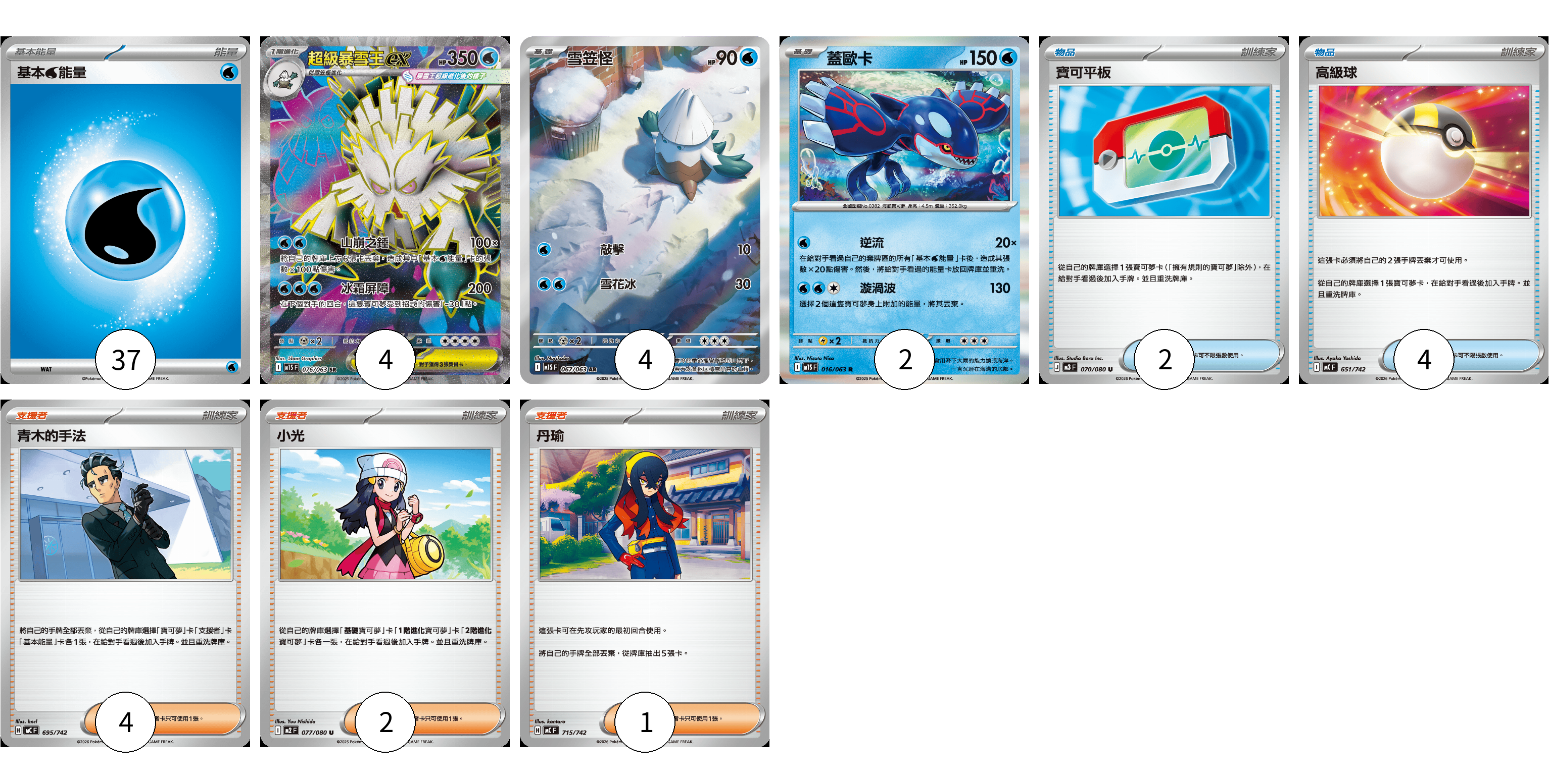 牌組構築方案 以此牌組為基礎新構築牌組 顯示卡面 顯示列表 寶可夢卡(10) 4 4 2 物品卡(6) 2 4 支援者卡(7) 4 2 1 能量卡(37) 37 寶可夢卡(10) 卡牌名稱 張數 卡牌名稱 張數 超級暴雪王ex M1S 076/063 04 雪笠怪 M1S 067/063 04 蓋歐卡 M1S 016/063 02 物品卡(6) 卡牌名稱 張數 卡牌名稱 張數 寶可平板 M3 070/080 02 高級球 MC 651/742 04 支援者卡(7) 卡牌名稱 張數 卡牌名稱 張數 青木的手法 MC 695/742 04 小光 M2 077/080 02 丹瑜 MC 715/742 01 能量卡(37) 卡牌名稱 張數 卡牌名稱 張數 基本【水】能量 MC WAT 37 以此牌組為基礎新構築牌組 牌組編碼 XVwdhg-bBNKwc-pxPXnk copy 列印牌組單 牌組編碼已複製 分享至SNS