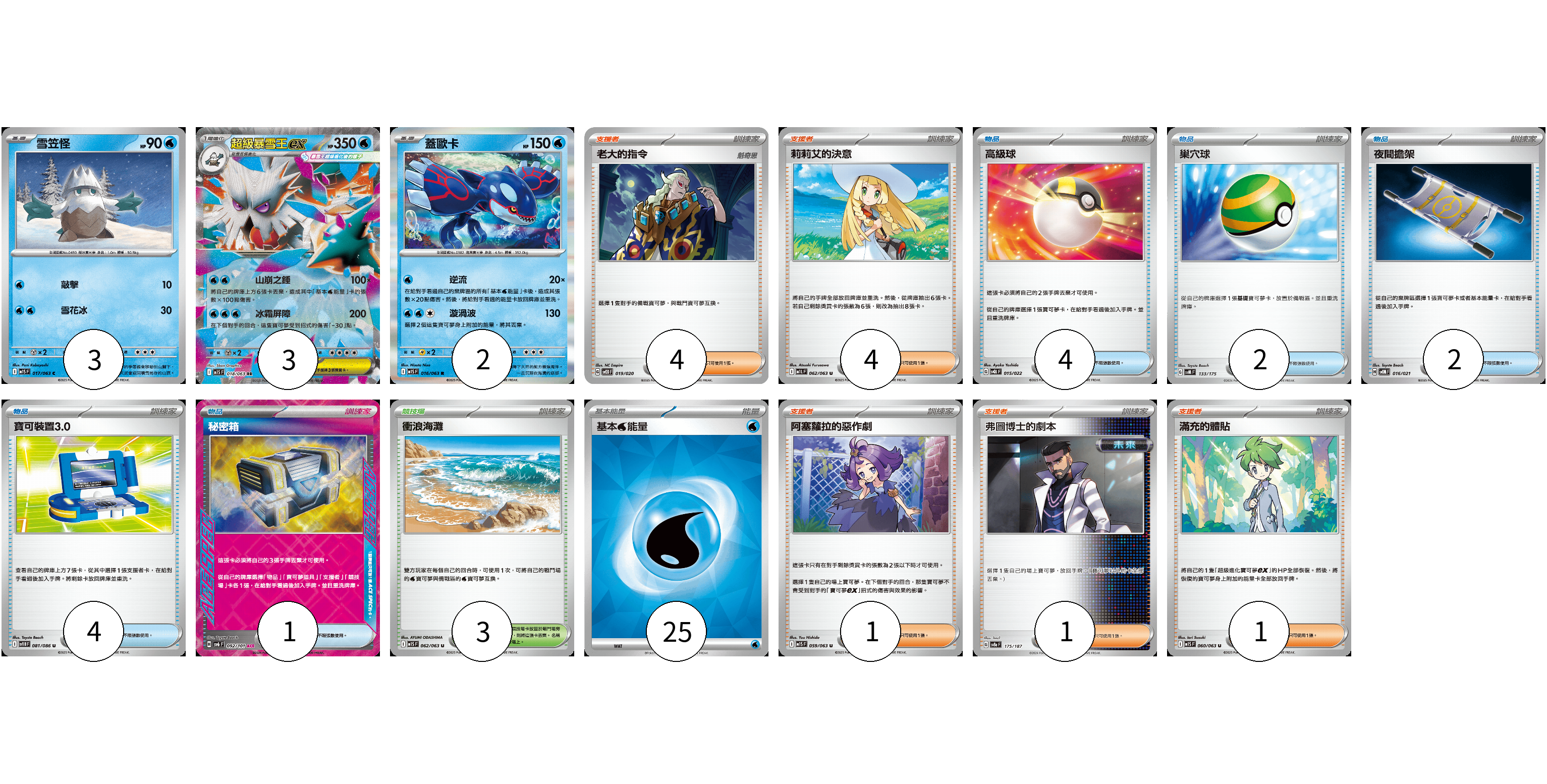牌組構築方案 以此牌組為基礎新構築牌組 顯示卡面 顯示列表 寶可夢卡(8) 3 3 2 物品卡(13) 4 2 2 4 1 支援者卡(11) 4 4 1 1 1 競技場卡(3) 3 能量卡(25) 25 寶可夢卡(8) 卡牌名稱 張數 卡牌名稱 張數 雪笠怪 M1S 017/063 03 超級暴雪王ex M1S 018/063 03 蓋歐卡 M1S 016/063 02 物品卡(13) 卡牌名稱 張數 卡牌名稱 張數 高級球 SVQL 015/022 04 巢穴球 SVM 133/175 02 夜間擔架 SVOM 016/021 02 寶可裝置3.0 SV11B 081/086 04 秘密箱 SV6 092/101 01 支援者卡(11) 卡牌名稱 張數 卡牌名稱 張數 老大的指令 SVOD 019/020 04 莉莉艾的決意 M1L 062/063 04 阿塞蘿拉的惡作劇 M1S 059/063 01 弗圖博士的劇本 SV8a 175/187 01 滿充的體貼 M1S 060/063 01 競技場卡(3) 卡牌名稱 張數 卡牌名稱 張數 衝浪海灘 M1S 062/063 03 能量卡(25) 卡牌名稱 張數 卡牌名稱 張數 基本【水】能量 SVK WAT 25 以此牌組為基礎新構築牌組 牌組編碼 XWgpOT-FEQuyz-jLtTkx copy 列印牌組單 牌組編碼已複製 分享至SNS