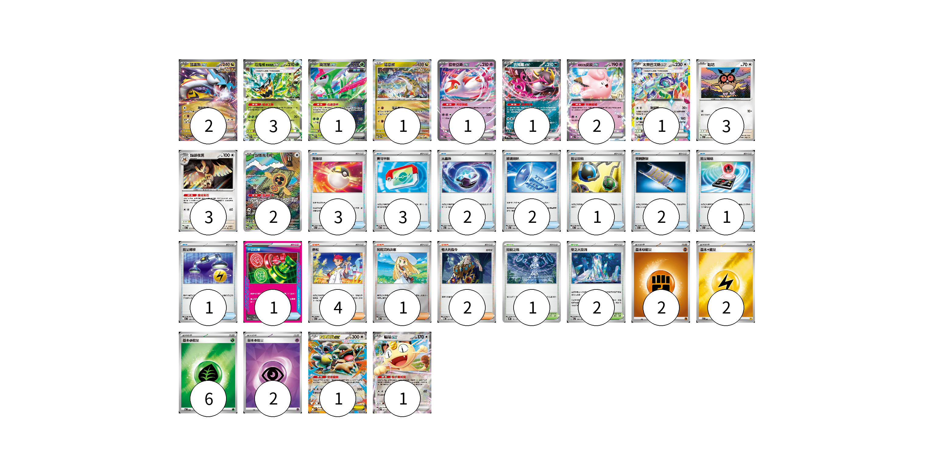 牌組構築方案 以此牌組為基礎新構築牌組 顯示卡面 顯示列表 寶可夢卡(22) 2 3 1 1 1 1 2 1 3 3 2 1 1 物品卡(16) 3 3 2 2 1 2 1 1 1 支援者卡(7) 4 1 2 競技場卡(3) 1 2 能量卡(12) 2 2 6 2 寶可夢卡(22) 卡牌名稱 張數 卡牌名稱 張數 猛雷鼓ex MC 554/742 02 厄鬼椪 碧草面具ex MC 082/742 03 鐵斑葉ex MC 077/742 01 猛雷鼓 SV7 075/102 01 拉帝亞斯ex MC 312/742 01 吉雉雞ex M2a 114/193 01 <莉莉艾的>皮皮ex MC 287/742 02 太樂巴戈斯ex MC 630/742 01 咕咕 MC 572/742 03 貓頭夜鷹 MC 573/742 03 旋轉洛托姆 M2a 213/193 02 超級袋獸ex M1S 051/063 01 喵喵ex M3 061/080 01 物品卡(16) 卡牌名稱 張數 卡牌名稱 張數 高級球 MC 651/742 03 寶可平板 M3 070/080 03 太晶珠 M2a 152/193 02 玻璃喇叭 M2a 149/193 02 能量回收 MC 636/742 01 夜間擔架 MC 670/742 02 能量輸送 MC 639/742 01 能量轉移 MC 638/742 01 不公印章 MC 633/742 01 支援者卡(7) 卡牌名稱 張數 卡牌名稱 張數 赤松 MC 696/742 04 莉莉艾的決意 MC 729/742 01 老大的指令 MBG 021/022 02 競技場卡(3) 卡牌名稱 張數 卡牌名稱 張數 阻礙之塔 SV8a 181/187 01 零之大空洞 M2a 184/193 02 能量卡(12) 卡牌名稱 張數 卡牌名稱 張數 基本【鬥】能量 MC FIG 02 基本【雷】能量 MC LIG 02 基本【草】能量 MC GRA 06 基本【超】能量 SVOD PSY 02 以此牌組為基礎新構築牌組 牌組編碼 XbwhpM-SRgExr-aQdxCN copy 列印牌組單 牌組編碼已複製 分享至SNS