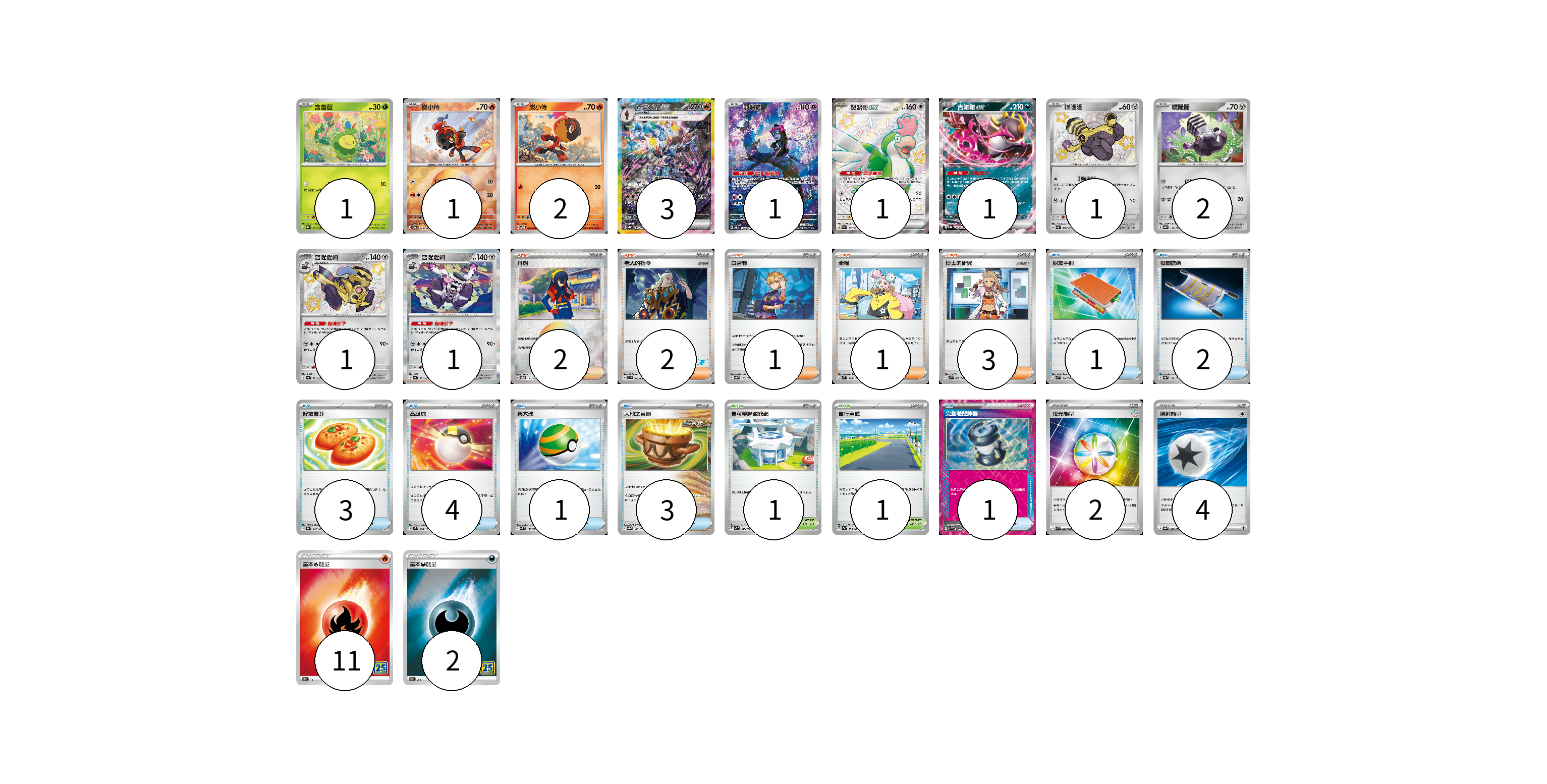 牌組構築方案 以此牌組為基礎新構築牌組 顯示卡面 顯示列表 寶可夢卡(15) 1 1 2 3 1 1 1 1 2 1 1 物品卡(15) 1 2 3 4 1 3 1 支援者卡(9) 2 2 1 1 3 競技場卡(2) 1 1 能量卡(19) 2 4 11 2 寶可夢卡(15) 卡牌名稱 張數 卡牌名稱 張數 含羞苞 SV8a 001/187 01 炭小侍 SV8a 023/187 01 炭小侍 SVPS 005/008 02 蒼炎刃鬼ex SV8a 203/187 03 願增猿 SV6 107/101 01 怒鸚哥ex SV4a 337/190 01 吉雉雞ex SV8a 104/187 01 噗隆隆 SV4a 300/190 01 噗隆隆 SV8a 114/187 02 普隆隆姆 SV4a 301/190 01 普隆隆姆 SV4a 131/190 01 物品卡(15) 卡牌名稱 張數 卡牌名稱 張數 朋友手冊 SVK 014/042 01 夜間擔架 SV8a 151/187 02 好友寶芬 SV8a 147/187 03 高級球 SVM 134/175 04 巢穴球 SVM 133/175 01 大地之容器 SV8a 143/187 03 完全體攪拌器 SVK 017/042 01 支援者卡(9) 卡牌名稱 張數 卡牌名稱 張數 丹瑜 SV8a 170/187 02 老大的指令 SVI 066/066 02 白蕾雅 SV8a 176/187 01 奇樹 SVM 160/175 01 博士的研究 SVK 032/042 03 競技場卡(2) 卡牌名稱 張數 卡牌名稱 張數 寶可夢聯盟總部 SV3 108/108 01 自行車道 SV2a 165/165 01 能量卡(19) 卡牌名稱 張數 卡牌名稱 張數 夜光能量 SVK 042/042 02 噴射能量 SV8a 185/187 04 基本火能量 S8a FIR 11 基本惡能量 S8a DAR 02 以此牌組為基礎新構築牌組 牌組編碼 XdWSdH-RqWgIz-EwcOFa copy 列印牌組單 牌組編碼已複製 分享至SNS