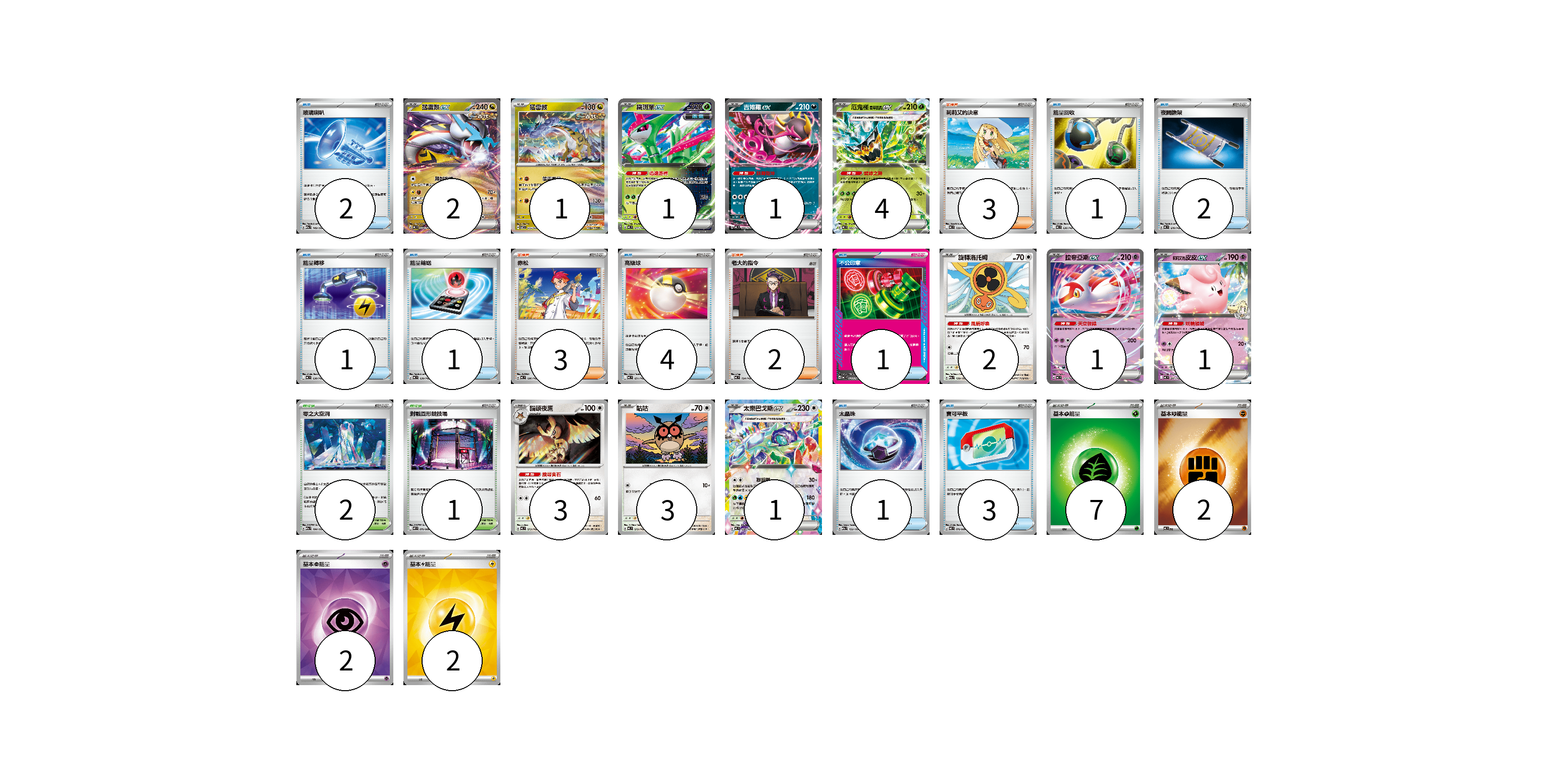 牌組構築方案 以此牌組為基礎新構築牌組 顯示卡面 顯示列表 寶可夢卡(20) 2 1 1 1 4 2 1 1 3 3 1 物品卡(16) 2 1 2 1 1 4 1 1 3 支援者卡(8) 3 3 2 競技場卡(3) 2 1 能量卡(13) 7 2 2 2 寶可夢卡(20) 卡牌名稱 張數 卡牌名稱 張數 猛雷鼓ex MC 554/742 02 猛雷鼓 SV7 075/102 01 鐵斑葉ex MC 077/742 01 吉雉雞ex MC 489/742 01 厄鬼椪 碧草面具ex MC 082/742 04 旋轉洛托姆 M2a 139/193 02 拉帝亞斯ex MC 312/742 01 <莉莉艾的>皮皮ex MC 287/742 01 貓頭夜鷹 MC 573/742 03 咕咕 MC 572/742 03 太樂巴戈斯ex MC 630/742 01 物品卡(16) 卡牌名稱 張數 卡牌名稱 張數 玻璃喇叭 M2a 149/193 02 能量回收 MC 636/742 01 夜間擔架 MC 670/742 02 能量轉移 MC 638/742 01 能量輸送 MC 639/742 01 高級球 MC 651/742 04 不公印章 MC 633/742 01 太晶珠 M2a 152/193 01 寶可平板 M3 070/080 03 支援者卡(8) 卡牌名稱 張數 卡牌名稱 張數 莉莉艾的決意 MC 729/742 03 赤松 MC 696/742 03 老大的指令 MC 724/742 02 競技場卡(3) 卡牌名稱 張數 卡牌名稱 張數 零之大空洞 M2a 184/193 02 對戰圓形競技場 M2 079/080 01 能量卡(13) 卡牌名稱 張數 卡牌名稱 張數 基本【草】能量 MC GRA 07 基本【鬥】能量 MC FIG 02 基本【超】能量 SVOD PSY 02 基本【雷】能量 SVM LIG 02 以此牌組為基礎新構築牌組 牌組編碼 XdiBDY-qlFJXP-OokRGJ copy 列印牌組單 牌組編碼已複製 分享至SNS