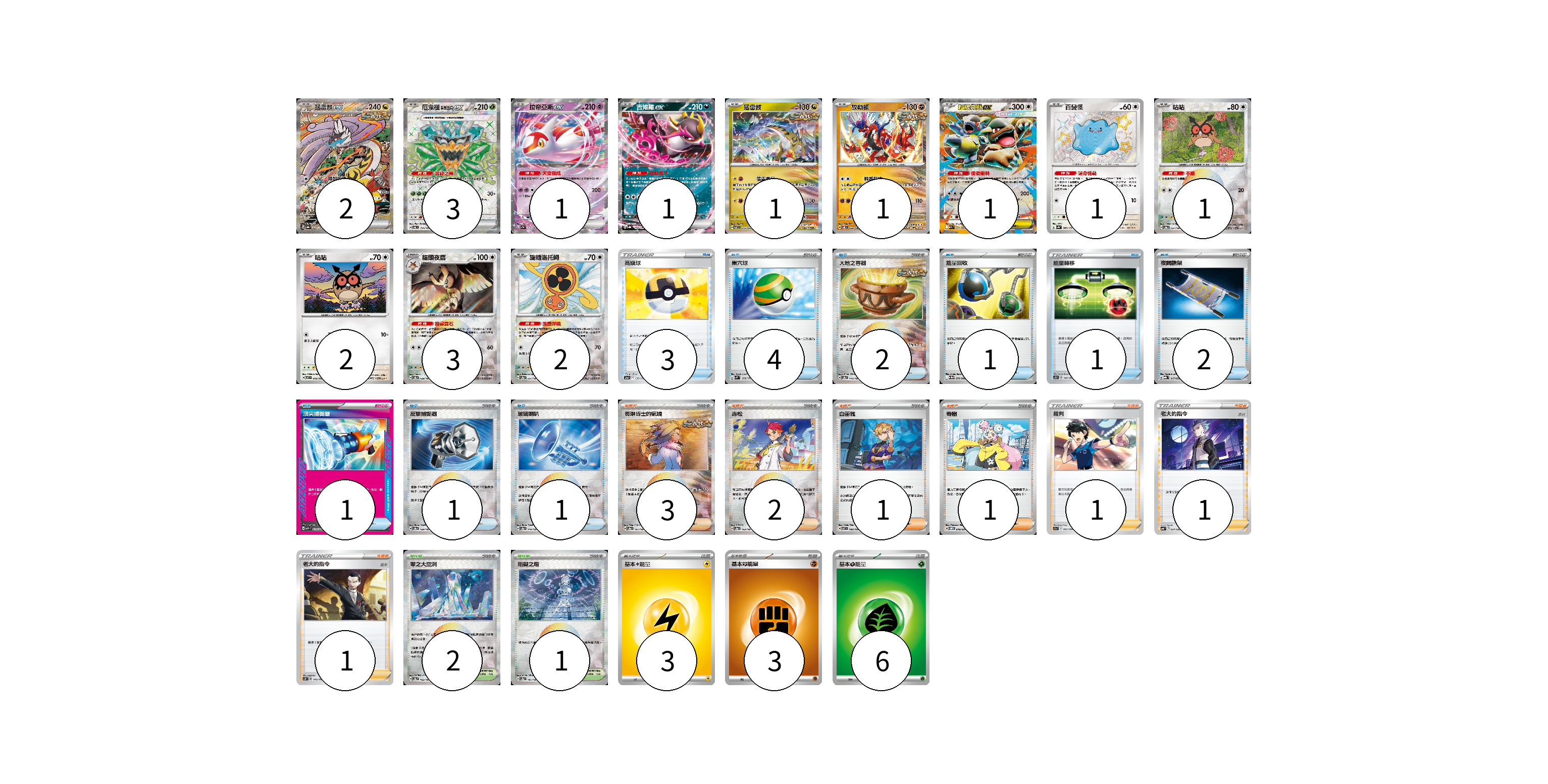 牌組構築方案 以此牌組為基礎新構築牌組 顯示卡面 顯示列表 寶可夢卡(19) 2 3 1 1 1 1 1 1 1 2 3 2 物品卡(16) 3 4 2 1 1 2 1 1 1 支援者卡(10) 3 2 1 1 1 1 1 競技場卡(3) 2 1 能量卡(12) 3 3 6 寶可夢卡(19) 卡牌名稱 張數 卡牌名稱 張數 猛雷鼓ex SV8a 222/187 02 厄鬼椪 碧草面具ex SV6 114/101 03 拉帝亞斯ex SV7a 019/064 01 吉雉雞ex SV8a 104/187 01 猛雷鼓 SV7 075/102 01 故勒頓 SV8 069/106 01 超級袋獸ex M1S 051/063 01 百變怪 SV4a 309/190 01 咕咕 SV8a 127/187 01 咕咕 SV7 076/102 02 貓頭夜鷹 SV8a 128/187 03 旋轉洛托姆 SV8a 131/187 02 物品卡(16) 卡牌名稱 張數 卡牌名稱 張數 高級球 S12a 138/172 03 巢穴球 SVM 133/175 04 大地之容器 SV8a 143/187 02 能量回收 SV11W 079/086 01 能量轉移 SC1D 146/164 01 夜間擔架 MBG 017/022 02 頂尖捕捉器 MBG 014/022 01 反擊捕捉器 SV8a 139/187 01 玻璃喇叭 SV8a 140/187 01 支援者卡(10) 卡牌名稱 張數 卡牌名稱 張數 奧琳博士的氣魄 SV8a 167/187 03 赤松 SV8a 163/187 02 白蕾雅 SV7 100/102 01 奇樹 SVOM 018/021 01 裁判 S11a 063/068 01 老大的指令(赤日) SVB 024/028 01 老大的指令(坂木) SCB 140/156 01 競技場卡(3) 卡牌名稱 張數 卡牌名稱 張數 零之大空洞 SV8a 182/187 02 阻礙之塔 SV8a 181/187 01 能量卡(12) 卡牌名稱 張數 卡牌名稱 張數 基本雷能量 sv-p LIG 03 基本【鬥】能量 SVAM FIG 03 基本草能量 sv-p GRA 06 以此牌組為基礎新構築牌組 牌組編碼 XeTgRo-PLRPln-GrAYFO copy 列印牌組單 牌組編碼已複製 分享至SNS