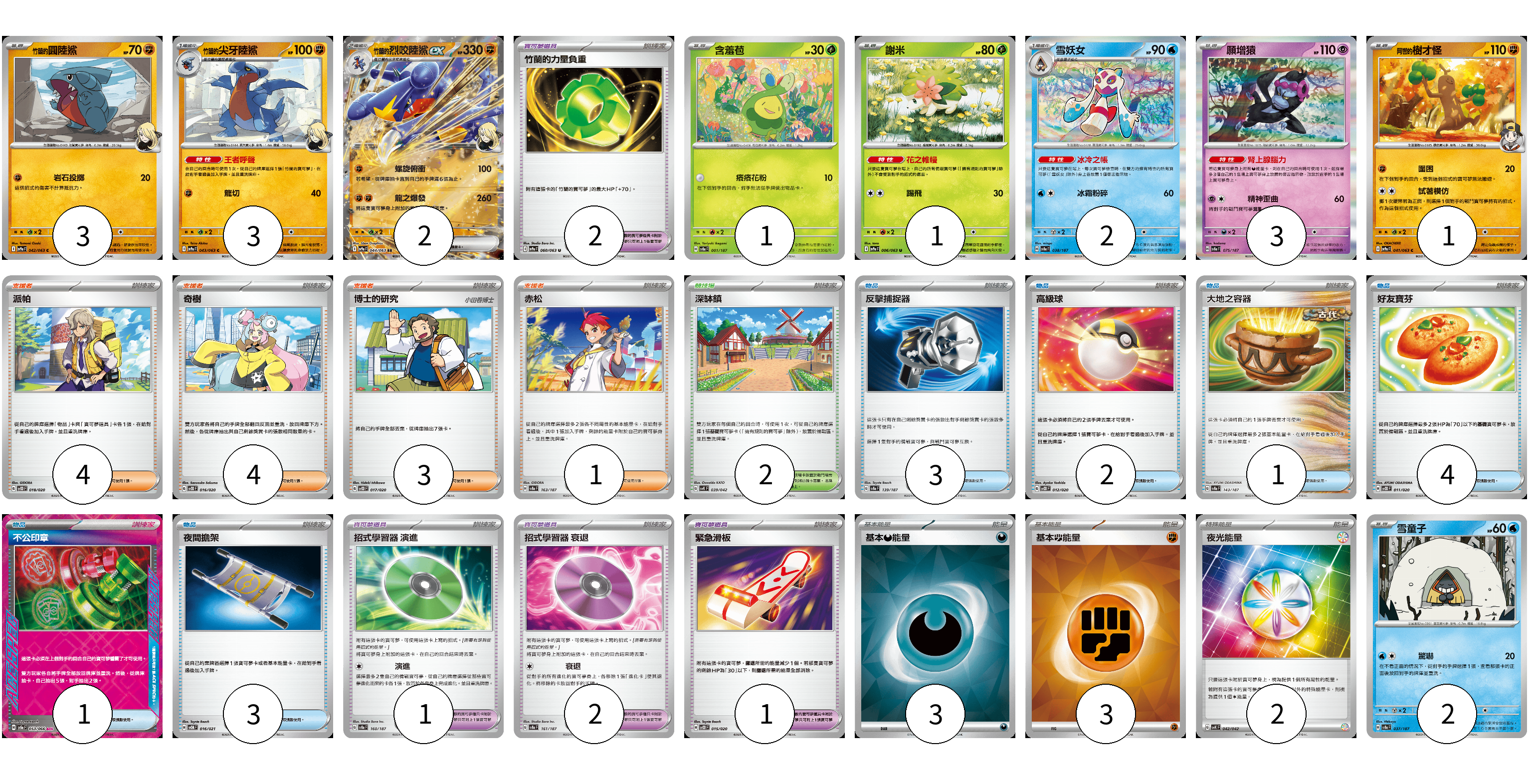牌組構築方案 以此牌組為基礎新構築牌組 顯示卡面 顯示列表 寶可夢卡(18) 3 3 2 1 1 2 3 1 2 寶可夢道具(6) 2 1 2 1 物品卡(14) 3 2 1 4 1 3 支援者卡(12) 4 4 3 1 競技場卡(2) 2 能量卡(8) 3 3 2 寶可夢卡(18) 卡牌名稱 張數 卡牌名稱 張數 <竹蘭的>圓陸鯊 SV9a 042/063 03 <竹蘭的>尖牙陸鯊 SV9a 043/063 03 <竹蘭的>烈咬陸鯊ex SV9a 044/063 02 含羞苞 SV8a 001/187 01 謝米 SV9a 006/063 01 雪妖女 SV8a 038/187 02 願增猿 SV8a 075/187 03 <阿響的>樹才怪 SV9a 041/063 01 雪童子 SV8a 037/187 02 寶可夢道具(6) 卡牌名稱 張數 卡牌名稱 張數 竹蘭的力量負重 SV9a 060/063 02 招式學習器 演進 SV8a 160/187 01 招式學習器 衰退 SV8a 161/187 02 緊急滑板 SVOD 015/020 01 物品卡(14) 卡牌名稱 張數 卡牌名稱 張數 反擊捕捉器 SV8a 139/187 03 高級球 SVOD 012/020 02 大地之容器 SV8a 143/187 01 好友寶芬 SVOD 011/020 04 不公印章 SV5a 053/066 01 夜間擔架 SVOM 016/021 03 支援者卡(12) 卡牌名稱 張數 卡牌名稱 張數 派帕 SVOD 018/020 04 奇樹 SVOD 016/020 04 博士的研究 SVOD 017/020 03 赤松 SV8a 163/187 01 競技場卡(2) 卡牌名稱 張數 卡牌名稱 張數 深缽鎮 SVK 039/042 02 能量卡(8) 卡牌名稱 張數 卡牌名稱 張數 基本【惡】能量 SVOM DAR 03 基本【鬥】能量 SVK FIG 03 夜光能量 SVK 042/042 02 以此牌組為基礎新構築牌組 牌組編碼 XjNjgo-yCAOxn-oEFBna copy 列印牌組單 牌組編碼已複製 分享至SNS