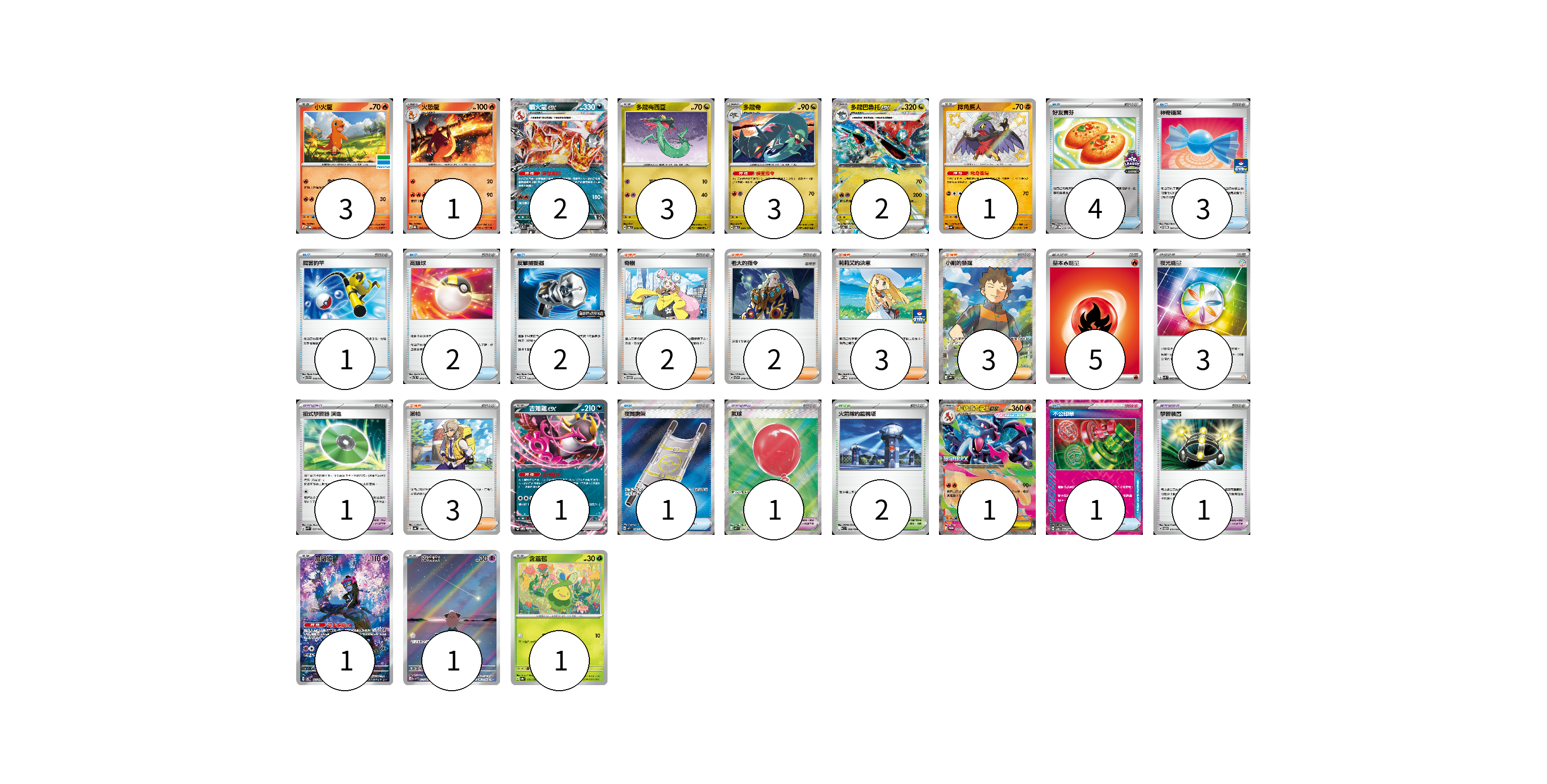 牌組構築方案 以此牌組為基礎新構築牌組 顯示卡面 顯示列表 寶可夢卡(20) 3 1 2 3 3 2 1 1 1 1 1 1 寶可夢道具(3) 1 1 1 物品卡(14) 4 3 1 2 2 1 1 支援者卡(13) 2 2 3 3 3 競技場卡(2) 2 能量卡(8) 5 3 寶可夢卡(20) 卡牌名稱 張數 卡牌名稱 張數 小火龍 SV-P 232/SV-P 03 火恐龍 SVQL 002/022 01 噴火龍ex SVTL 006/021 02 多龍梅西亞 SV6 079/101 03 多龍奇 SV6 080/101 03 多龍巴魯托ex SV6 081/101 02 摔角鷹人 SV4a 282/190 01 吉雉雞ex SVOM 009/021 01 超級噴火龍Xex M-P 029/M-P 01 願增猿 SV6 107/101 01 皮寶寶 SV3 113/108 01 含羞苞 SV8a 001/187 01 寶可夢道具(3) 卡牌名稱 張數 卡牌名稱 張數 招式學習器 演進 SVK 025/042 01 氣球 M1L 084/063 01 學習裝置 SVTM 016/022 01 物品卡(14) 卡牌名稱 張數 卡牌名稱 張數 好友寶芬 SV-P 230/SV-P 04 神奇糖果 SV-P 104/SV-P 03 厲害釣竿 SVTH 008/018 01 高級球 SVTL 012/021 02 反擊捕捉器 SV-P 136/SV-P 02 夜間擔架 M1L 083/063 01 不公印章 SV5a 053/066 01 支援者卡(13) 卡牌名稱 張數 卡牌名稱 張數 奇樹 SVTM 017/022 02 老大的指令 SVTG 019/019 02 莉莉艾的決意 M-P 018/M-P 03 小剛的發掘 SV9 123/100 03 派帕 SV4a 180/190 03 競技場卡(2) 卡牌名稱 張數 卡牌名稱 張數 火箭隊的監視塔 SV10 096/098 02 能量卡(8) 卡牌名稱 張數 卡牌名稱 張數 基本火能量 sv-p FIR 05 夜光能量 SVK 042/042 03 以此牌組為基礎新構築牌組 牌組編碼 XjXghq-NRoKTK-PXYHQM copy 列印牌組單 牌組編碼已複製 分享至SNS