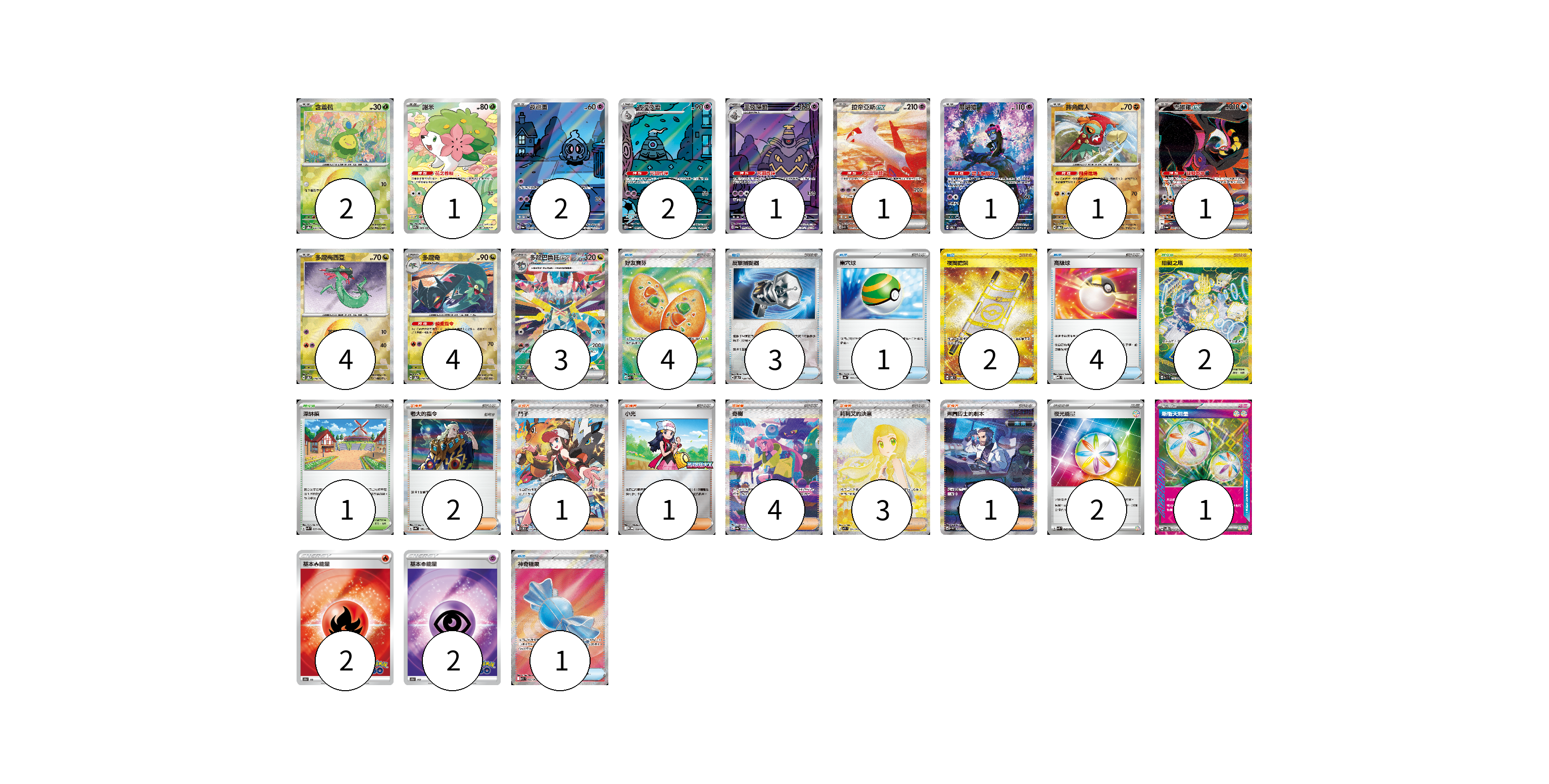 牌組構築方案 以此牌組為基礎新構築牌組 顯示卡面 顯示列表 寶可夢卡(23) 2 1 2 2 1 1 1 1 1 4 4 3 物品卡(15) 4 3 1 2 4 1 支援者卡(12) 2 1 1 4 3 1 競技場卡(3) 2 1 能量卡(7) 2 1 2 2 寶可夢卡(23) 卡牌名稱 張數 卡牌名稱 張數 含羞苞 SV8a 001/187 02 謝米 SV9a 066/063 01 夜巡靈 SV6a 068/064 02 彷徨夜靈 SV6a 069/064 02 黑夜魔靈 SV6a 070/064 01 拉帝亞斯ex SV7a 087/064 01 願增猿 SV6 107/101 01 摔角鷹人 SV8a 084/187 01 吉雉雞ex SV6a 089/064 01 多龍梅西亞 SV8a 118/187 04 多龍奇 SV8a 119/187 04 多龍巴魯托ex SV8a 221/187 03 物品卡(15) 卡牌名稱 張數 卡牌名稱 張數 好友寶芬 M1S 081/063 04 反擊捕捉器 SV8a 139/187 03 巢穴球 SV4a 159/190 01 夜間擔架 SV8 137/106 02 高級球 MBD 014/022 04 神奇糖果 M1S 082/063 01 支援者卡(12) 卡牌名稱 張數 卡牌名稱 張數 老大的指令 SV4a 181/190 02 鬥子 SV11W 173/086 01 小光 M-P 028/M-P 01 奇樹 SV4a 350/190 04 莉莉艾的決意 M1L 091/063 03 弗圖博士的劇本 SV4M 091/066 01 競技場卡(3) 卡牌名稱 張數 卡牌名稱 張數 阻礙之塔 SV10 132/098 02 深缽鎮 SVK 039/042 01 能量卡(7) 卡牌名稱 張數 卡牌名稱 張數 夜光能量 SVK 042/042 02 新衝天能量 SV5K 071/071 01 基本火能量 S10b FIR 02 基本超能量 S10b PSY 02 以此牌組為基礎新構築牌組 牌組編碼 XjgDHT-IeNpZP-pofCWI copy 列印牌組單 牌組編碼已複製 分享至SNS