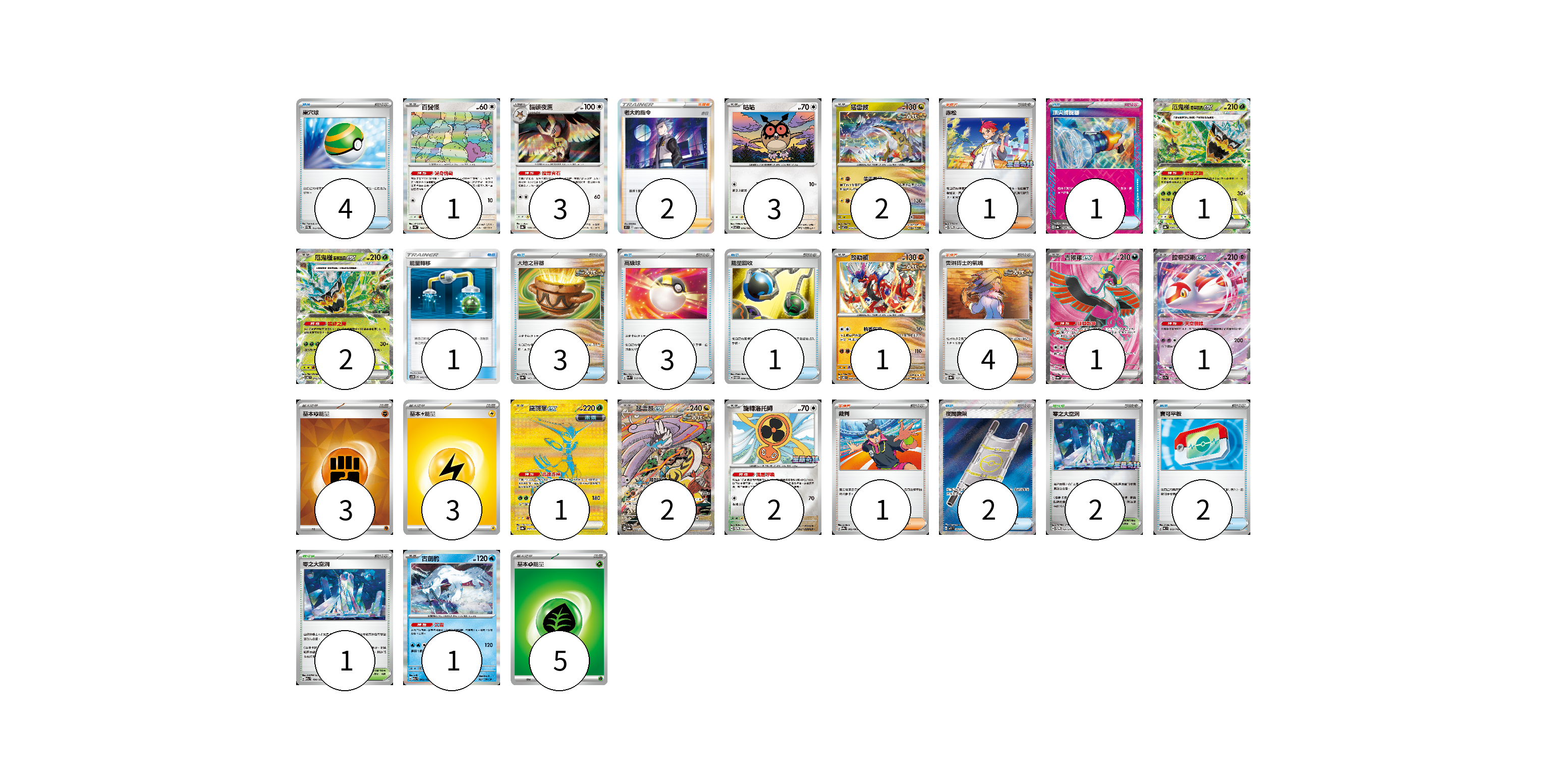 牌組構築方案 以此牌組為基礎新構築牌組 顯示卡面 顯示列表 寶可夢卡(21) 1 3 3 2 1 2 1 1 1 1 2 2 1 物品卡(17) 4 1 1 3 3 1 2 2 支援者卡(8) 2 1 4 1 競技場卡(3) 2 1 能量卡(11) 3 3 5 寶可夢卡(21) 卡牌名稱 張數 卡牌名稱 張數 百變怪 SV4a 144/190 01 貓頭夜鷹 SV8a 128/187 03 咕咕 SV7 076/102 03 猛雷鼓 SV7 075/102 02 厄鬼椪 碧草面具ex SV8a 020/187 01 厄鬼椪 碧草面具ex SV6 016/101 02 故勒頓 SV8 069/106 01 吉雉雞ex SV6a 081/064 01 拉帝亞斯ex SV7a 019/064 01 鐵斑葉ex SV8a 233/187 01 猛雷鼓ex SV8a 222/187 02 旋轉洛托姆 SV-P 146/SV-P 02 古劍豹 M2a 043/193 01 物品卡(17) 卡牌名稱 張數 卡牌名稱 張數 巢穴球 SVEM 012/020 04 頂尖捕捉器 SV8a 148/187 01 能量轉移 AS5D 140/169 01 大地之容器 SV8a 143/187 03 高級球 SVK 018/042 03 能量回收 SVTM 009/022 01 夜間擔架 M1L 083/063 02 寶可平板 MC 662/742 02 支援者卡(8) 卡牌名稱 張數 卡牌名稱 張數 老大的指令(赤日) S9 097/100 02 赤松 SV-P 150/SV-P 01 奧琳博士的氣魄 SV8a 167/187 04 裁判 SV9a 062/063 01 競技場卡(3) 卡牌名稱 張數 卡牌名稱 張數 零之大空洞 SV-P 151/SV-P 02 零之大空洞 M2a 184/193 01 能量卡(11) 卡牌名稱 張數 卡牌名稱 張數 基本【鬥】能量 SVK FIG 03 基本【雷】能量 SVTR LIG 03 基本草能量 sv-p GRA 05 以此牌組為基礎新構築牌組 牌組編碼 XkFYGK-oLgXcE-Ljokrd copy 列印牌組單 牌組編碼已複製 分享至SNS