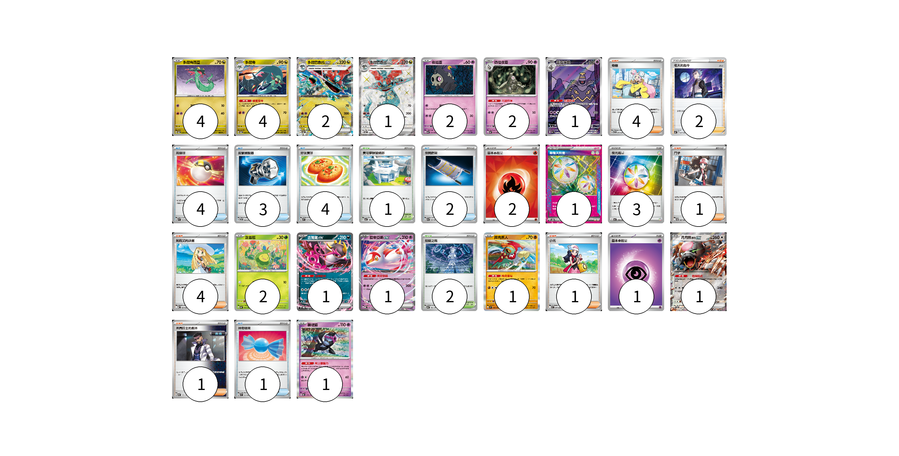 牌組構築方案 以此牌組為基礎新構築牌組 顯示卡面 顯示列表 寶可夢卡(23) 4 4 2 1 2 2 1 2 1 1 1 1 1 物品卡(14) 4 3 4 2 1 支援者卡(13) 4 2 1 4 1 1 競技場卡(3) 1 2 能量卡(7) 2 1 3 1 寶可夢卡(23) 卡牌名稱 張數 卡牌名稱 張數 多龍梅西亞 SV6 079/101 04 多龍奇 SV6 080/101 04 多龍巴魯托ex SV6 081/101 02 多龍巴魯托ex SV6 120/101 01 夜巡靈 SV6a 018/064 02 彷徨夜靈 SV6a 019/064 02 黑夜魔靈 SV6a 070/064 01 含羞苞 SV8a 001/187 02 吉雉雞ex SVOD 004/020 01 拉帝亞斯ex MBD 003/022 01 摔角鷹人 SV1S 045/078 01 月月熊 赫月 ex SV5a 052/066 01 願增猿 SV8a 075/187 01 物品卡(14) 卡牌名稱 張數 卡牌名稱 張數 高級球 SVK 018/042 04 反擊捕捉器 SVTS 009/022 03 好友寶芬 SVK 015/042 04 夜間擔架 SV6a 056/064 02 神奇糖果 SVK 019/042 01 支援者卡(13) 卡牌名稱 張數 卡牌名稱 張數 奇樹 SVTR 017/021 04 老大的指令(赤日) SVB 024/028 02 鬥子 SV11W 085/086 01 莉莉艾的決意 MBD 021/022 04 小光 M2 077/080 01 弗圖博士的劇本 SV8a 175/187 01 競技場卡(3) 卡牌名稱 張數 卡牌名稱 張數 寶可夢聯盟總部 SV4a 186/190 01 阻礙之塔 SV8a 181/187 02 能量卡(7) 卡牌名稱 張數 卡牌名稱 張數 基本【火】能量 SVK FIR 02 新衝天能量 SV5K 071/071 01 夜光能量 SV4a 190/190 03 基本【超】能量 M-P PSY 01 以此牌組為基礎新構築牌組 牌組編碼 XmEaUB-awiFWM-aZktsk copy 列印牌組單 牌組編碼已複製 分享至SNS