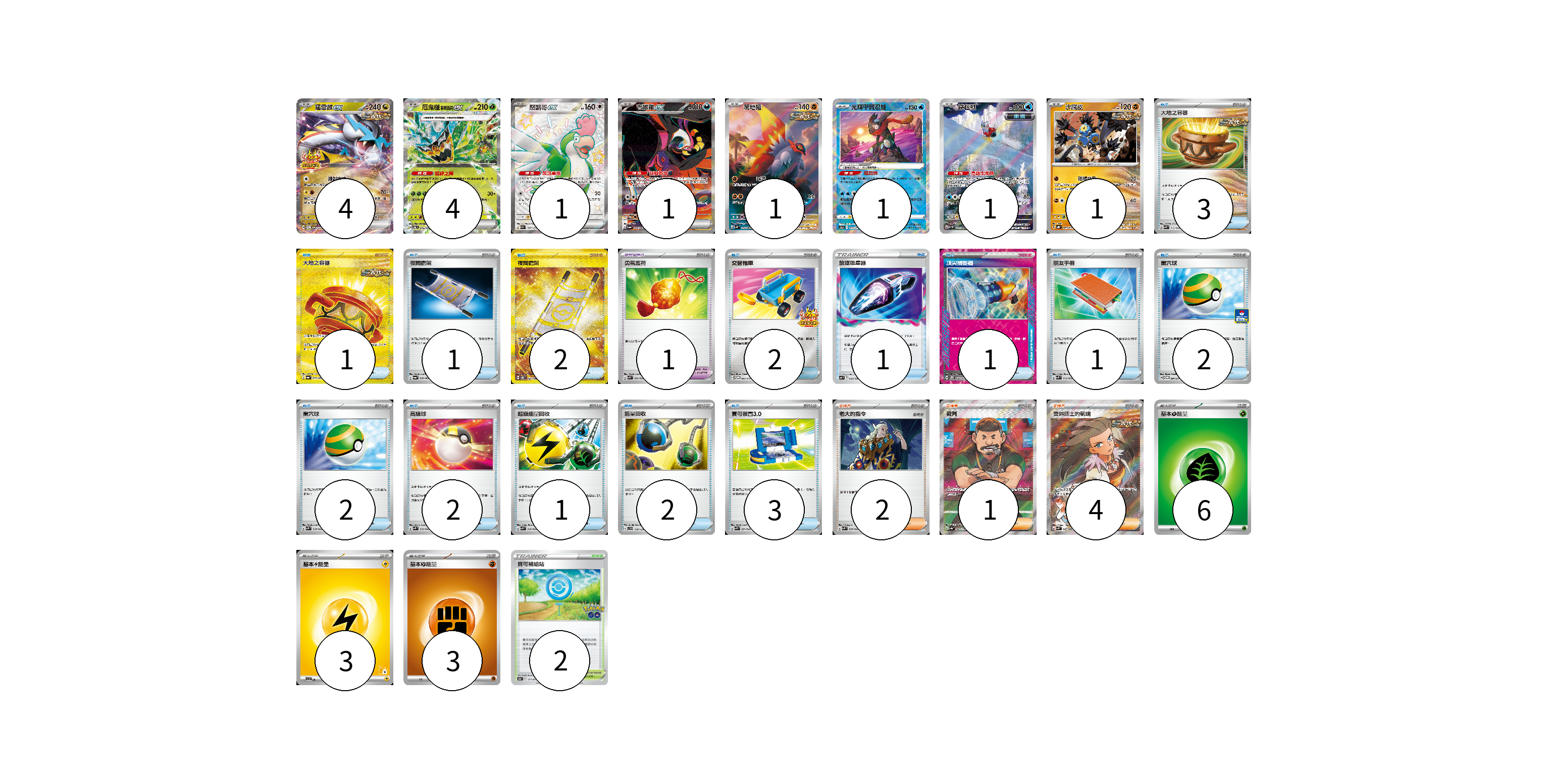 牌組構築方案 以此牌組為基礎新構築牌組 顯示卡面 顯示列表 寶可夢卡(14) 4 4 1 1 1 1 1 1 寶可夢道具(1) 1 物品卡(24) 3 1 1 2 2 1 1 1 2 2 2 1 2 3 支援者卡(7) 2 1 4 競技場卡(2) 2 能量卡(12) 6 3 3 寶可夢卡(14) 卡牌名稱 張數 卡牌名稱 張數 猛雷鼓ex SV-P 081/SV-P 04 厄鬼椪 碧草面具ex SV6 016/101 04 怒鸚哥ex SV4a 337/190 01 吉雉雞ex SV6a 089/064 01 爬地翅 SV4K 074/066 01 光輝甲賀忍蛙 S12a 033/172 01 鐵包袱 SV4M 071/066 01 沙鐵皮 SVHK 009/022 01 寶可夢道具(1) 卡牌名稱 張數 卡牌名稱 張數 勇氣護符 SVK 024/042 01 物品卡(24) 卡牌名稱 張數 卡牌名稱 張數 大地之容器 SVK 012/042 03 大地之容器 SV6a 093/064 01 夜間擔架 SV6a 056/064 01 夜間擔架 SV8 137/106 02 交替推車 SV-P 082/SV-P 02 放逐吸塵器 SVF 023/038 01 頂尖捕捉器 SV5M 062/071 01 朋友手冊 SVK 014/042 01 巢穴球 SV-P 091/SV-P 02 巢穴球 SVK 016/042 02 高級球 SVK 018/042 02 超級能量回收 SVK 010/042 01 能量回收 SVD 110/139 02 寶可裝置3.0 SVK 021/042 03 支援者卡(7) 卡牌名稱 張數 卡牌名稱 張數 老大的指令 SVK 036/042 02 裁判 SV4a 342/190 01 奧琳博士的氣魄 SV4K 085/066 04 競技場卡(2) 卡牌名稱 張數 卡牌名稱 張數 寶可補給站 S10b 071/071 02 能量卡(12) 卡牌名稱 張數 卡牌名稱 張數 基本【草】能量 SVTM GRA 06 基本【雷】能量 SVI LIG 03 基本【鬥】能量 SVHK FIG 03 以此牌組為基礎新構築牌組 牌組編碼 Xmxqvh-MItKRt-HIBplc copy 列印牌組單 牌組編碼已複製 分享至SNS