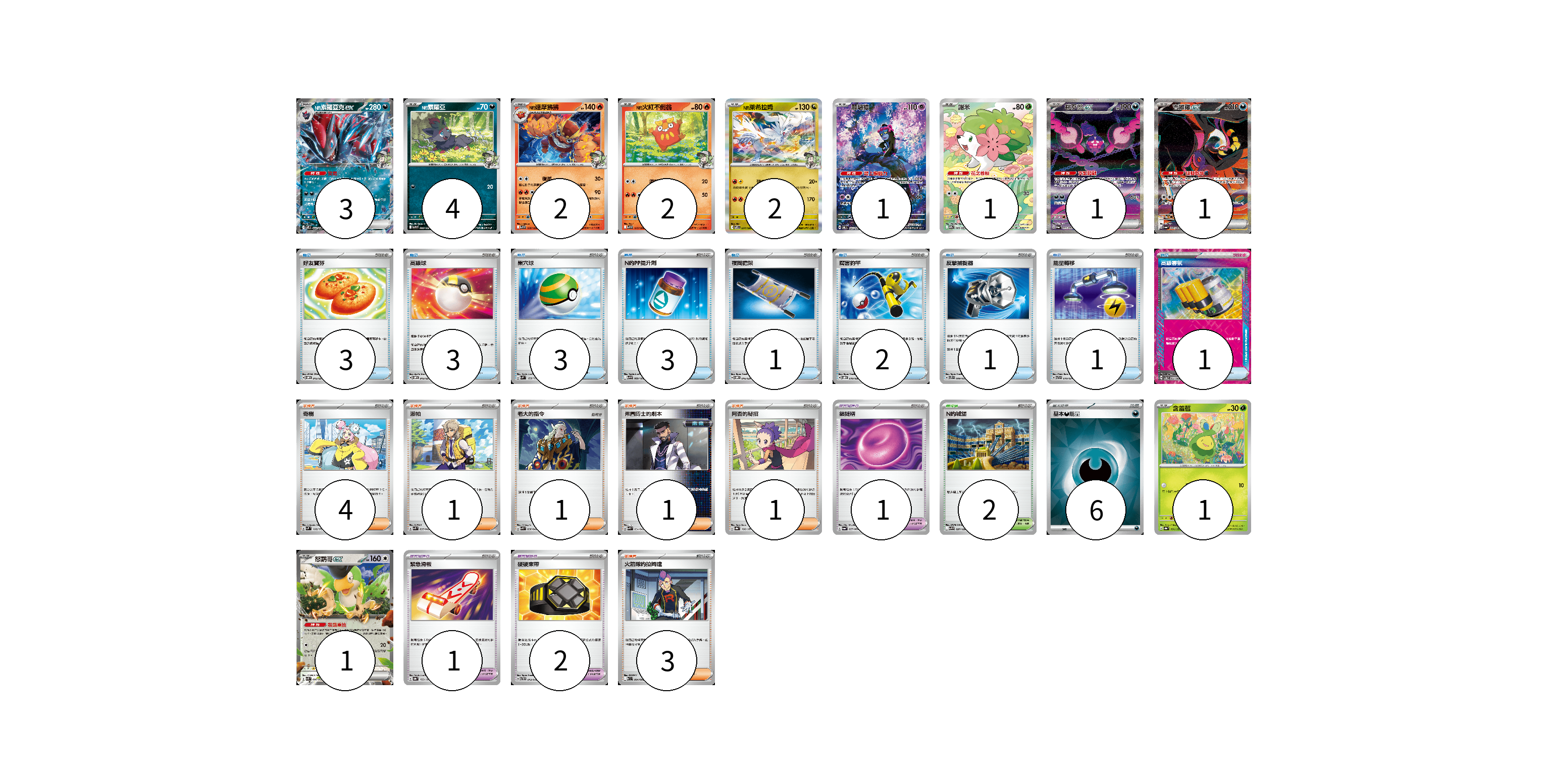 牌組構築方案 以此牌組為基礎新構築牌組 顯示卡面 顯示列表 寶可夢卡(19) 3 4 2 2 2 1 1 1 1 1 1 寶可夢道具(4) 1 1 2 物品卡(18) 3 3 3 3 1 2 1 1 1 支援者卡(11) 4 1 1 1 1 3 競技場卡(2) 2 能量卡(6) 6 寶可夢卡(19) 卡牌名稱 張數 卡牌名稱 張數 N的索羅亞克ex SV9 061/100 03 N的索羅亞 SV9 060/100 04 N的達摩狒狒 SV9 016/100 02 N的火紅不倒翁 SV9 015/100 02 N的萊希拉姆 SV9 074/100 02 願增猿 SV6 107/101 01 謝米 SV9a 066/063 01 桃歹郎ex SV6a 090/064 01 吉雉雞ex SV6a 089/064 01 含羞苞 SV8a 001/187 01 怒鸚哥ex SVK 006/042 01 寶可夢道具(4) 卡牌名稱 張數 卡牌名稱 張數 鎖鏈糬 SV6a 057/064 01 緊急滑板 SV8a 153/187 01 硬硬束帶 SVTH 013/018 02 物品卡(18) 卡牌名稱 張數 卡牌名稱 張數 好友寶芬 SVOM 012/021 03 高級球 SVOM 013/021 03 巢穴球 SVM 133/175 03 N的PP提升劑 SV9 089/100 03 夜間擔架 SVOM 016/021 01 厲害釣竿 SVOD 010/020 02 反擊捕捉器 SVTS 009/022 01 能量轉移 SVTR 010/021 01 高級香氛 SV5a 055/066 01 支援者卡(11) 卡牌名稱 張數 卡牌名稱 張數 奇樹 SVM 160/175 04 派帕 SVK 035/042 01 老大的指令 SVK 036/042 01 弗圖博士的劇本 SVK 034/042 01 阿杏的秘招 SV8a 166/187 01 火箭隊的拉姆達 SV10 094/098 03 競技場卡(2) 卡牌名稱 張數 卡牌名稱 張數 N的城堡 SV9 097/100 02 能量卡(6) 卡牌名稱 張數 卡牌名稱 張數 基本【惡】能量 SVOM DAR 06 以此牌組為基礎新構築牌組 牌組編碼 XoRhyf-PHefOP-FwoxMF copy 列印牌組單 牌組編碼已複製 分享至SNS