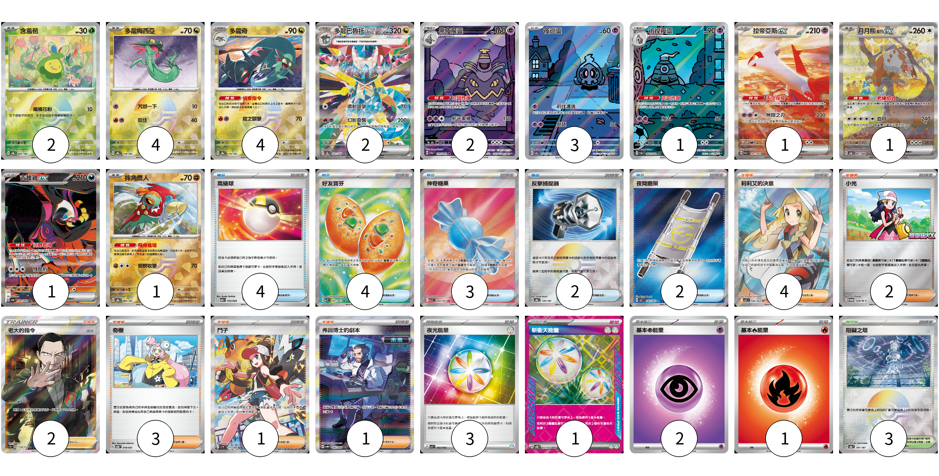 牌組構築方案 以此牌組為基礎新構築牌組 顯示卡面 顯示列表 寶可夢卡(22) 2 4 4 2 2 3 1 1 1 1 1 物品卡(15) 4 4 3 2 2 支援者卡(13) 4 2 2 3 1 1 競技場卡(3) 3 能量卡(7) 3 1 2 1 寶可夢卡(22) 卡牌名稱 張數 卡牌名稱 張數 含羞苞 SV8a 001/187 02 多龍梅西亞 SV8a 118/187 04 多龍奇 SV8a 119/187 04 多龍巴魯托ex SV8a 221/187 02 黑夜魔靈 SV6a 070/064 02 夜巡靈 SV6a 068/064 03 彷徨夜靈 SV6a 069/064 01 拉帝亞斯ex SV7a 087/064 01 月月熊 赫月 ex SV5a 091/066 01 吉雉雞ex SV6a 089/064 01 摔角鷹人 SV8a 084/187 01 物品卡(15) 卡牌名稱 張數 卡牌名稱 張數 高級球 MBG 012/022 04 好友寶芬 M1S 081/063 04 神奇糖果 M1S 082/063 03 反擊捕捉器 SV8a 139/187 02 夜間擔架 M1L 083/063 02 支援者卡(13) 卡牌名稱 張數 卡牌名稱 張數 莉莉艾的決意 M1L 086/063 04 小光 M-P 028/M-P 02 老大的指令(坂木) SC1b 170/153 02 奇樹 SVOM 018/021 03 鬥子 SV11W 173/086 01 弗圖博士的劇本 SV4M 091/066 01 競技場卡(3) 卡牌名稱 張數 卡牌名稱 張數 阻礙之塔 SV8a 181/187 03 能量卡(7) 卡牌名稱 張數 卡牌名稱 張數 夜光能量 SVK 042/042 03 新衝天能量 SV5K 071/071 01 基本【超】能量 M-P PSY 02 基本【火】能量 M-P FIR 01 以此牌組為基礎新構築牌組 牌組編碼 XoiYyi-WhMwLk-fqsADu copy 列印牌組單 牌組編碼已複製 分享至SNS