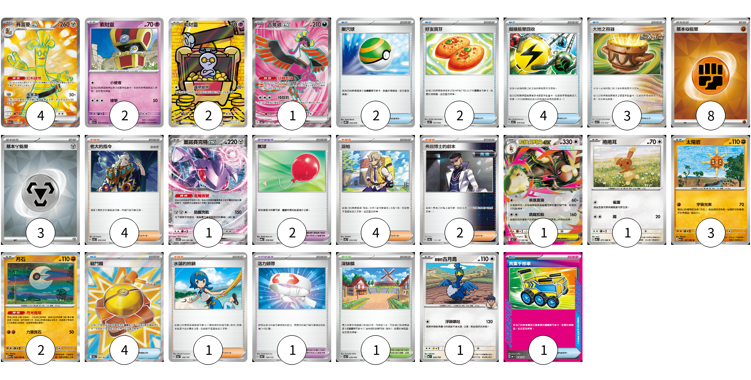 牌組構築方案 以此牌組為基礎新構築牌組 顯示卡面 顯示列表 寶可夢卡(18) 4 2 2 1 1 1 1 3 2 1 寶可夢道具(3) 2 1 物品卡(16) 2 2 4 3 4 1 支援者卡(11) 4 4 2 1 競技場卡(1) 1 能量卡(11) 8 3 寶可夢卡(18) 卡牌名稱 張數 卡牌名稱 張數 賽富豪ex SV3a 079/062 04 索財靈 SV7a 024/064 02 索財靈 SV3a 068/062 02 吉雉雞ex SV6a 081/064 01 蓋諾賽克特ex SV11B 069/086 01 超級長耳兔ex M2 072/080 01 捲捲耳 M2 071/080 01 太陽岩 M1L 027/063 03 月石 M1L 026/063 02 <赫普的>古月鳥 MC 624/742 01 寶可夢道具(3) 卡牌名稱 張數 卡牌名稱 張數 氣球 MBD 018/022 02 活力頭帶 SVM 140/175 01 物品卡(16) 卡牌名稱 張數 卡牌名稱 張數 巢穴球 SVTG 012/019 02 好友寶芬 SVK 015/042 02 超級能量回收 SVK 010/042 04 大地之容器 SVK 012/042 03 戰鬥鑼 M1L 082/063 04 貴重手推車 MC 658/742 01 支援者卡(11) 卡牌名稱 張數 卡牌名稱 張數 老大的指令 SVK 036/042 04 派帕 SVK 035/042 04 弗圖博士的劇本 SV8a 175/187 02 水蓮的照顧 SV8a 168/187 01 競技場卡(1) 卡牌名稱 張數 卡牌名稱 張數 深缽鎮 SVK 039/042 01 能量卡(11) 卡牌名稱 張數 卡牌名稱 張數 基本【鬥】能量 SVK FIG 08 基本【鋼】能量 SVK MET 03 以此牌組為基礎新構築牌組 牌組編碼 XpNTgh-MrBcsJ-ZSdCPt copy 列印牌組單 牌組編碼已複製 分享至SNS