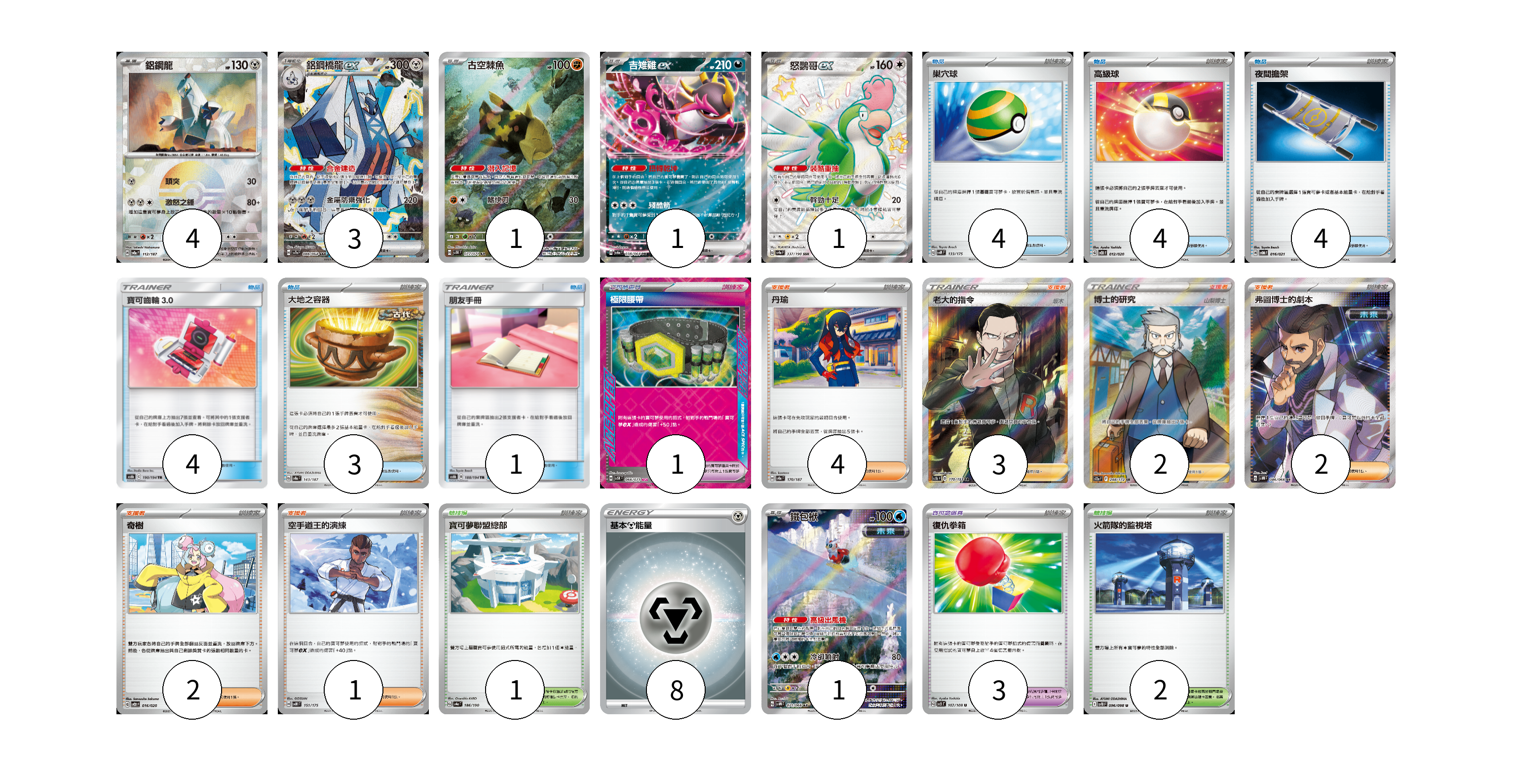 牌組構築方案 以此牌組為基礎新構築牌組 顯示卡面 顯示列表 寶可夢卡(11) 4 3 1 1 1 1 寶可夢道具(4) 1 3 物品卡(20) 4 4 4 4 3 1 支援者卡(14) 4 3 2 2 2 1 競技場卡(3) 1 2 能量卡(8) 8 寶可夢卡(11) 卡牌名稱 張數 卡牌名稱 張數 鋁鋼龍 SV8a 112/187 04 鋁鋼橋龍ex SV7a 088/064 03 古空棘魚 SV5K 077/071 01 吉雉雞ex SV6a 038/064 01 怒鸚哥ex SV4a 337/190 01 鐵包袱 SV4M 071/066 01 寶可夢道具(4) 卡牌名稱 張數 卡牌名稱 張數 極限腰帶 SV5K 066/071 01 復仇拳箱 SV3 102/108 03 物品卡(20) 卡牌名稱 張數 卡牌名稱 張數 巢穴球 SVM 133/175 04 高級球 SVOD 012/020 04 夜間擔架 SVOM 016/021 04 寶可齒輪3.0 AS6b 190/194 04 大地之容器 SV8a 143/187 03 朋友手冊 AS6b 188/194 01 支援者卡(14) 卡牌名稱 張數 卡牌名稱 張數 丹瑜 SV8a 170/187 04 老大的指令(坂木) SC1b 170/153 03 博士的研究(山梨博士) S12a 248/172 02 弗圖博士的劇本 SV4M 086/066 02 奇樹 SVOD 016/020 02 空手道王的演練 SVM 151/175 01 競技場卡(3) 卡牌名稱 張數 卡牌名稱 張數 寶可夢聯盟總部 SV4a 186/190 01 火箭隊的監視塔 SV10 096/098 02 能量卡(8) 卡牌名稱 張數 卡牌名稱 張數 基本【鋼】能量 SI MET 08 以此牌組為基礎新構築牌組 牌組編碼 XraJZw-EpExkl-zmxwBQ copy 列印牌組單 牌組編碼已複製 分享至SNS