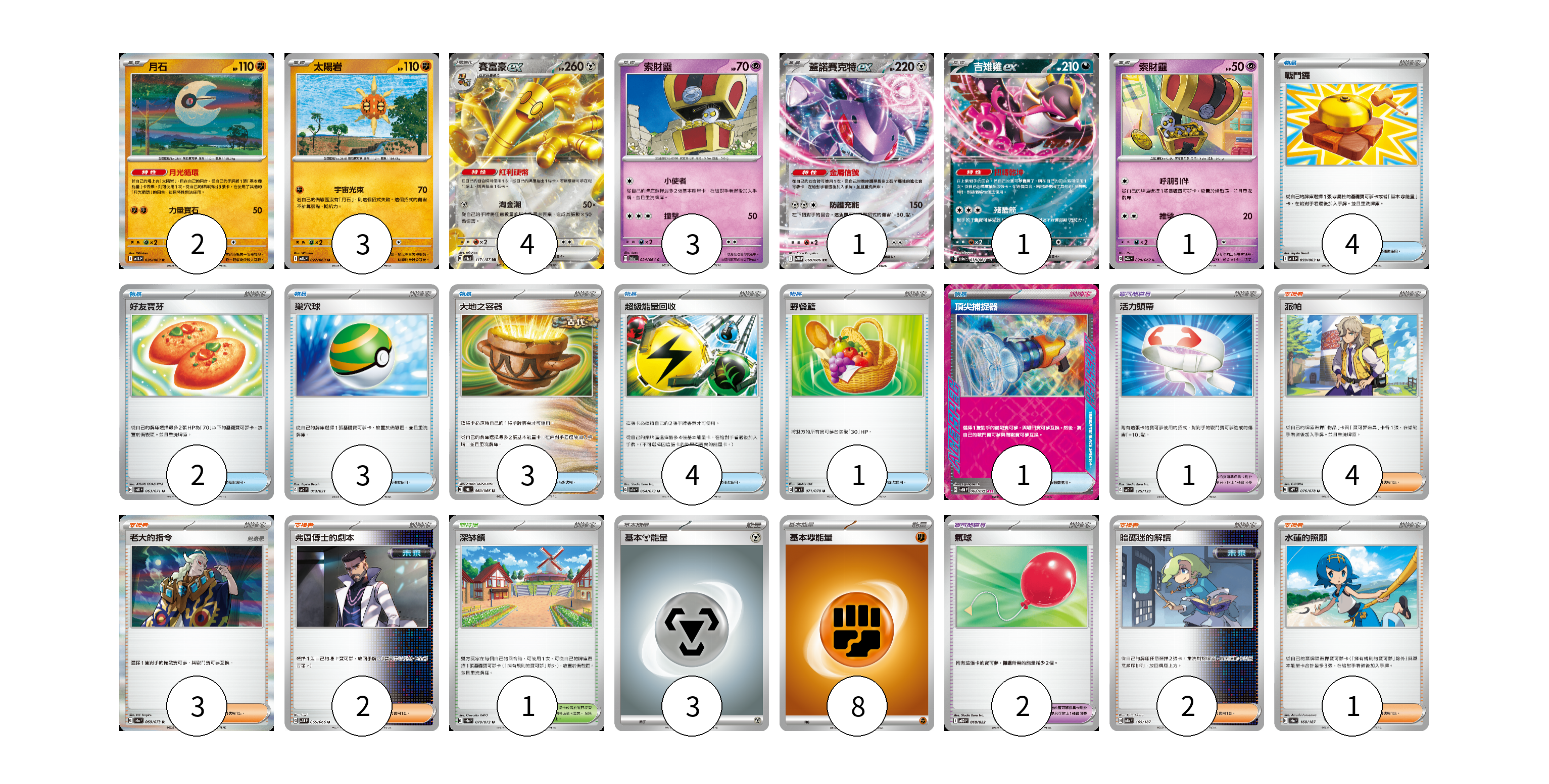 牌組構築方案 以此牌組為基礎新構築牌組 顯示卡面 顯示列表 寶可夢卡(15) 2 3 4 3 1 1 1 寶可夢道具(3) 1 2 物品卡(18) 4 2 3 3 4 1 1 支援者卡(12) 4 3 2 2 1 競技場卡(1) 1 能量卡(11) 3 8 寶可夢卡(15) 卡牌名稱 張數 卡牌名稱 張數 月石 M1L 026/063 02 太陽岩 M1L 027/063 03 賽富豪ex SV8a 117/187 04 索財靈 SV7a 024/064 03 蓋諾賽克特ex SV11B 069/086 01 吉雉雞ex SV6a 038/064 01 索財靈 SV3a 020/062 01 寶可夢道具(3) 卡牌名稱 張數 卡牌名稱 張數 活力頭帶 SVD 125/139 01 氣球 MBD 018/022 02 物品卡(18) 卡牌名稱 張數 卡牌名稱 張數 戰鬥鑼 M1L 059/063 04 好友寶芬 SV5K 063/071 02 巢穴球 SVC 013/021 03 大地之容器 SV4K 060/066 03 超級能量回收 SV1a 064/073 04 野餐籃 SV1V 071/078 01 頂尖捕捉器 SV5M 062/071 01 支援者卡(12) 卡牌名稱 張數 卡牌名稱 張數 派帕 SV1V 076/078 04 老大的指令 SV1a 069/073 03 弗圖博士的劇本 SV4M 065/066 02 暗碼迷的解讀 SV8a 165/187 02 水蓮的照顧 SV8a 168/187 01 競技場卡(1) 卡牌名稱 張數 卡牌名稱 張數 深缽鎮 SV1a 070/073 01 能量卡(11) 卡牌名稱 張數 卡牌名稱 張數 基本鋼能量 sv-p MET 03 基本【鬥】能量 SVAM FIG 08 以此牌組為基礎新構築牌組 牌組編碼 XrvWZP-TjMxbO-QQaCXK copy 列印牌組單 牌組編碼已複製 分享至SNS