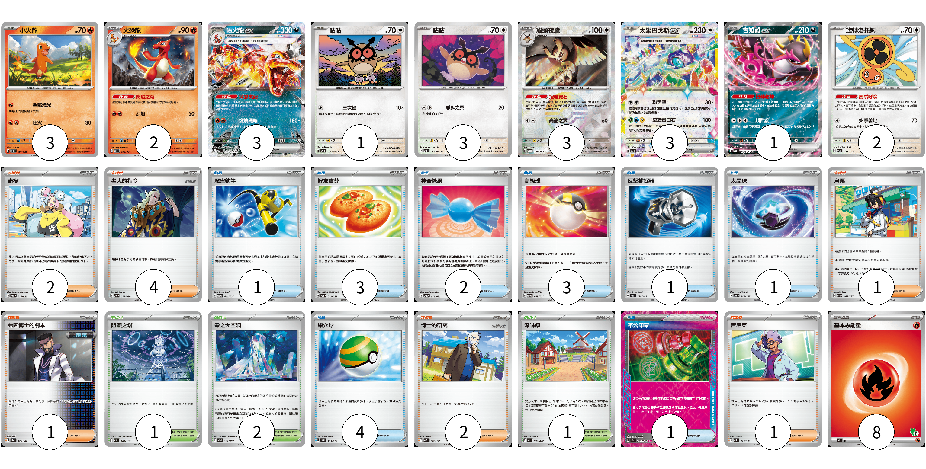 牌組構築方案 以此牌組為基礎新構築牌組 顯示卡面 顯示列表 寶可夢卡(21) 3 2 3 1 3 3 3 1 2 物品卡(16) 1 3 2 3 1 1 4 1 支援者卡(11) 2 4 1 1 2 1 競技場卡(4) 1 2 1 能量卡(8) 8 寶可夢卡(21) 卡牌名稱 張數 卡牌名稱 張數 小火龍 SVTL 001/021 03 火恐龍 SVTL 002/021 02 噴火龍ex SV3 066/108 03 咕咕 SV7 076/102 01 咕咕 SV5K 054/071 03 貓頭夜鷹 SV8a 128/187 03 太樂巴戈斯ex SV7 088/102 03 吉雉雞ex SV8a 104/187 01 旋轉洛托姆 SV8a 131/187 02 物品卡(16) 卡牌名稱 張數 卡牌名稱 張數 厲害釣竿 SVOM 011/021 01 好友寶芬 SVOM 012/021 03 神奇糖果 SVOM 014/021 02 高級球 SVOM 013/021 03 反擊捕捉器 SV8a 139/187 01 太晶珠 SV8a 145/187 01 巢穴球 SVM 133/175 04 不公印章 SV5a 053/066 01 支援者卡(11) 卡牌名稱 張數 卡牌名稱 張數 奇樹 SVOD 016/020 02 老大的指令 SVOD 019/020 04 烏栗 SV8a 169/187 01 弗圖博士的劇本 SV8a 175/187 01 博士的研究 SVM 165/175 02 吉尼亞 SVD 129/139 01 競技場卡(4) 卡牌名稱 張數 卡牌名稱 張數 阻礙之塔 SV8a 181/187 01 零之大空洞 SV8a 182/187 02 深缽鎮 SVK 039/042 01 能量卡(8) 卡牌名稱 張數 卡牌名稱 張數 基本【火】能量 SVI FIR 08 以此牌組為基礎新構築牌組 牌組編碼 Xrzbli-zwayZu-qlrbiQ copy 列印牌組單 牌組編碼已複製 分享至SNS