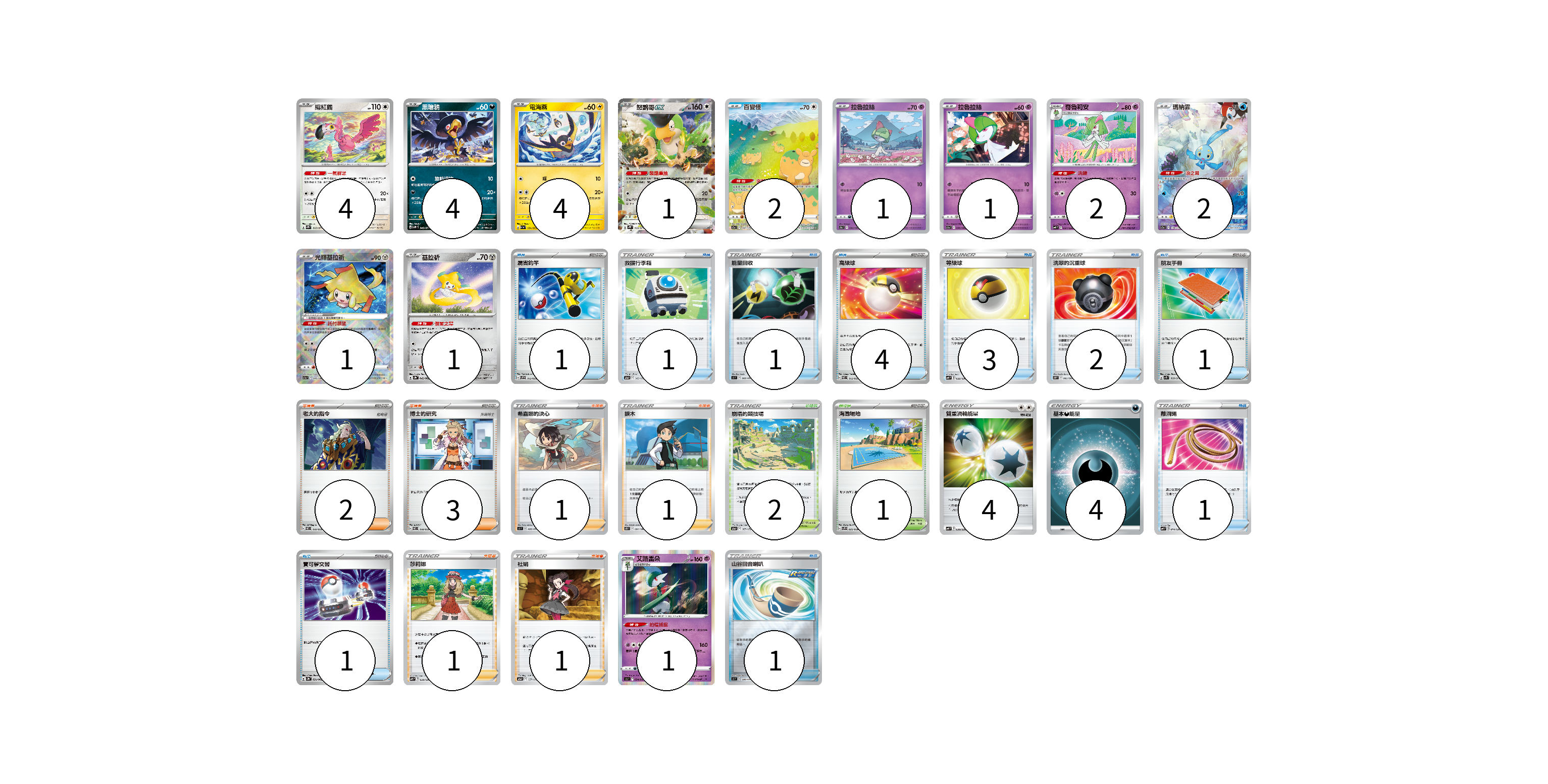 牌組構築方案 以此牌組為基礎新構築牌組 顯示卡面 顯示列表 寶可夢卡(24) 4 4 4 1 2 1 1 2 2 1 1 1 物品卡(16) 1 1 1 4 3 2 1 1 1 1 支援者卡(9) 2 3 1 1 1 1 競技場卡(3) 2 1 能量卡(8) 4 4 寶可夢卡(24) 卡牌名稱 張數 卡牌名稱 張數 纏紅鶴 SV2D 065/071 04 黑暗鴉 SV2P 045/071 04 電海燕 SV1a 031/073 04 怒鸚哥ex SV2P 065/071 01 百變怪 S12a 197/172 02 拉魯拉絲 S9a 032/067 01 拉魯拉絲 S11a 036/068 01 奇魯莉安 SVF 007/038 02 瑪納霏 S12a 178/172 02 光輝基拉祈 S11a 045/068 01 基拉祈 SV3a 042/062 01 艾路雷朵 S9a 034/067 01 物品卡(16) 卡牌名稱 張數 卡牌名稱 張數 厲害釣竿 SVF 013/038 01 救援行李箱 S12a 142/172 01 能量回收 SI 365/414 01 高級球 SVEL 012/020 04 等級球 SVF 022/038 03 洗翠的沉重球 S10P 062/067 02 朋友手冊 SV1S 069/078 01 離洞繩 SVF 010/038 01 寶可夢交替 SV3a 054/062 01 山谷回音喇叭 SI 380/414 01 支援者卡(9) 卡牌名稱 張數 卡牌名稱 張數 老大的指令 SVEL 019/020 02 博士的研究 SVEL 018/020 03 希嘉娜的決心 SI 405/414 01 捩木 S11 097/100 01 莎莉娜 SVF 028/038 01 杜娟 S12a 157/172 01 競技場卡(3) 卡牌名稱 張數 卡牌名稱 張數 崩塌的競技場 S12a 167/172 02 海灘場地 SVF 035/038 01 能量卡(8) 卡牌名稱 張數 卡牌名稱 張數 雙重渦輪能量 SVF 038/038 04 基本惡能量 SLD DAR 04 以此牌組為基礎新構築牌組 牌組編碼 XtzAej-QOteww-HlHIoc copy 列印牌組單 牌組編碼已複製 分享至SNS