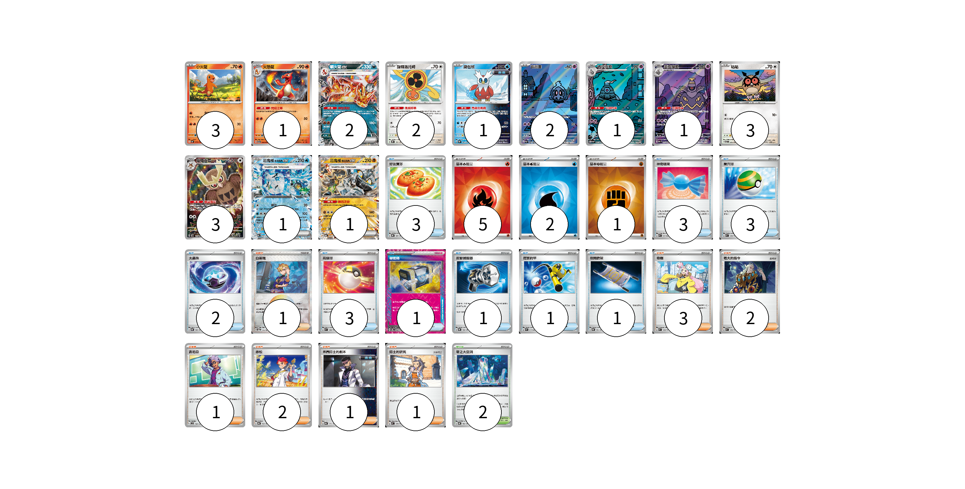 牌組構築方案 以此牌組為基礎新構築牌組 顯示卡面 顯示列表 寶可夢卡(21) 3 1 2 2 1 2 1 1 3 3 1 1 物品卡(18) 3 3 3 2 3 1 1 1 1 支援者卡(11) 1 3 2 1 2 1 1 競技場卡(2) 2 能量卡(8) 5 2 1 寶可夢卡(21) 卡牌名稱 張數 卡牌名稱 張數 小火龍 SV4a 025/190 03 火恐龍 SVTL 002/021 01 噴火龍ex SVTL 006/021 02 旋轉洛托姆 SV8a 131/187 02 鐵包袱 SV8a 047/187 01 夜巡靈 SV6a 068/064 02 彷徨夜靈 SV6a 069/064 01 黑夜魔靈 SV6a 070/064 01 咕咕 SV7 076/102 03 貓頭夜鷹 SV7 114/102 03 厄鬼椪 水井面具ex SV8a 050/187 01 厄鬼椪 礎石面具ex SV8a 091/187 01 物品卡(18) 卡牌名稱 張數 卡牌名稱 張數 好友寶芬 SV8a 147/187 03 神奇糖果 SVK 019/042 03 巢穴球 SVM 133/175 03 太晶珠 SV8a 145/187 02 高級球 SVM 134/175 03 秘密箱 SV6 092/101 01 反擊捕捉器 SV8a 139/187 01 厲害釣竿 SVK 011/042 01 夜間擔架 SV8a 151/187 01 支援者卡(11) 卡牌名稱 張數 卡牌名稱 張數 白蕾雅 SV8a 176/187 01 奇樹 SVM 160/175 03 老大的指令 SVM 172/175 02 吉尼亞 SVD 129/139 01 赤松 SV8a 163/187 02 弗圖博士的劇本 SV8a 175/187 01 博士的研究 SVM 170/175 01 競技場卡(2) 卡牌名稱 張數 卡牌名稱 張數 零之大空洞 SV8a 182/187 02 能量卡(8) 卡牌名稱 張數 卡牌名稱 張數 基本【火】能量 SVK FIR 05 基本【水】能量 SVK WAT 02 基本【鬥】能量 SVK FIG 01 以此牌組為基礎新構築牌組 牌組編碼 XusTmL-kOPdno-SCabjA copy 列印牌組單 牌組編碼已複製 分享至SNS