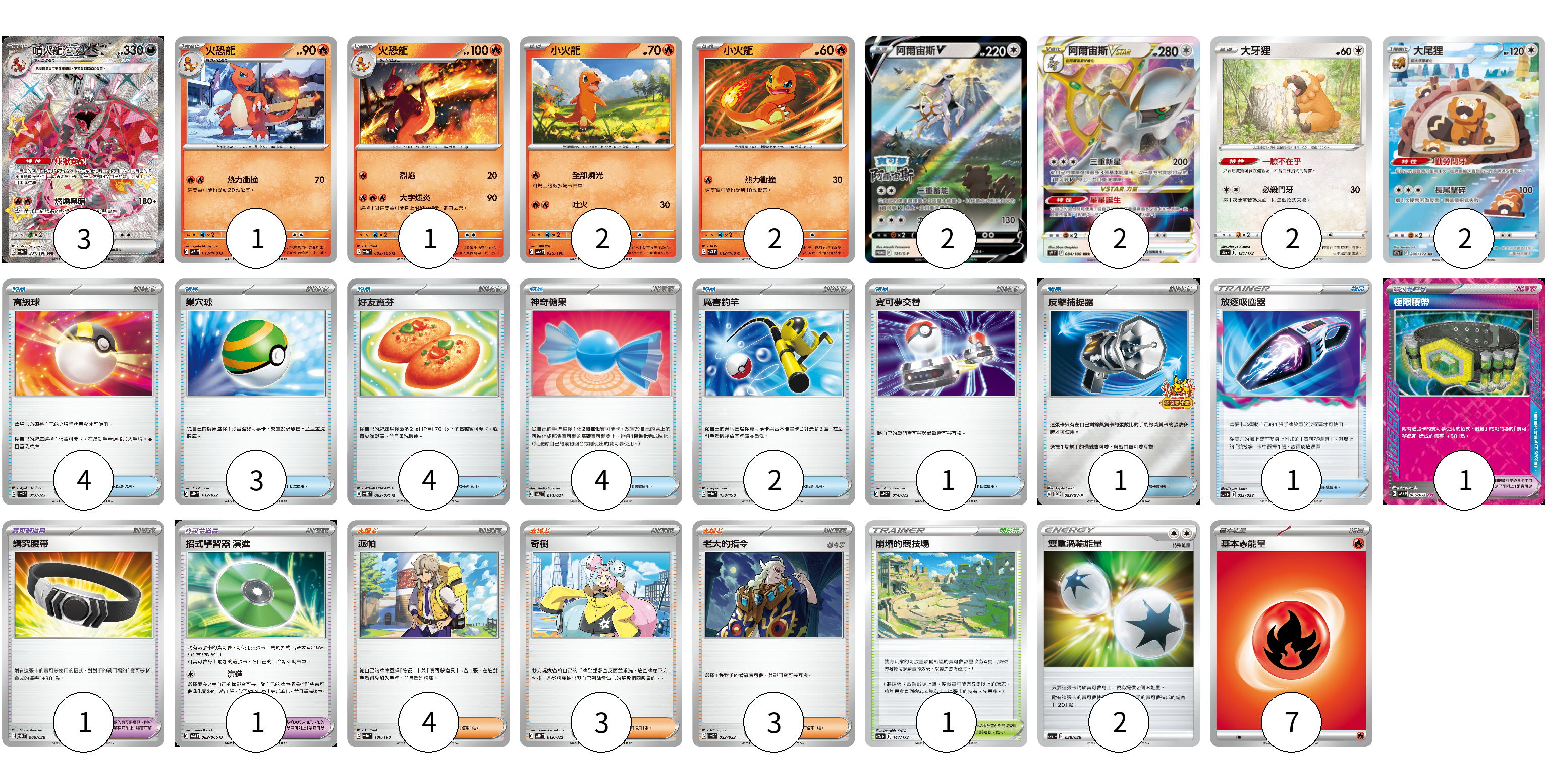 牌組構築方案 以此牌組為基礎新構築牌組 顯示卡面 顯示列表 寶可夢卡(17) 3 1 1 2 2 2 2 2 2 寶可夢道具(3) 1 1 1 物品卡(20) 4 3 4 4 2 1 1 1 支援者卡(10) 4 3 3 競技場卡(1) 1 能量卡(9) 2 7 寶可夢卡(17) 卡牌名稱 張數 卡牌名稱 張數 噴火龍ex SV4a 331/190 03 火恐龍 SV3 013/108 01 火恐龍 SV2a 005/165 01 小火龍 SV4a 025/190 02 小火龍 SV3 012/108 02 阿爾宙斯V S-P 125/S-P 02 阿爾宙斯VSTAR S9 084/100 02 大牙狸 S12a 121/172 02 大尾狸 S12a 200/172 02 寶可夢道具(3) 卡牌名稱 張數 卡牌名稱 張數 極限腰帶 SV5K 066/071 01 講究腰帶 SVB 006/028 01 招式學習器 演進 SV4M 063/066 01 物品卡(20) 卡牌名稱 張數 卡牌名稱 張數 高級球 SVHK 013/022 04 巢穴球 SVHK 012/022 03 好友寶芬 SV5K 063/071 04 神奇糖果 SVAL 014/021 04 厲害釣竿 SV4a 158/190 02 寶可夢交替 SVHK 014/022 01 反擊捕捉器 SV-P 083/SV-P 01 放逐吸塵器 SVF 023/038 01 支援者卡(10) 卡牌名稱 張數 卡牌名稱 張數 派帕 SV4a 180/190 04 奇樹 SVHK 019/022 03 老大的指令 SVHK 022/022 03 競技場卡(1) 卡牌名稱 張數 卡牌名稱 張數 崩塌的競技場 S12a 167/172 01 能量卡(9) 卡牌名稱 張數 卡牌名稱 張數 雙重渦輪能量 SVB 028/028 02 基本火能量 sv-p FIR 07 以此牌組為基礎新構築牌組 牌組編碼 YAcifn-FwGjaB-zrSAvW copy 列印牌組單 牌組編碼已複製 分享至SNS