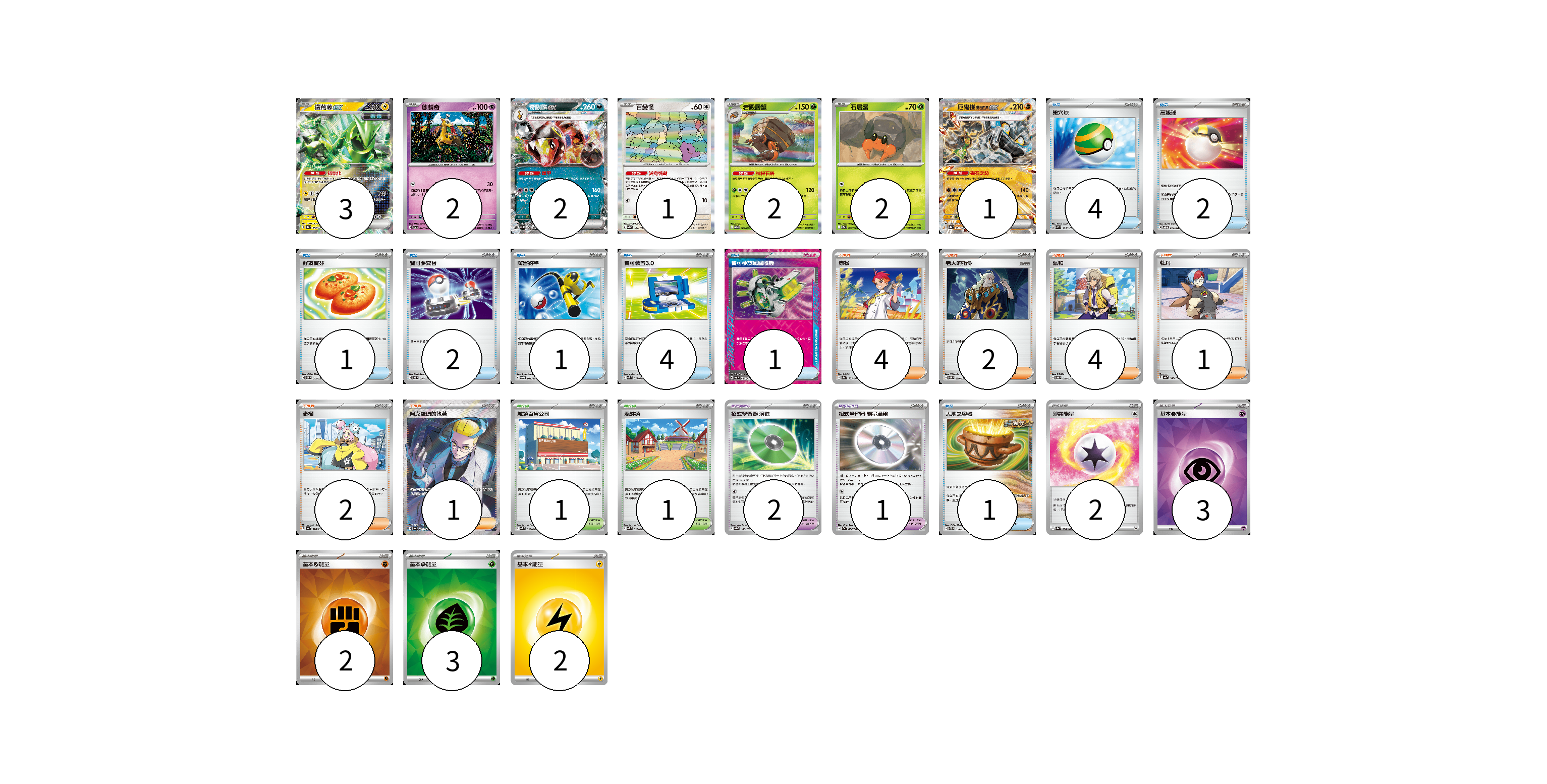 牌組構築方案 以此牌組為基礎新構築牌組 顯示卡面 顯示列表 寶可夢卡(13) 3 2 2 1 2 2 1 寶可夢道具(3) 2 1 物品卡(16) 4 2 1 2 1 4 1 1 支援者卡(14) 4 2 4 1 2 1 競技場卡(2) 1 1 能量卡(12) 2 3 2 3 2 寶可夢卡(13) 卡牌名稱 張數 卡牌名稱 張數 鐵荊棘ex SV8a 056/187 03 麒麟奇 SV5a 034/066 02 奇麒麟ex SV5M 042/071 02 百變怪 SV4a 144/190 01 岩殿居蟹 SV9a 008/063 02 石居蟹 SV9a 007/063 02 厄鬼椪 礎石面具ex SV8a 091/187 01 寶可夢道具(3) 卡牌名稱 張數 卡牌名稱 張數 招式學習器 演進 SV8a 160/187 02 招式學習器 能量渦輪 SV3a 056/062 01 物品卡(16) 卡牌名稱 張數 卡牌名稱 張數 巢穴球 SVM 133/175 04 高級球 SVOD 012/020 02 好友寶芬 SVOM 012/021 01 寶可夢交替 SVOD 014/020 02 厲害釣竿 SVOM 011/021 01 寶可裝置3.0 SVK 021/042 04 寶可夢旋風回收機 SV6 093/101 01 大地之容器 SVTG 010/019 01 支援者卡(14) 卡牌名稱 張數 卡牌名稱 張數 赤松 SV8a 163/187 04 老大的指令 SVOM 020/021 02 派帕 SVOD 018/020 04 牡丹 SV4a 182/190 01 奇樹 SV4a 174/190 02 阿克羅瑪的執著 SV6a 083/064 01 競技場卡(2) 卡牌名稱 張數 卡牌名稱 張數 城鎮百貨公司 SVK 037/042 01 深缽鎮 SVK 039/042 01 能量卡(12) 卡牌名稱 張數 卡牌名稱 張數 薄霧能量 SV8a 186/187 02 基本【超】能量 SVOD PSY 03 基本【鬥】能量 SVK FIG 02 基本【草】能量 SVK GRA 03 基本【雷】能量 SVHM LIG 02 以此牌組為基礎新構築牌組 牌組編碼 YAeUNm-rIvRdO-viufuf copy 列印牌組單 牌組編碼已複製 分享至SNS
