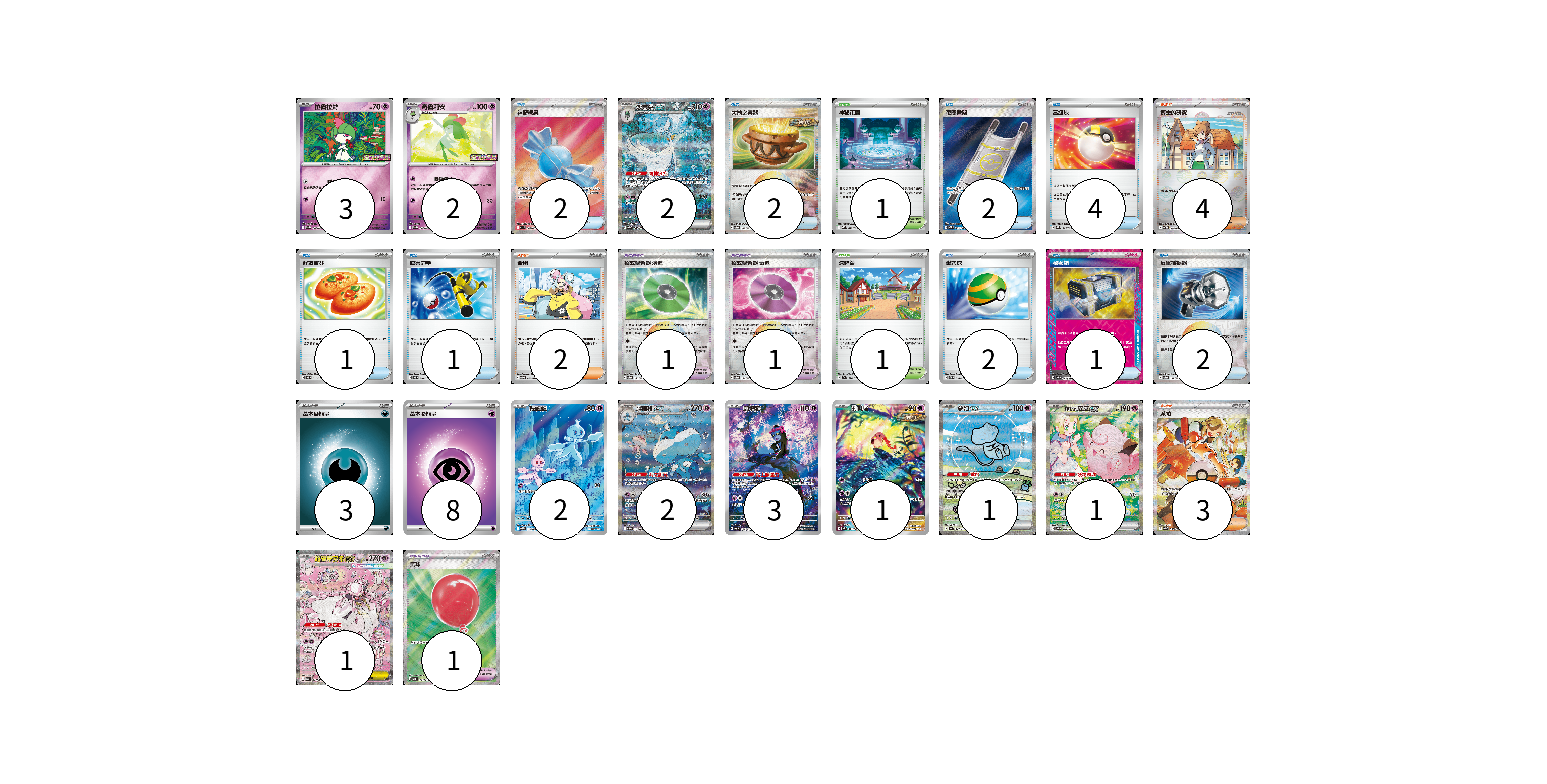牌組構築方案 以此牌組為基礎新構築牌組 顯示卡面 顯示列表 寶可夢卡(18) 3 2 2 2 2 3 1 1 1 1 寶可夢道具(3) 1 1 1 物品卡(17) 2 2 2 4 1 1 2 1 2 支援者卡(9) 4 2 3 競技場卡(2) 1 1 能量卡(11) 3 8 寶可夢卡(18) 卡牌名稱 張數 卡牌名稱 張數 拉魯拉絲 M-P 005/M-P 03 奇魯莉安 M-P 006/M-P 02 沙奈朵ex SV4a 348/190 02 輕飄飄 SV11W 124/086 02 胖嘟嘟ex SV11W 170/086 02 願增猿 SV6 107/101 03 吼叫尾 SV4K 071/066 01 夢幻ex SV4a 347/190 01 莉莉艾的皮皮ex SV9 126/100 01 超級蒂安希ex M2a 238/193 01 寶可夢道具(3) 卡牌名稱 張數 卡牌名稱 張數 招式學習器 演進 SV8a 160/187 01 招式學習器 衰退 SV8a 161/187 01 氣球 M1L 084/063 01 物品卡(17) 卡牌名稱 張數 卡牌名稱 張數 神奇糖果 M1S 082/063 02 大地之容器 SV8a 143/187 02 夜間擔架 M1L 083/063 02 高級球 SVQL 015/022 04 好友寶芬 SVOD 011/020 01 厲害釣竿 SVOD 010/020 01 巢穴球 SVTH 010/018 02 秘密箱 SV6 092/101 01 反擊捕捉器 SV8a 139/187 02 支援者卡(9) 卡牌名稱 張數 卡牌名稱 張數 博士的研究 SV11B 084/086 04 奇樹 SVOD 016/020 02 派帕 SV4a 353/190 03 競技場卡(2) 卡牌名稱 張數 卡牌名稱 張數 神秘花園 MBD 022/022 01 深缽鎮 SV1a 070/073 01 能量卡(11) 卡牌名稱 張數 卡牌名稱 張數 基本【惡】能量 M-P DAR 03 基本【超】能量 M-P PSY 08 以此牌組為基礎新構築牌組 牌組編碼 YBVyIM-lFlTHj-xgfKCd copy 列印牌組單 牌組編碼已複製 分享至SNS