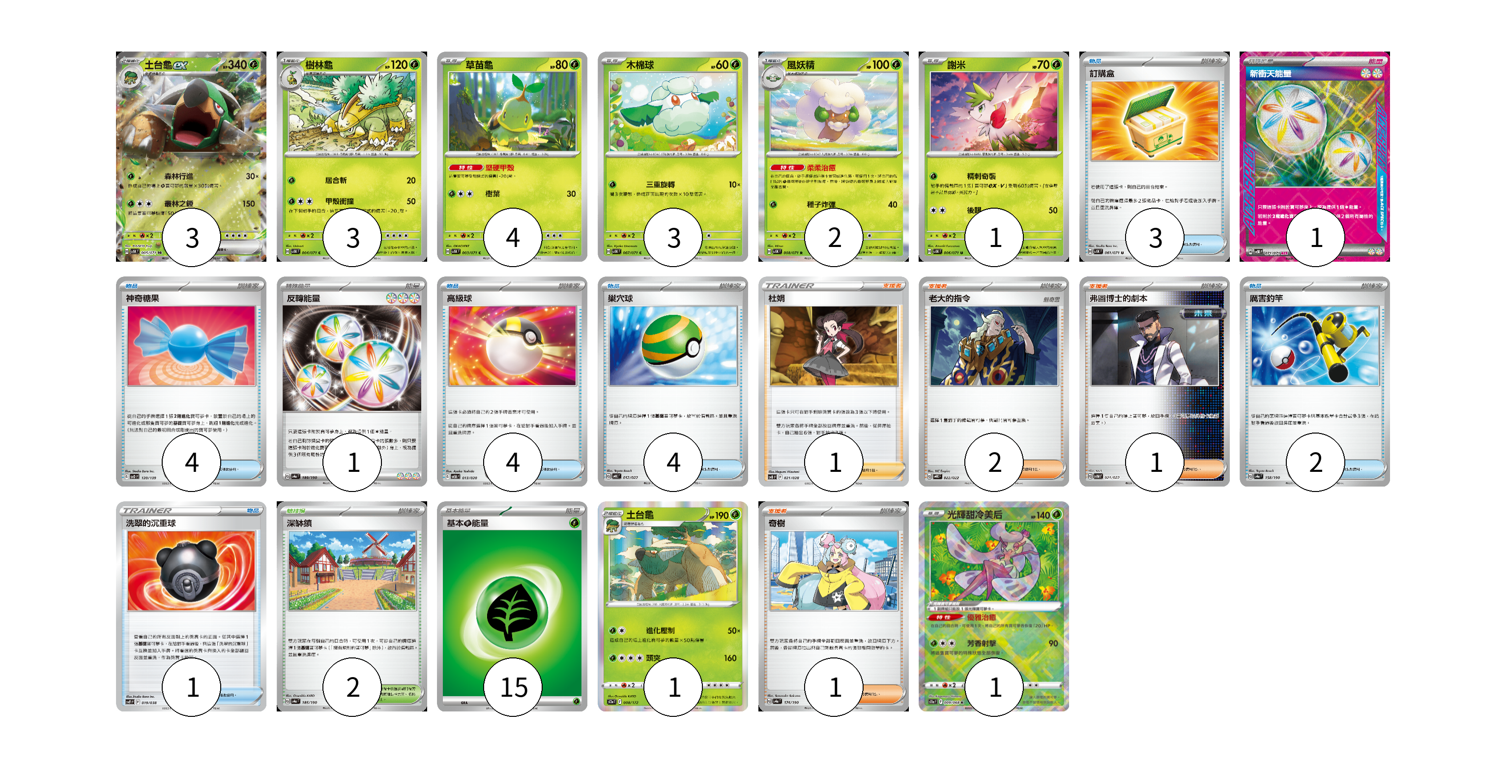 牌組構築方案 以此牌組為基礎新構築牌組 顯示卡面 顯示列表 寶可夢卡(18) 3 3 4 3 2 1 1 1 物品卡(18) 3 4 4 4 2 1 支援者卡(5) 1 2 1 1 競技場卡(2) 2 能量卡(17) 1 1 15 寶可夢卡(18) 卡牌名稱 張數 卡牌名稱 張數 土台龜ex SV5K 005/071 03 樹林龜 SV5K 004/071 03 草苗龜 SV5K 003/071 04 木棉球 SV5K 007/071 03 風妖精 SV5K 008/071 02 謝米 SV5K 006/071 01 土台龜 S12a 008/172 01 光輝甜冷美后 S11a 009/068 01 物品卡(18) 卡牌名稱 張數 卡牌名稱 張數 訂購盒 SV5K 061/071 03 神奇糖果 SVD 120/139 04 高級球 SVEM 013/020 04 巢穴球 SVHK 012/022 04 厲害釣竿 SV4a 158/190 02 洗翠的沉重球 SVF 019/038 01 支援者卡(5) 卡牌名稱 張數 卡牌名稱 張數 杜娟 SVB 021/028 01 老大的指令 SVHK 022/022 02 弗圖博士的劇本 SVHM 021/022 01 奇樹 SV4a 174/190 01 競技場卡(2) 卡牌名稱 張數 卡牌名稱 張數 深缽鎮 SV4a 185/190 02 能量卡(17) 卡牌名稱 張數 卡牌名稱 張數 新衝天能量 SV5K 071/071 01 反轉能量 SV4a 189/190 01 基本【草】能量 SVF GRA 15 以此牌組為基礎新構築牌組 牌組編碼 YBxHrF-cdKguV-PwjNwN copy 列印牌組單 牌組編碼已複製 分享至SNS