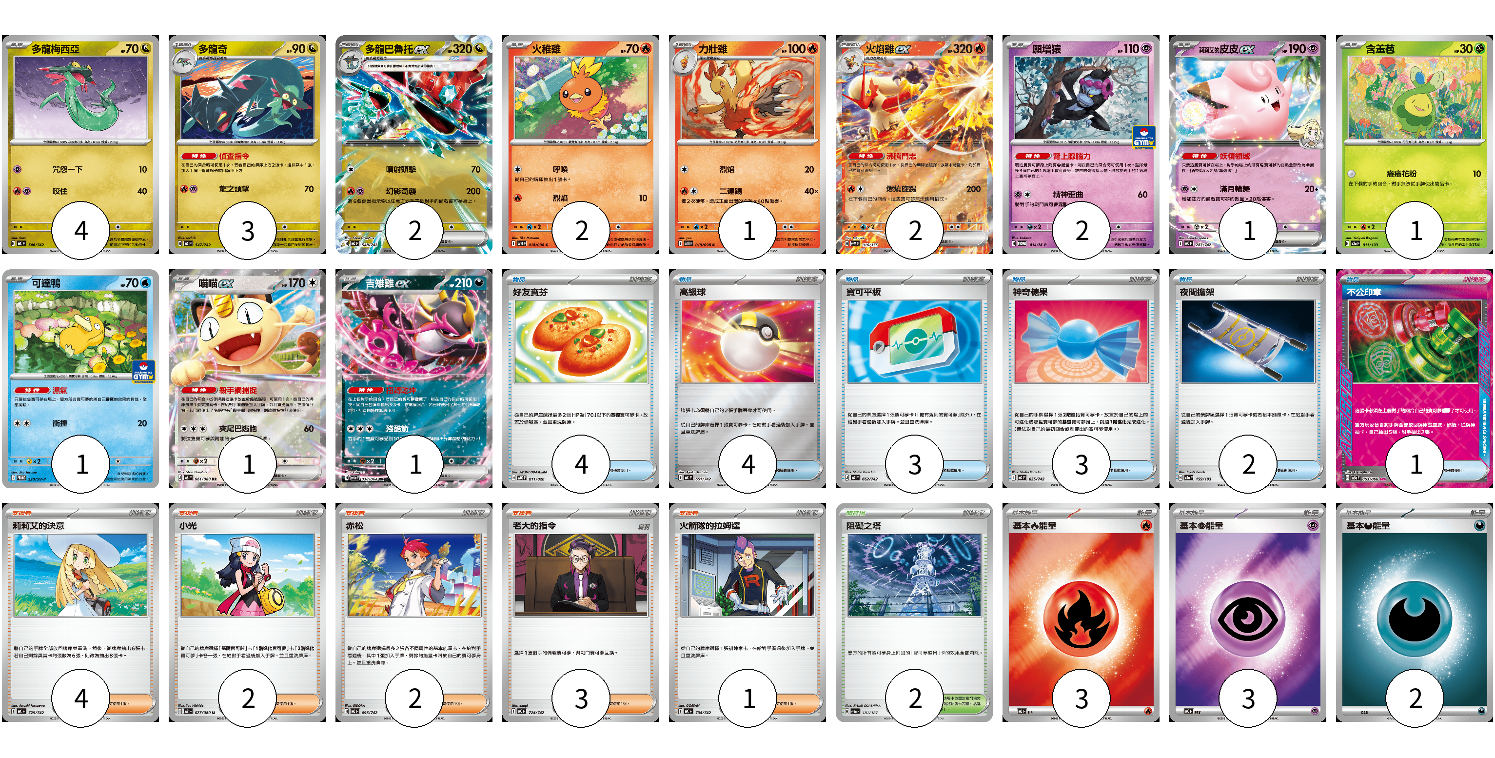 牌組構築方案 以此牌組為基礎新構築牌組 顯示卡面 顯示列表 寶可夢卡(21) 4 3 2 2 1 2 2 1 1 1 1 1 物品卡(17) 4 4 3 3 2 1 支援者卡(12) 4 2 2 3 1 競技場卡(2) 2 能量卡(8) 3 3 2 寶可夢卡(21) 卡牌名稱 張數 卡牌名稱 張數 多龍梅西亞 MC 546/742 04 多龍奇 MC 547/742 03 多龍巴魯托ex MC 548/742 02 火稚雞 SV10 018/098 02 力壯雞 SV10 019/098 01 火焰雞ex SVM 016/175 02 願增猿 M-P 014/M-P 02 <莉莉艾的>皮皮ex MC 287/742 01 含羞苞 M2a 011/193 01 可達鴨 SV-P 220/SV-P 01 喵喵ex M3 061/080 01 吉雉雞ex SV6a 038/064 01 物品卡(17) 卡牌名稱 張數 卡牌名稱 張數 好友寶芬 SVOD 011/020 04 高級球 MC 651/742 04 寶可平板 MC 662/742 03 神奇糖果 MC 655/742 03 夜間擔架 M2a 159/193 02 不公印章 SV5a 053/066 01 支援者卡(12) 卡牌名稱 張數 卡牌名稱 張數 莉莉艾的決意 MC 729/742 04 小光 M2 077/080 02 赤松 MC 696/742 02 老大的指令 MC 724/742 03 火箭隊的拉姆達 MC 734/742 01 競技場卡(2) 卡牌名稱 張數 卡牌名稱 張數 阻礙之塔 SV8a 181/187 02 能量卡(8) 卡牌名稱 張數 卡牌名稱 張數 基本【火】能量 MC FIR 03 基本【超】能量 MC PSY 03 基本【惡】能量 MBG DAR 02 以此牌組為基礎新構築牌組 牌組編碼 YChjtN-fiWOWy-RfynaG copy 列印牌組單 牌組編碼已複製 分享至SNS