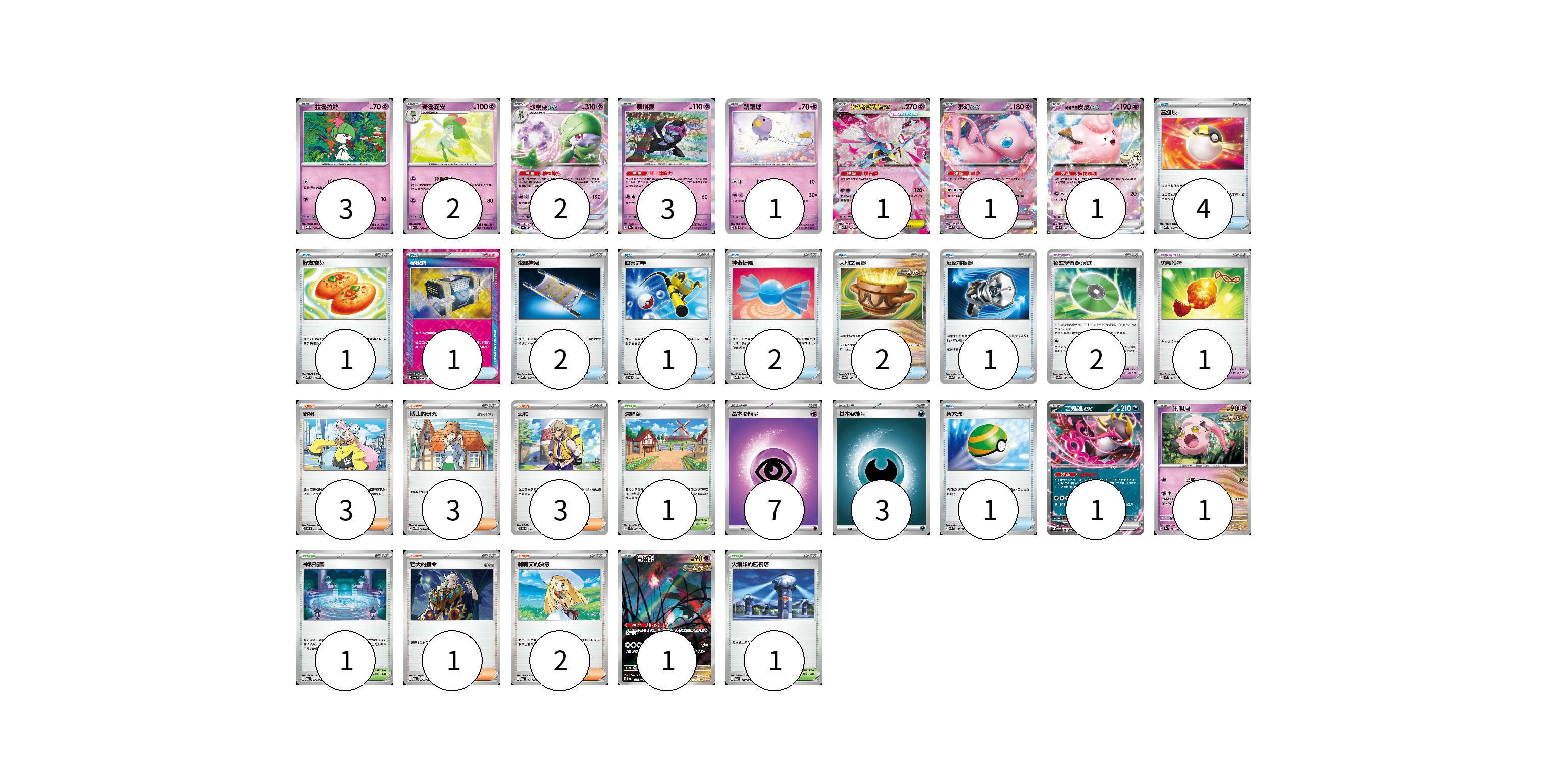 牌組構築方案 以此牌組為基礎新構築牌組 顯示卡面 顯示列表 寶可夢卡(17) 3 2 2 3 1 1 1 1 1 1 1 寶可夢道具(3) 2 1 物品卡(15) 4 1 1 2 1 2 2 1 1 支援者卡(12) 3 3 3 1 2 競技場卡(3) 1 1 1 能量卡(10) 7 3 寶可夢卡(17) 卡牌名稱 張數 卡牌名稱 張數 拉魯拉絲 M1S 040/063 03 奇魯莉安 M1S 041/063 02 沙奈朵ex SV4a 082/190 02 願增猿 SV8a 075/187 03 飄飄球 SVTS 005/022 01 超級蒂安希ex MBD 006/022 01 夢幻ex SVK 001/042 01 莉莉艾的皮皮ex SV9 033/100 01 吉雉雞ex SVOD 004/020 01 吼叫尾 SV8a 071/187 01 振翼髮 SV5K 076/071 01 寶可夢道具(3) 卡牌名稱 張數 卡牌名稱 張數 招式學習器 演進 SV8a 160/187 02 勇氣護符 SVM 142/175 01 物品卡(15) 卡牌名稱 張數 卡牌名稱 張數 高級球 MBD 014/022 04 好友寶芬 MBD 013/022 01 秘密箱 SV6 092/101 01 夜間擔架 MBD 016/022 02 厲害釣竿 SVOD 010/020 01 神奇糖果 MBG 013/022 02 大地之容器 SV8a 143/187 02 反擊捕捉器 SV8a 139/187 01 巢穴球 SVM 133/175 01 支援者卡(12) 卡牌名稱 張數 卡牌名稱 張數 奇樹 SVOD 016/020 03 博士的研究 SV11B 084/086 03 派帕 SVOD 018/020 03 老大的指令 MBD 020/022 01 莉莉艾的決意 MBD 021/022 02 競技場卡(3) 卡牌名稱 張數 卡牌名稱 張數 深缽鎮 SVK 039/042 01 神秘花園 MBD 022/022 01 火箭隊的監視塔 M2a 189/193 01 能量卡(10) 卡牌名稱 張數 卡牌名稱 張數 基本【超】能量 MBD PSY 07 基本【惡】能量 MBG DAR 03 以此牌組為基礎新構築牌組 牌組編碼 YDtDMu-gBShKH-LpMzYA copy 列印牌組單 牌組編碼已複製 分享至SNS