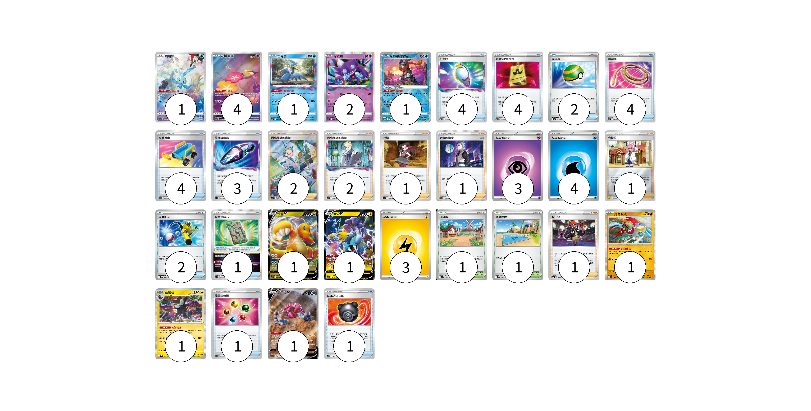 牌組構築方案 以此牌組為基礎新構築牌組 顯示卡面 顯示列表 寶可夢卡(14) 1 4 1 2 1 1 1 1 1 1 寶可夢道具(1) 1 物品卡(25) 4 4 2 4 4 3 2 1 1 支援者卡(8) 2 2 1 1 1 1 競技場卡(2) 1 1 能量卡(10) 3 4 3 寶可夢卡(14) 卡牌名稱 張數 卡牌名稱 張數 瑪納霏 S12a 178/172 01 花療環環 S12a 187/172 04 古月鳥 S11 033/100 01 勾魂眼 S11 044/100 02 光輝甲賀忍蛙 S12a 033/172 01 快龍V S7R 042/067 01 雷公V S12a 038/172 01 摔角鷹人 SV1S 045/078 01 倫琴貓 SV2D 021/071 01 龍王蠍V S12a 227/172 01 寶可夢道具(1) 卡牌名稱 張數 卡牌名稱 張數 森林封印石 S12 092/098 01 物品卡(25) 卡牌名稱 張數 卡牌名稱 張數 幻想門 S11 092/100 04 對戰VIP參加證 S8 091/100 04 巢穴球 SVAL 012/021 02 離洞繩 S5I 061/070 04 交替推車 S10D 060/067 04 放逐吸塵器 S11 093/100 03 厲害釣竿 SV2P 066/071 02 能量回收器 S5R 062/070 01 洗翠的沉重球 S12a 140/172 01 支援者卡(8) 卡牌名稱 張數 卡牌名稱 張數 阿克羅瑪的實驗 S12a 235/172 02 阿克羅瑪的實驗 S11 095/100 02 杜娟 S9a 065/067 01 老大的指令(赤日) S9 097/100 01 克拉拉 SPZ 014/020 01 奇巴納 S12a 151/172 01 競技場卡(2) 卡牌名稱 張數 卡牌名稱 張數 深缽鎮 SV1a 070/073 01 海灘場地 SV1S 078/078 01 能量卡(10) 卡牌名稱 張數 卡牌名稱 張數 基本超能量 sv-p PSY 03 基本水能量 sv-p WAT 04 基本雷能量 sv-p LIG 03 以此牌組為基礎新構築牌組 牌組編碼 YEEtaN-nXzVSa-SfCQDE copy 列印牌組單 牌組編碼已複製 分享至SNS