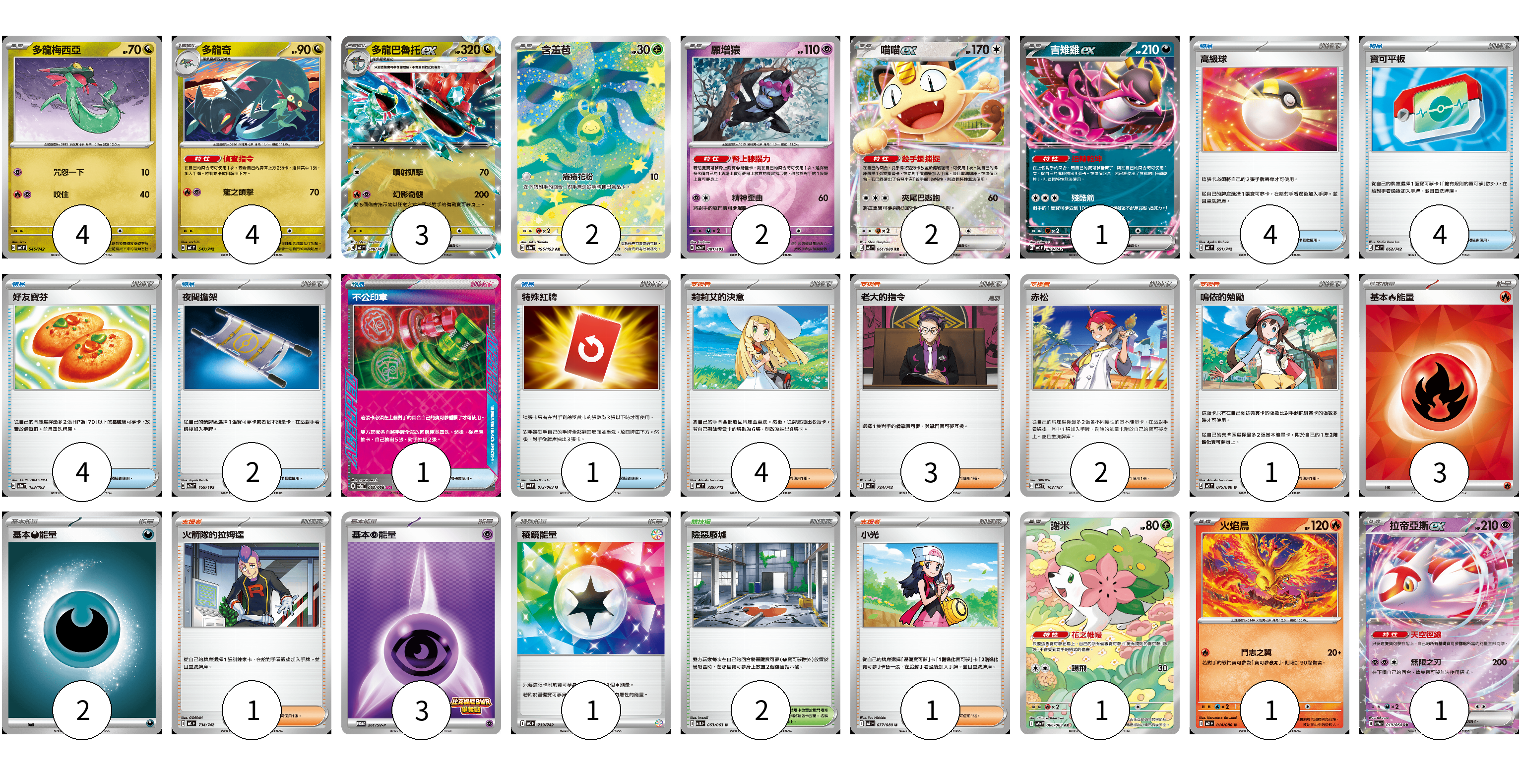 牌組構築方案 以此牌組為基礎新構築牌組 顯示卡面 顯示列表 寶可夢卡(21) 4 4 3 2 2 2 1 1 1 1 物品卡(16) 4 4 4 2 1 1 支援者卡(12) 4 3 2 1 1 1 競技場卡(2) 2 能量卡(9) 3 2 3 1 寶可夢卡(21) 卡牌名稱 張數 卡牌名稱 張數 多龍梅西亞 MC 546/742 04 多龍奇 MC 547/742 04 多龍巴魯托ex MC 548/742 03 含羞苞 M2a 196/193 02 願增猿 M2a 081/193 02 喵喵ex M3 061/080 02 吉雉雞ex MC 489/742 01 謝米 SV9a 066/063 01 火焰鳥 M2 014/080 01 拉帝亞斯ex SV7a 019/064 01 物品卡(16) 卡牌名稱 張數 卡牌名稱 張數 高級球 MC 651/742 04 寶可平板 MC 662/742 04 好友寶芬 M2a 153/193 04 夜間擔架 M2a 159/193 02 不公印章 SV5a 053/066 01 特殊紅牌 M4 072/083 01 支援者卡(12) 卡牌名稱 張數 卡牌名稱 張數 莉莉艾的決意 MC 729/742 04 老大的指令 MC 724/742 03 赤松 SV8a 163/187 02 鳴依的勉勵 M3 075/080 01 火箭隊的拉姆達 MC 734/742 01 小光 M2 077/080 01 競技場卡(2) 卡牌名稱 張數 卡牌名稱 張數 險惡廢墟 M1L 063/063 02 能量卡(9) 卡牌名稱 張數 卡牌名稱 張數 基本【火】能量 SVQL FIR 03 基本【惡】能量 MC DAR 02 基本【超】能量 SV-P 261/SV-P 03 稜鏡能量 MC 739/742 01 以此牌組為基礎新構築牌組 牌組編碼 YEkPNZ-FZrzDg-ARjNwY copy 列印牌組單 牌組編碼已複製 分享至SNS