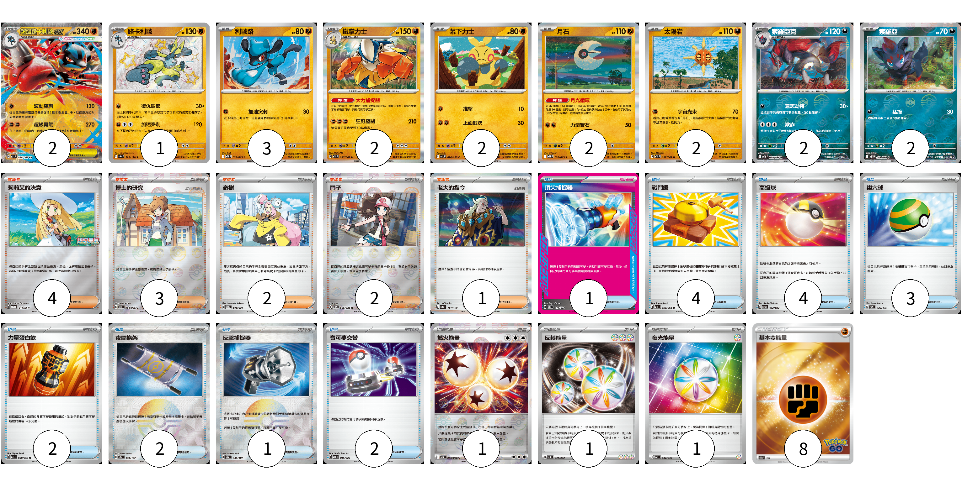 牌組構築方案 以此牌組為基礎新構築牌組 顯示卡面 顯示列表 寶可夢卡(18) 2 1 3 2 2 2 2 2 2 物品卡(19) 1 4 4 3 2 2 1 2 支援者卡(12) 4 3 2 2 1 能量卡(11) 1 1 1 8 寶可夢卡(18) 卡牌名稱 張數 卡牌名稱 張數 超級路卡利歐ex M1L 029/063 02 路卡利歐 SV4a 281/190 01 利歐路 M1L 028/063 03 鐵掌力士 M1L 025/063 02 幕下力士 M1L 024/063 02 月石 M1L 026/063 02 太陽岩 M1L 027/063 02 索羅亞克 SV11W 059/086 02 索羅亞 SV11W 058/086 02 物品卡(19) 卡牌名稱 張數 卡牌名稱 張數 頂尖捕捉器 MBG 014/022 01 戰鬥鑼 M1L 059/063 04 高級球 MBG 012/022 04 巢穴球 SVM 133/175 03 力量蛋白飲 M1L 058/063 02 夜間擔架 SV8a 151/187 02 反擊捕捉器 SV8a 139/187 01 寶可夢交替 MBG 015/022 02 支援者卡(12) 卡牌名稱 張數 卡牌名稱 張數 莉莉艾的決意 M-P 011/M-P 04 博士的研究 SV11B 084/086 03 奇樹 SVOM 018/021 02 鬥子 SV11W 085/086 02 老大的指令 SV4a 181/190 01 能量卡(11) 卡牌名稱 張數 卡牌名稱 張數 燃火能量 SV11W 086/086 01 反轉能量 SVK 041/042 01 夜光能量 SVK 042/042 01 基本鬥能量 S10b FIG 08 以此牌組為基礎新構築牌組 牌組編碼 YGiBXh-yVbYPO-kRWiMx copy 列印牌組單 牌組編碼已複製 分享至SNS