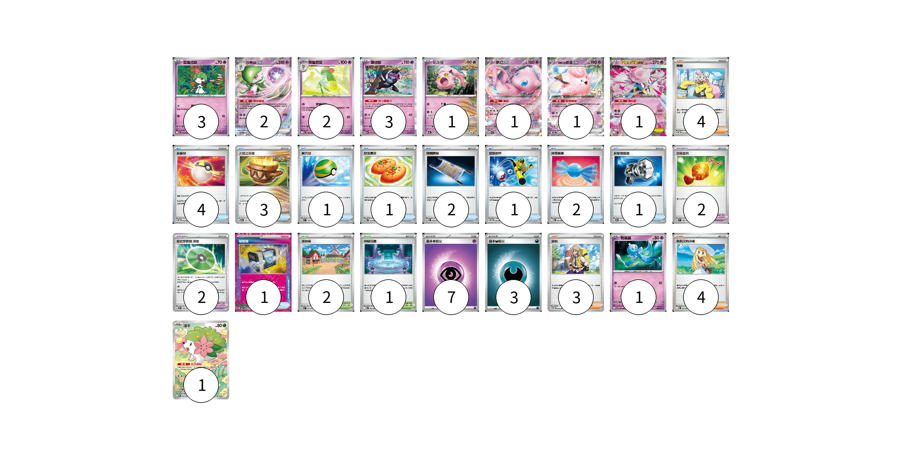 牌組構築方案 以此牌組為基礎新構築牌組 顯示卡面 顯示列表 寶可夢卡(16) 3 2 2 3 1 1 1 1 1 1 寶可夢道具(4) 2 2 物品卡(16) 4 3 1 1 2 1 2 1 1 支援者卡(11) 4 3 4 競技場卡(3) 2 1 能量卡(10) 7 3 寶可夢卡(16) 卡牌名稱 張數 卡牌名稱 張數 拉魯拉絲 M1S 040/063 03 沙奈朵ex SVTS 004/022 02 奇魯莉安 M1S 041/063 02 願增猿 SV8a 075/187 03 吼叫尾 SV4K 032/066 01 夢幻ex SV4a 076/190 01 莉莉艾的皮皮ex SV9 033/100 01 超級蒂安希ex MBD 006/022 01 輕飄飄 SV11W 041/086 01 謝米 SV9a 066/063 01 寶可夢道具(4) 卡牌名稱 張數 卡牌名稱 張數 勇氣護符 SVM 142/175 02 招式學習器 演進 SV8a 160/187 02 物品卡(16) 卡牌名稱 張數 卡牌名稱 張數 高級球 SVOD 012/020 04 大地之容器 SV8a 143/187 03 巢穴球 SVM 133/175 01 好友寶芬 MBD 013/022 01 夜間擔架 MBD 016/022 02 厲害釣竿 SVOD 010/020 01 神奇糖果 MBG 013/022 02 反擊捕捉器 SV8a 139/187 01 秘密箱 SV6 092/101 01 支援者卡(11) 卡牌名稱 張數 卡牌名稱 張數 奇樹 SVOD 016/020 04 派帕 SVOD 018/020 03 莉莉艾的決意 MBD 021/022 04 競技場卡(3) 卡牌名稱 張數 卡牌名稱 張數 深缽鎮 SVK 039/042 02 神秘花園 MBD 022/022 01 能量卡(10) 卡牌名稱 張數 卡牌名稱 張數 基本【超】能量 MBD PSY 07 基本【惡】能量 MBG DAR 03 以此牌組為基礎新構築牌組 牌組編碼 YICepX-KDldyX-mTEiQj copy 列印牌組單 牌組編碼已複製 分享至SNS